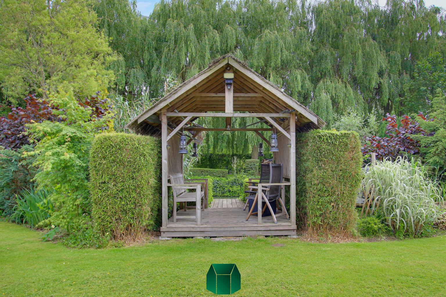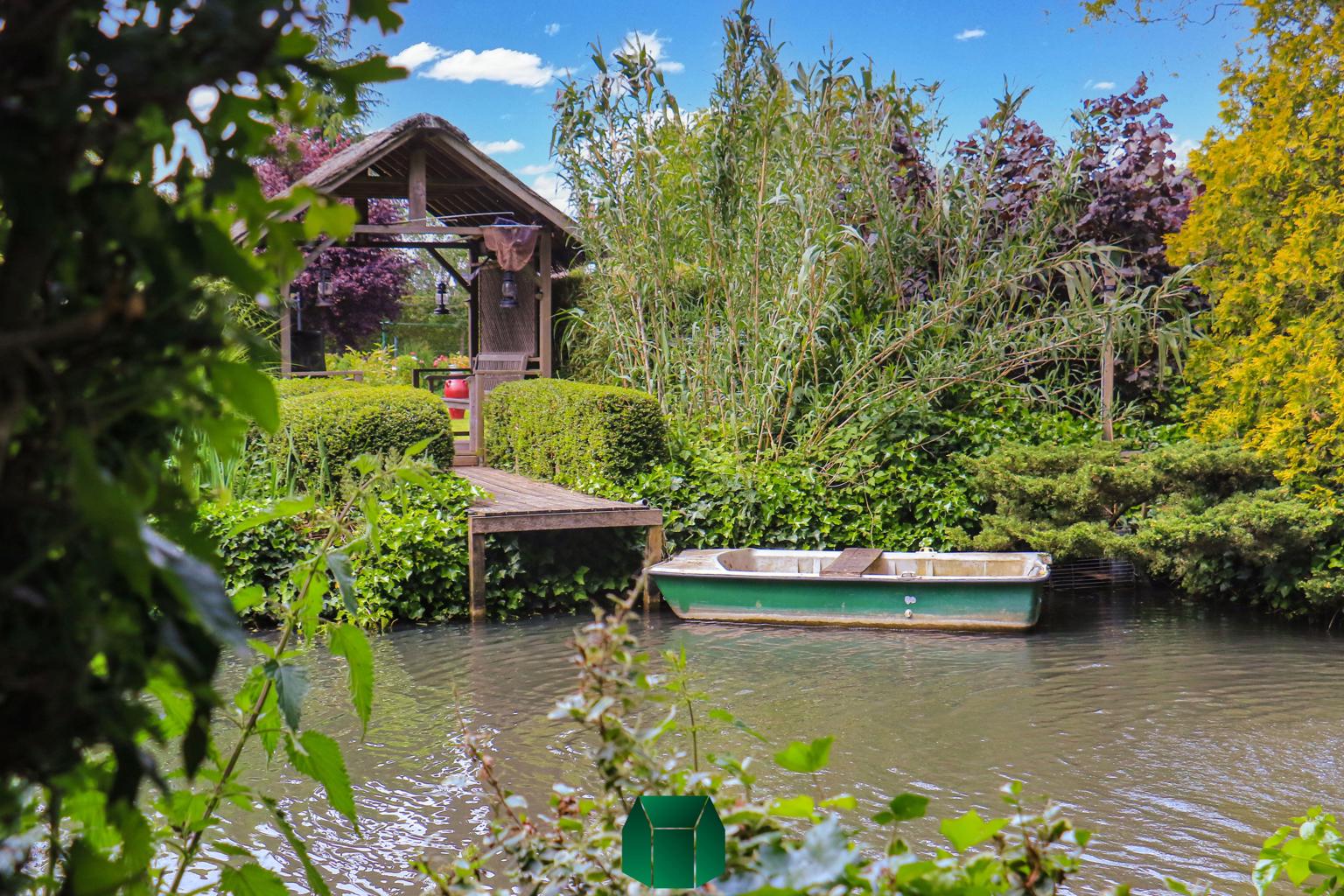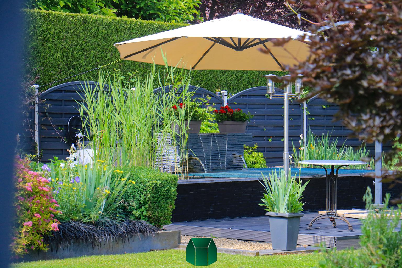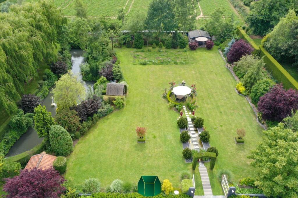 Grand jardin avec un étang et plusieurs petites fontaines ainsi qu’une terrasse et une cour carrée avec un accès rue.