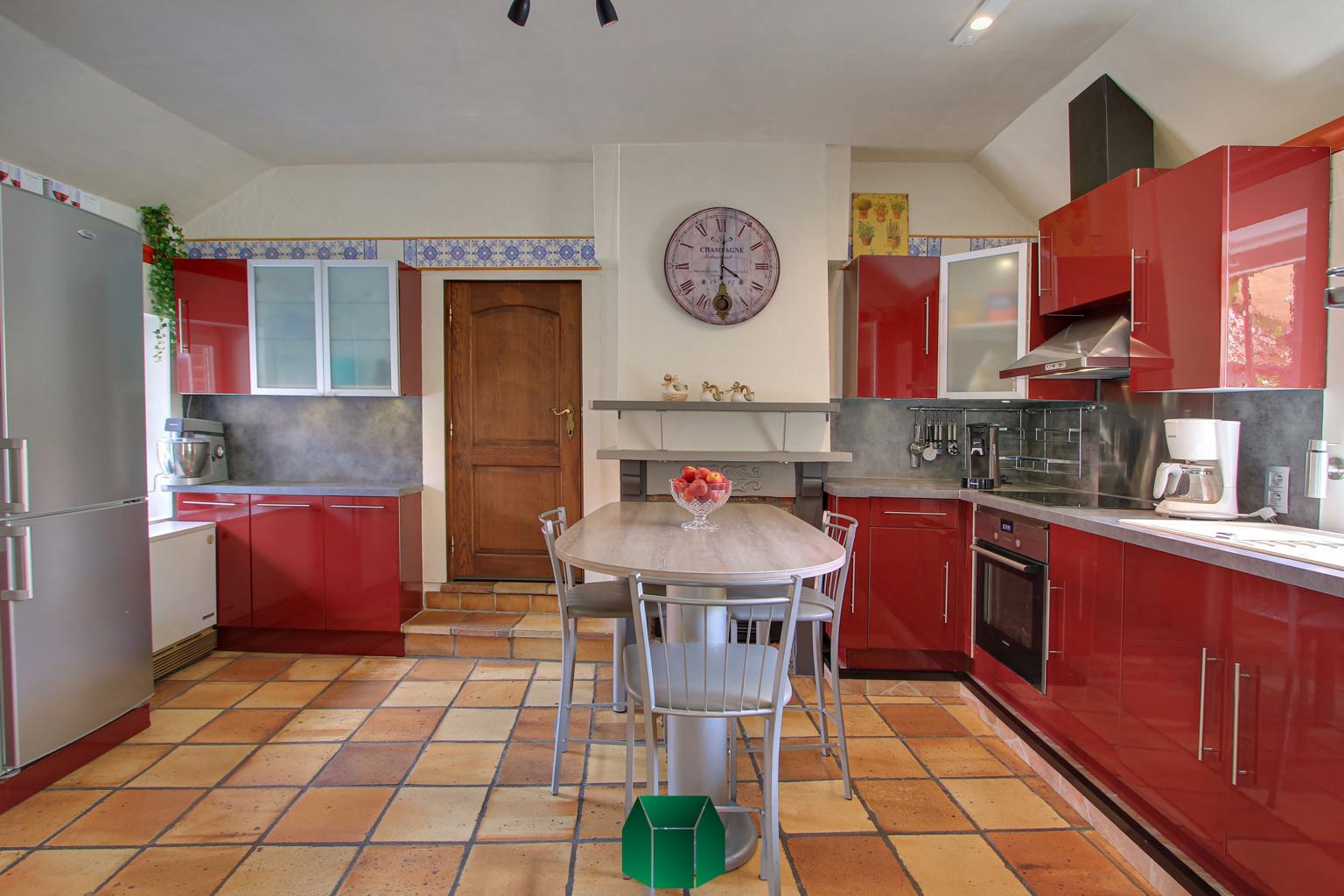 La partie habitation débute sur un hall d’entrée avec un bureau, une salle de bain et une toilette. Elle se prolonge sur un séjour avec insert, une cuisine équipée, une arrière cuisine et une buanderie.