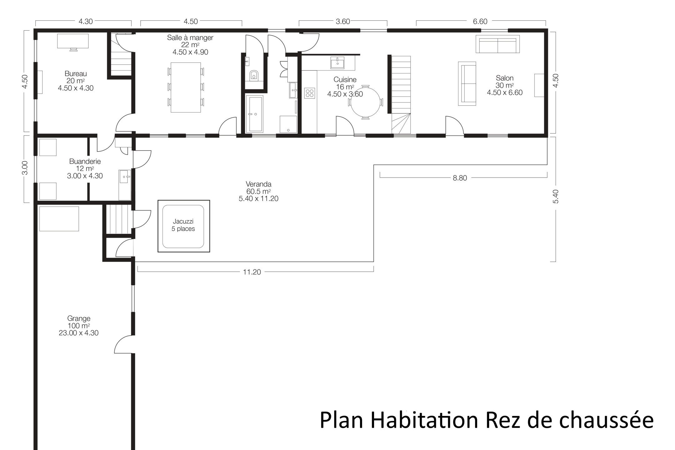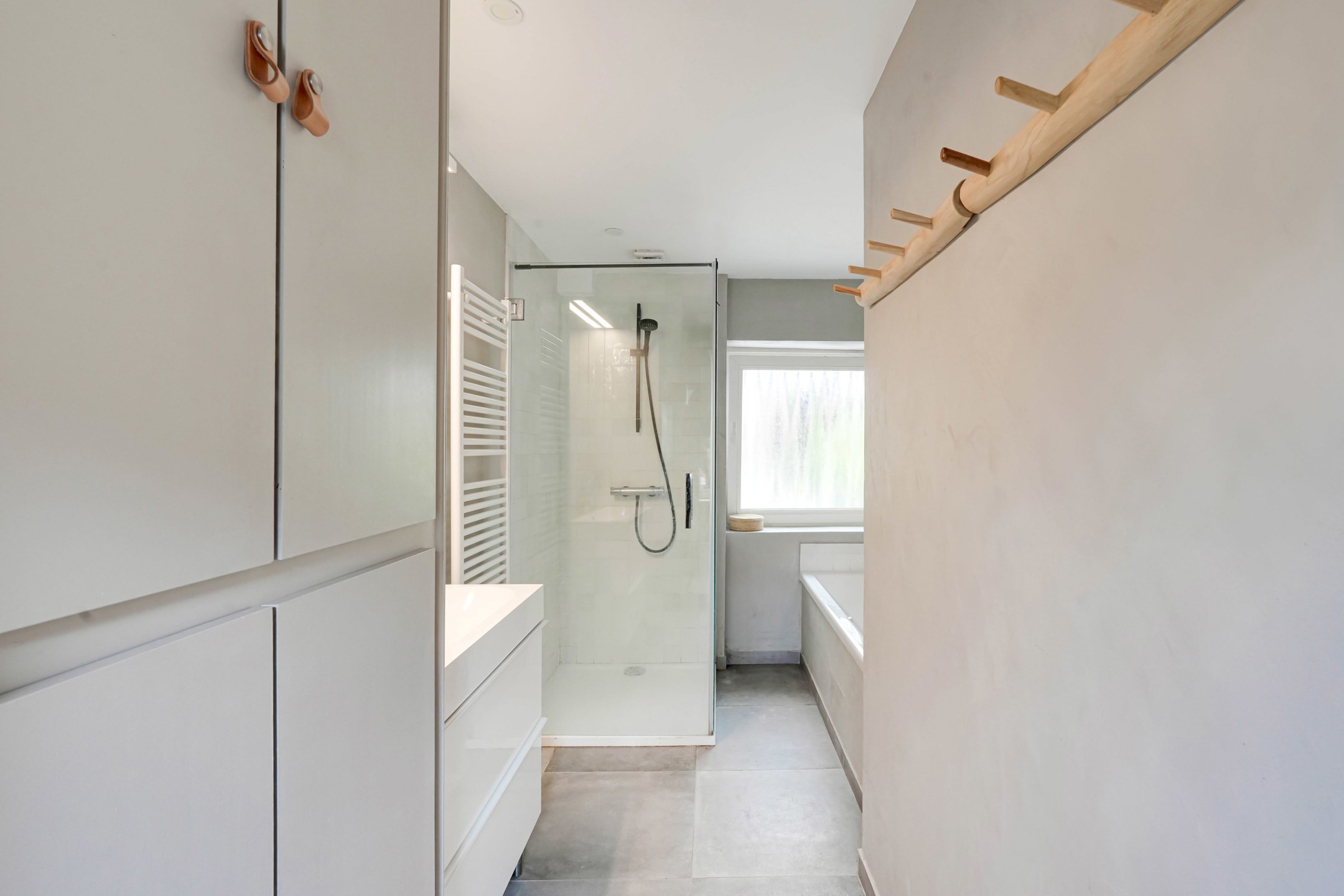 Rez de chaussée de l’habitation : Salon avec insert à bois, cuisine équipée (électro Siemens), bureau, salle de bain (avec baignoire et douche), buanderie. Cave.