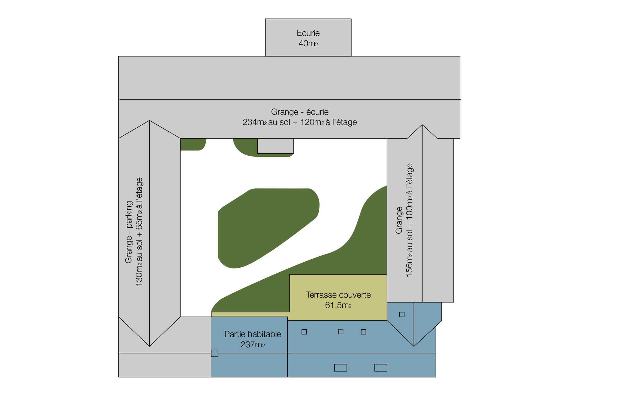Aile nord : 156m² au sol et 100m² à l’étage.Extérieurs : Cour intérieure avec terrasse abritée de 60m², jardin de plus de 4000m² avec étang, verger, prairie et vue dégagée sur les champs (exposition sud-ouest), abri pour animaux de 40m².