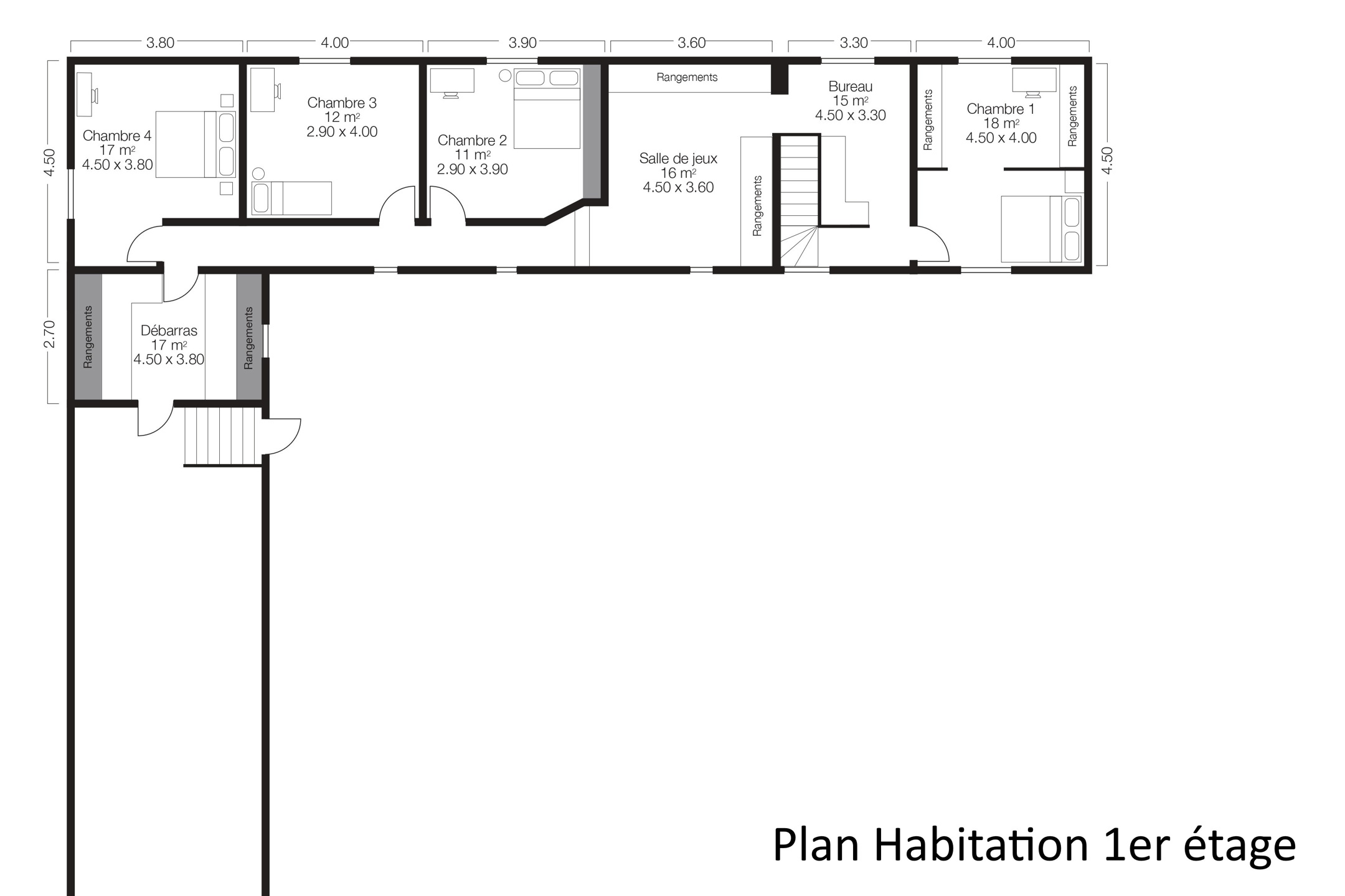 L’étage se compose de 4 chambres (11, 12 , 17 et 18m²), d’une salle de jeu, d’un bureau et d’un débarras.