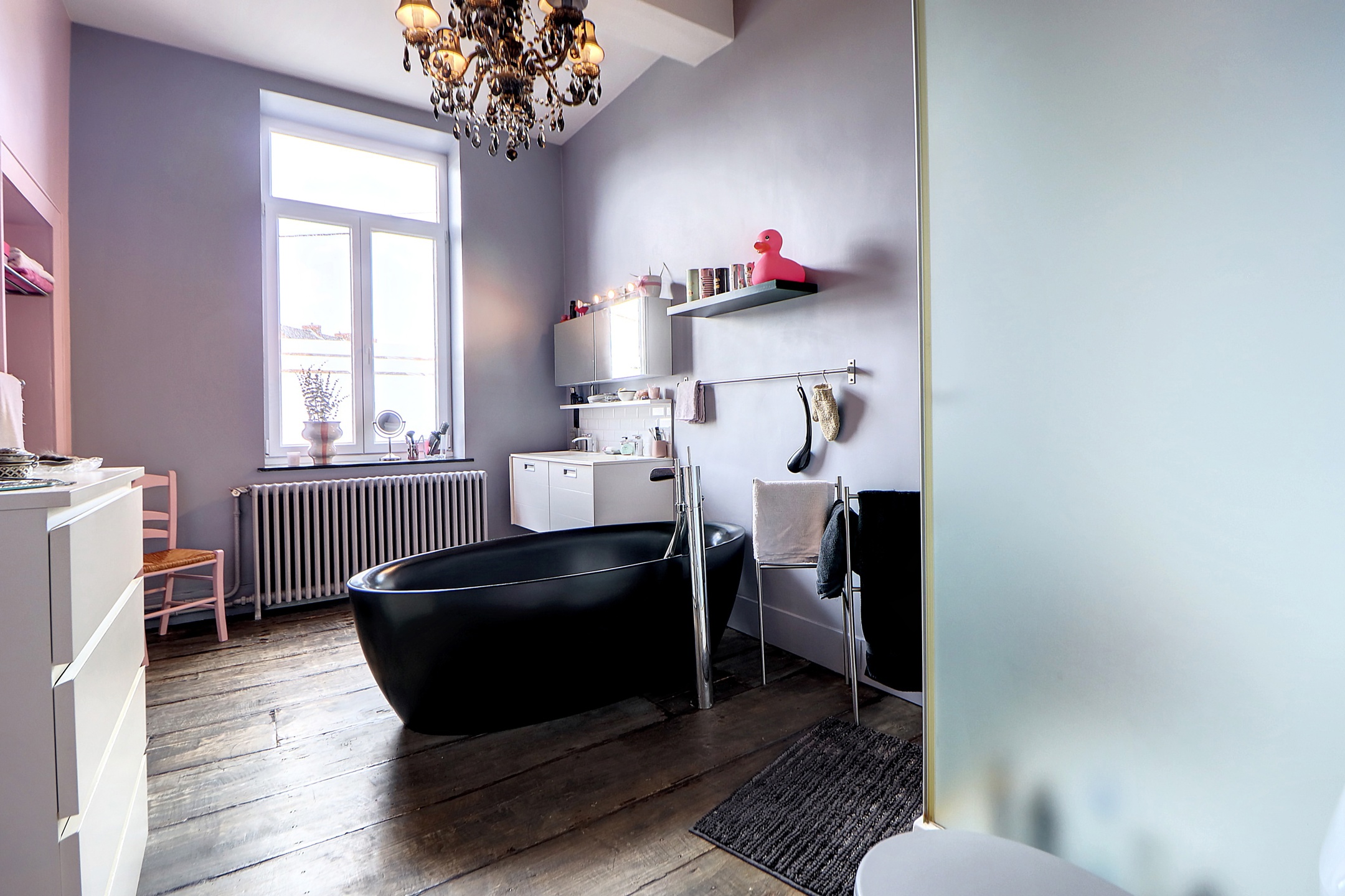 1er étage : On y retrouve les espaces de vie comprenant un séjour de 50 m² avec accès à une seconde terrasse, une cuisine équipée et un coin repas, un hall de nuit dessert deux chambres de 14 m² et 10 m², une salle de bain composée d’une douche, d’une baignoire îlot, d’un meuble vasque et d’un WC.