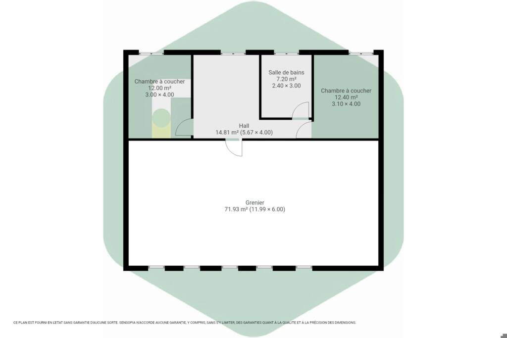 2ème étage : Ce niveau comprend 2 chambres de 12 m² avec salle de bain privative, un espace de rangement ainsi qu’un grenier de 72 m².