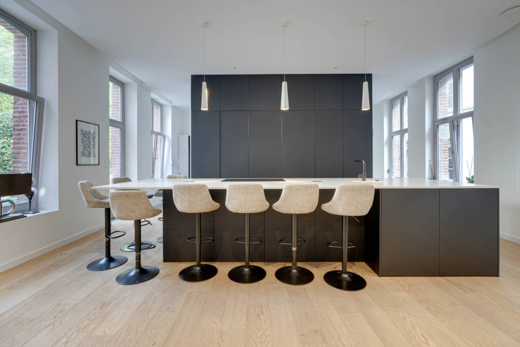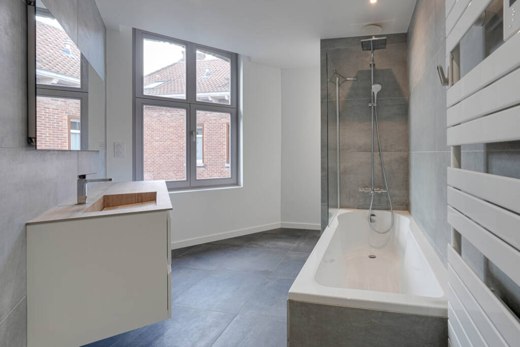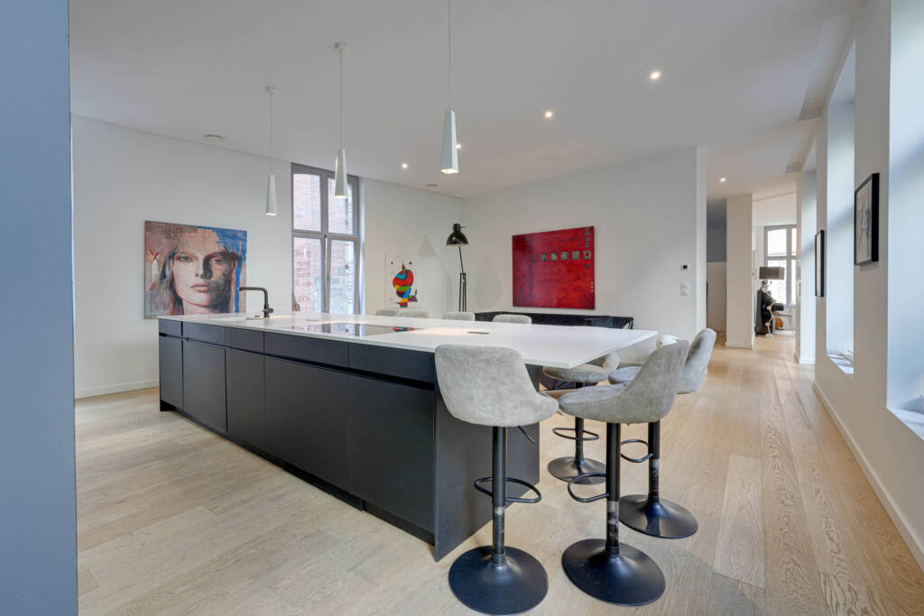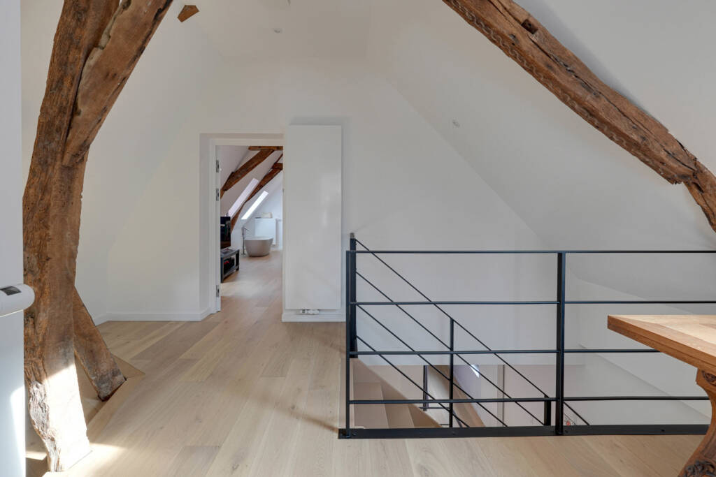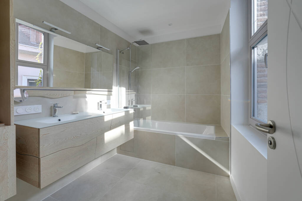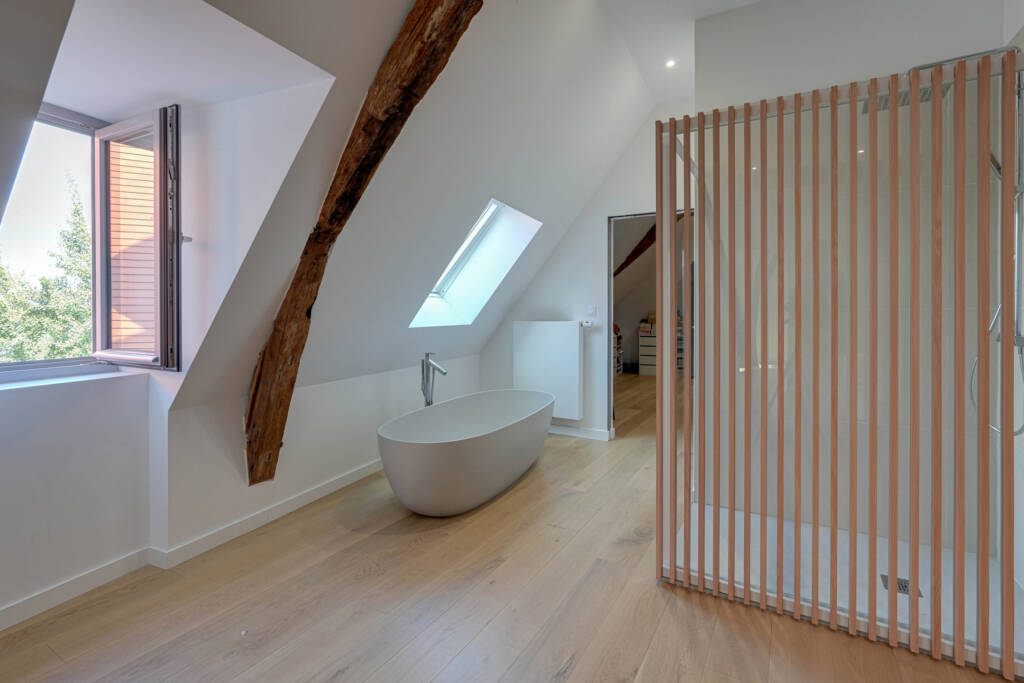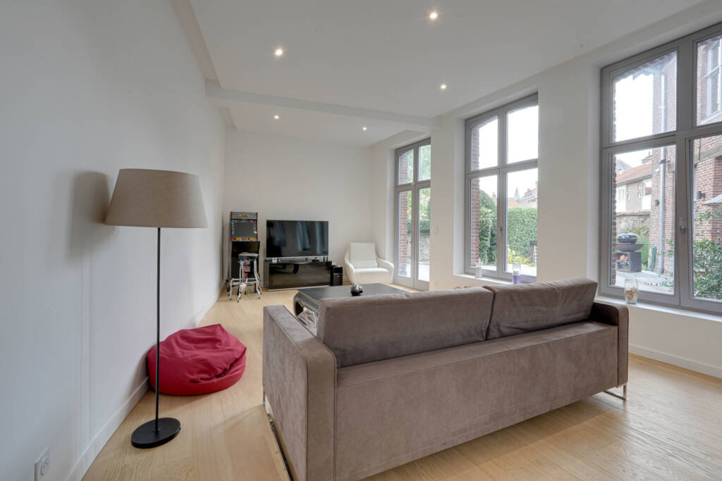 Caractéristiques : Rénovation complète du bâtiment en 2021, châssis en bois double vitrage, plancher chauffant (pompe à chaleur), parquets massifs, chauffe-eaux thermodynamiques, VMC double flux, domotique, vidéophone…