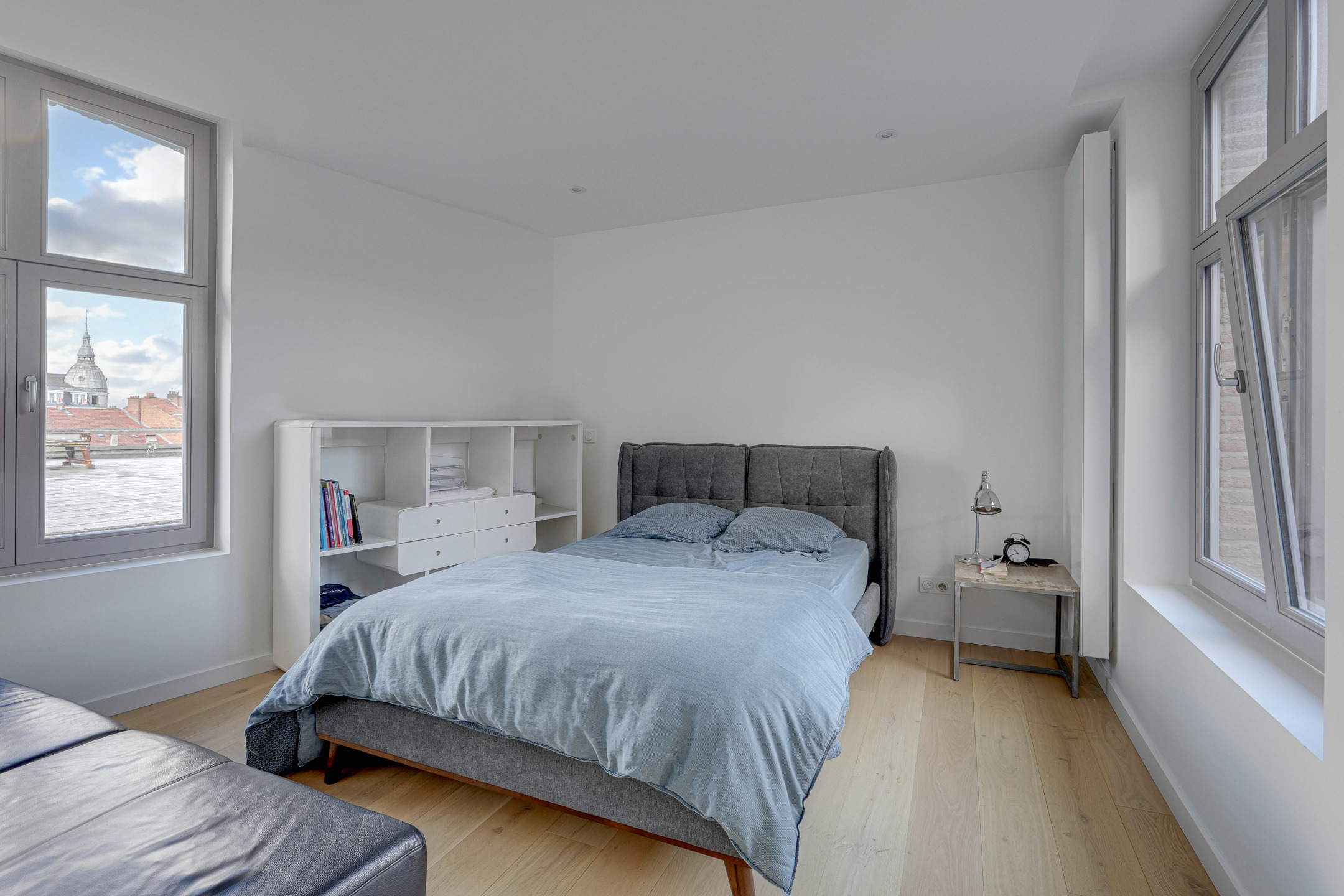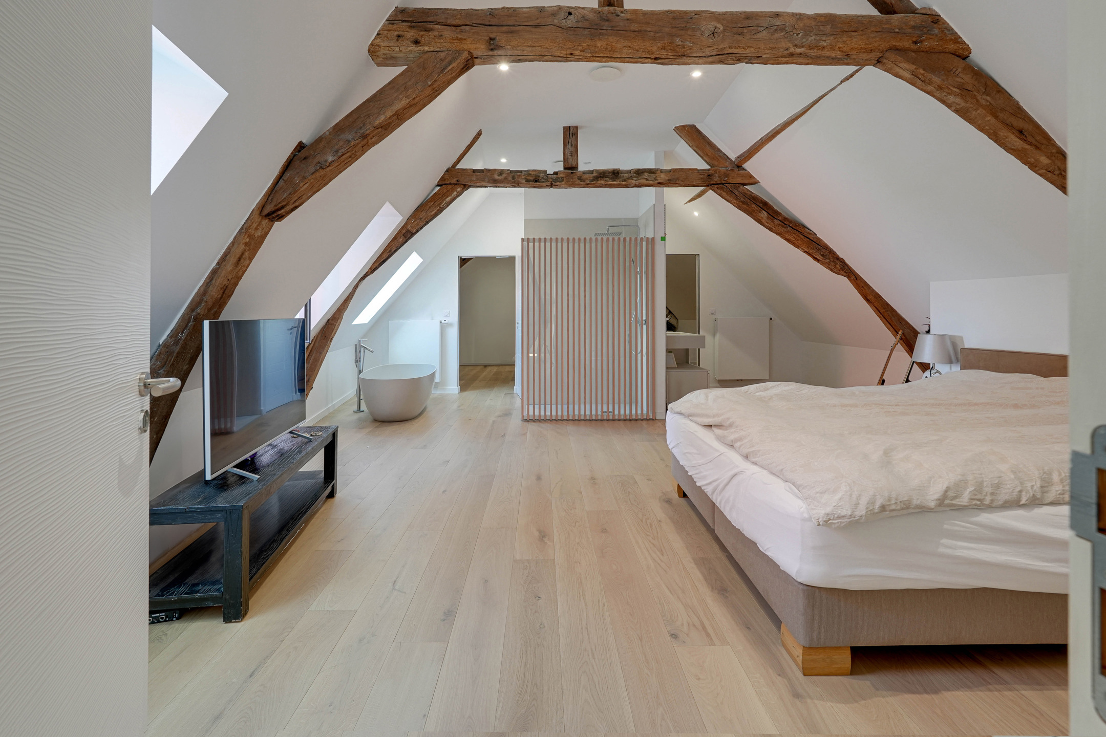 Le 2ᵉ étage possède d’un côté une suite parentale avec salle de bain et vaste dressing, et de l’autre, un bureau, une salle de sport, une chambre avec salle de bain.