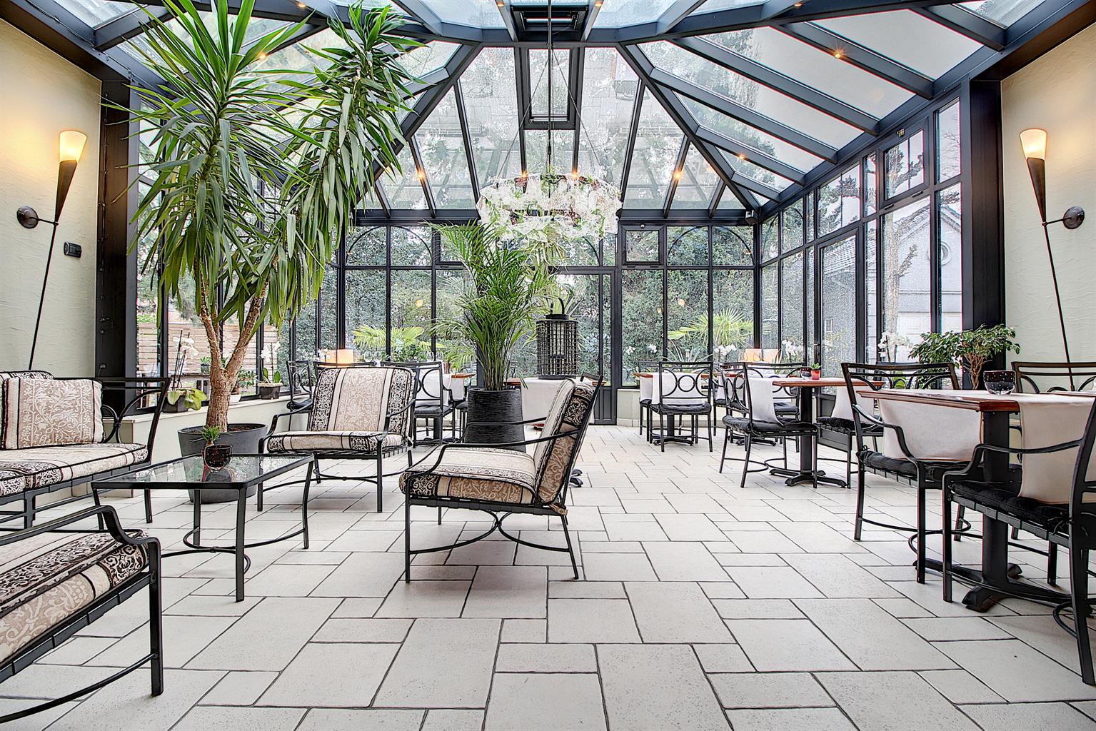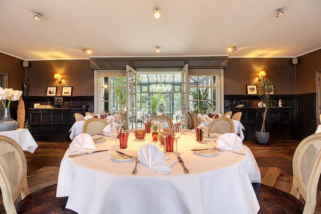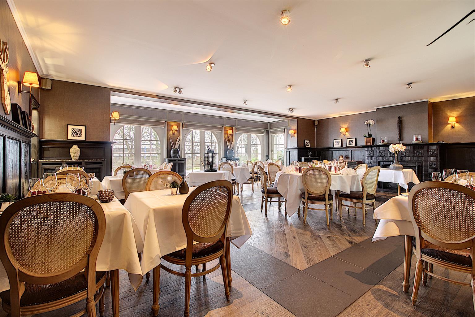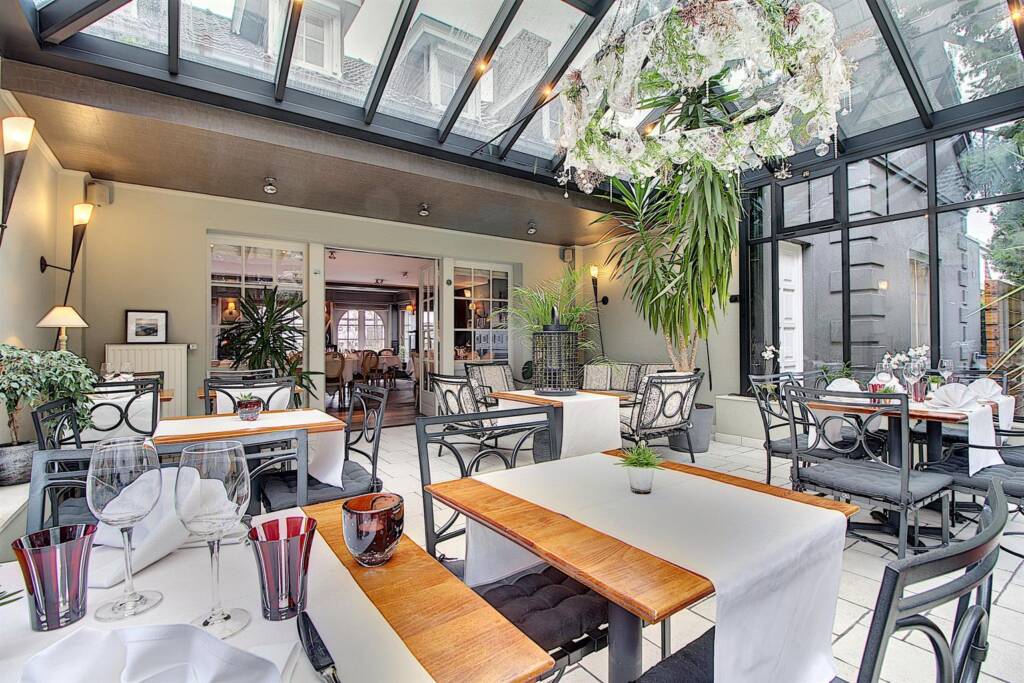 La salle de réception principale peut accueillir +/- 40 couverts ainsi qu’une imposante véranda considérée comme ‘orangerie’ pouvant accueillir +/- 30 couverts. Une terrasse vous permettra de manger en extérieur, au calme, dans un environnement bucolique. Vestiaire et toilettes clientèles prévues à l’entrée.