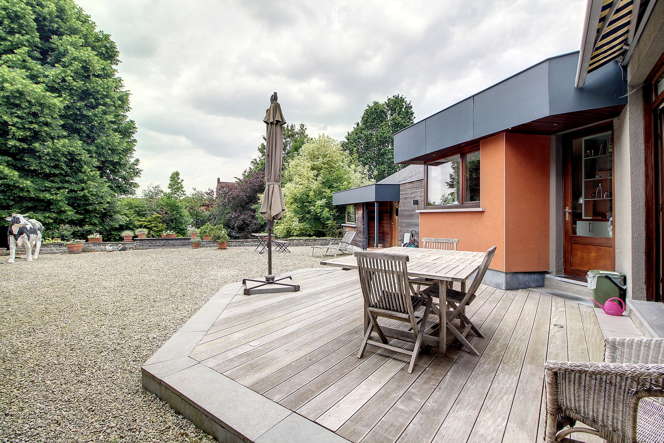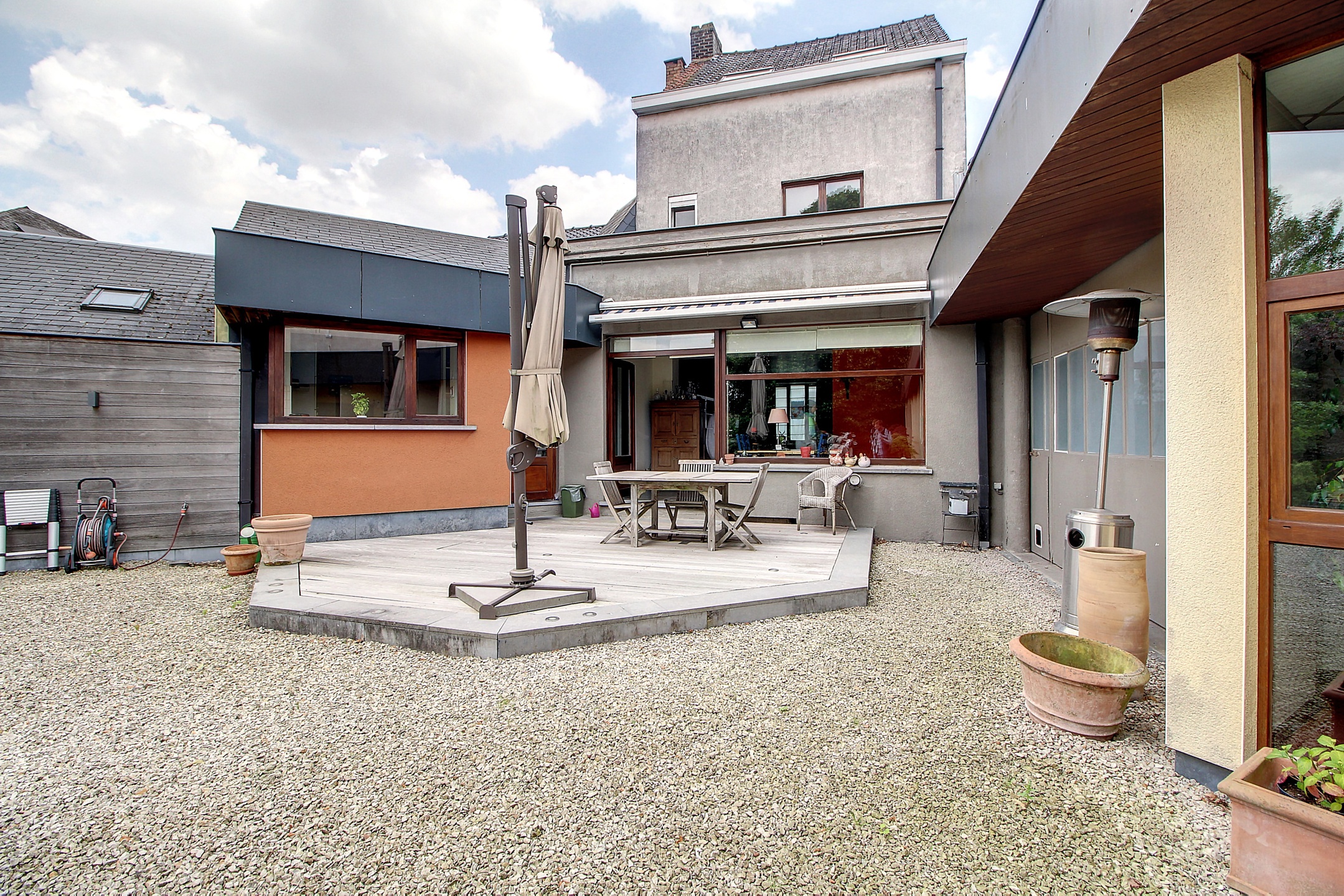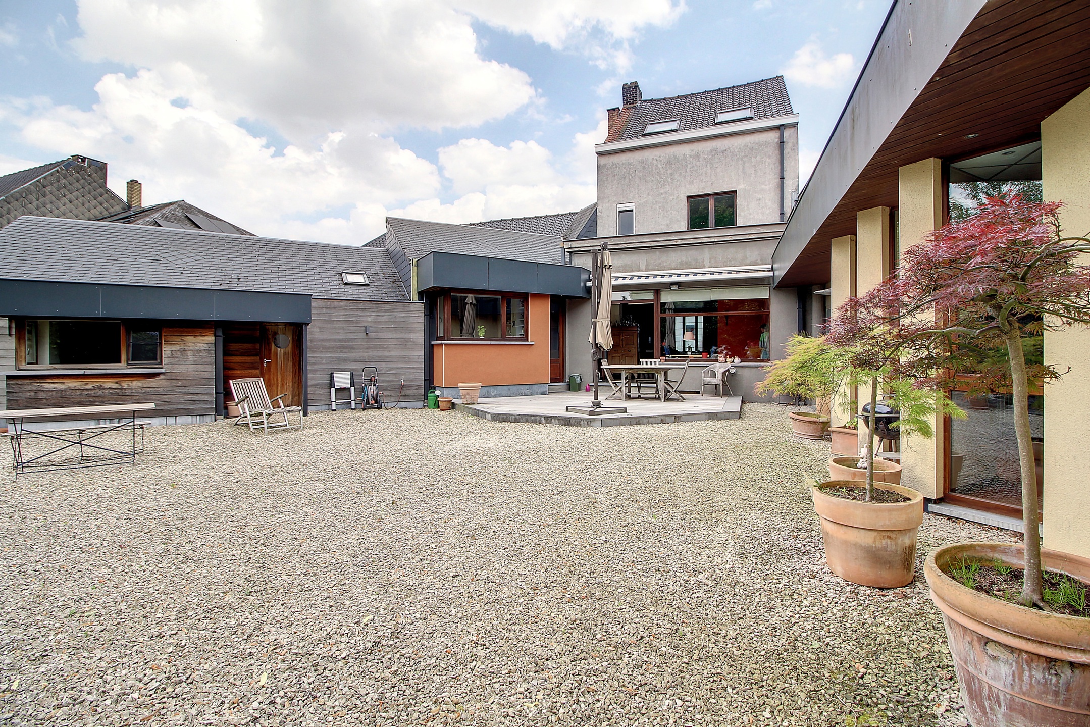 Spacieuse habitation avec bureaux/atelier, garage et jardin. L’habitation se compose d’un hall d’entrée avec wc, d’un living de +/- 45m², et d’une cuisine contemporaine totalement équipée. L’espace parental du rez comprend la chambre, la salle de bain et le dressing. Au 1er, 2 chambres, salle de bain et wc. Et enfin une chambre de +/- 45m² aménagée au second. Un garage (avec espace buanderie) de + de 60m². Les bureaux/atelier composés d’un hall d’entrée, de plusieurs bureaux, kitchenette, wc, chaufferie et d’une vaste pièce de rangement offrent une superficie de +/- 215m². L’ensemble donnant sur un grand jardin calme et ensoleillé.