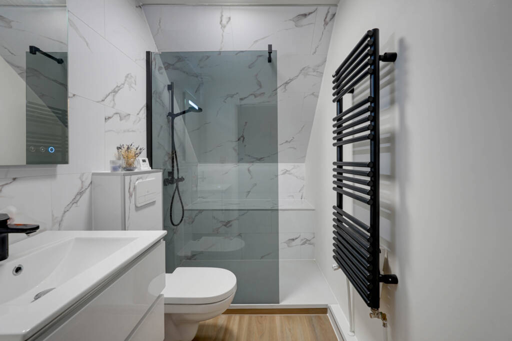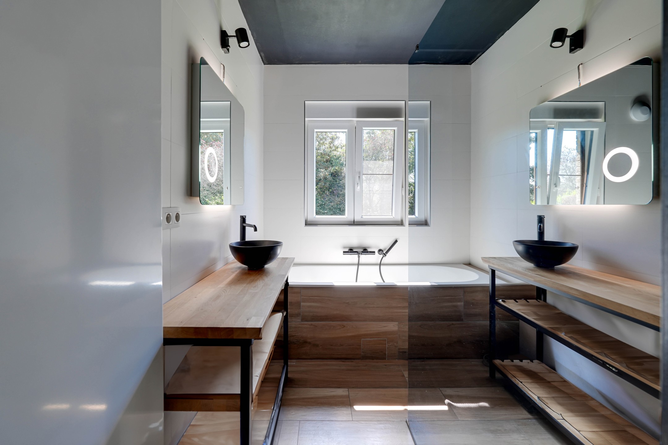 Au rez-de-chaussée, un vaste hall d’entrée avec toilette séparée permet de desservir un salon/séjour ouvert sur une cuisine équipée, une salle de bain (avec bain, douche, et vasque), une chambre, et un double garage avec coin buanderie.