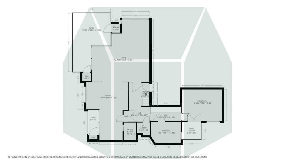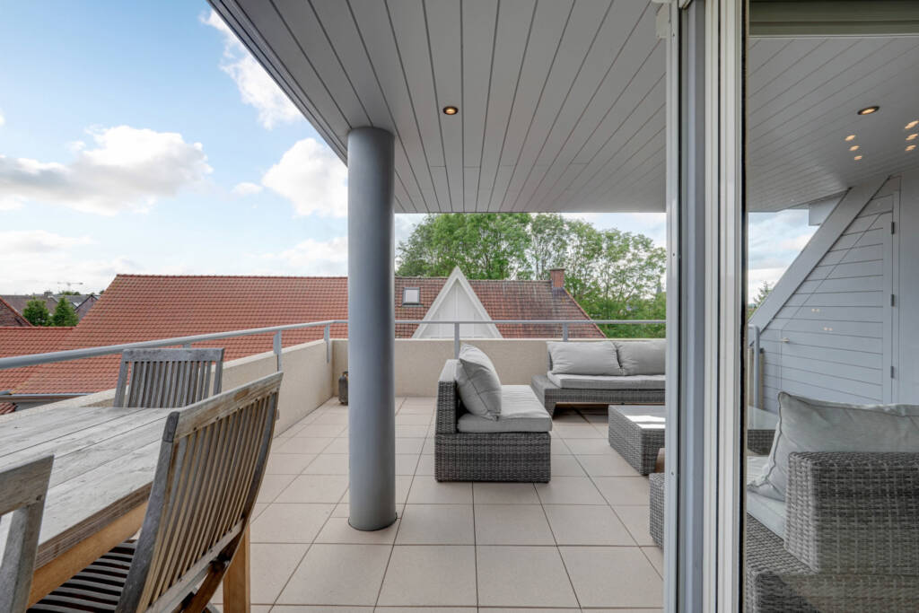 Le penthouse dispose de grandes fenêtres avec stores et d’une très grande terrasse orientée sud-ouest.
