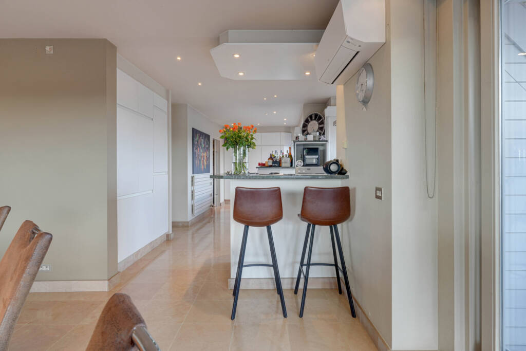 La cuisine est équipée d’appareils Miele et d’un plan de travail en granit, avec un espace pour le petit-déjeuner et des vues sur l’une des trois terrasses.