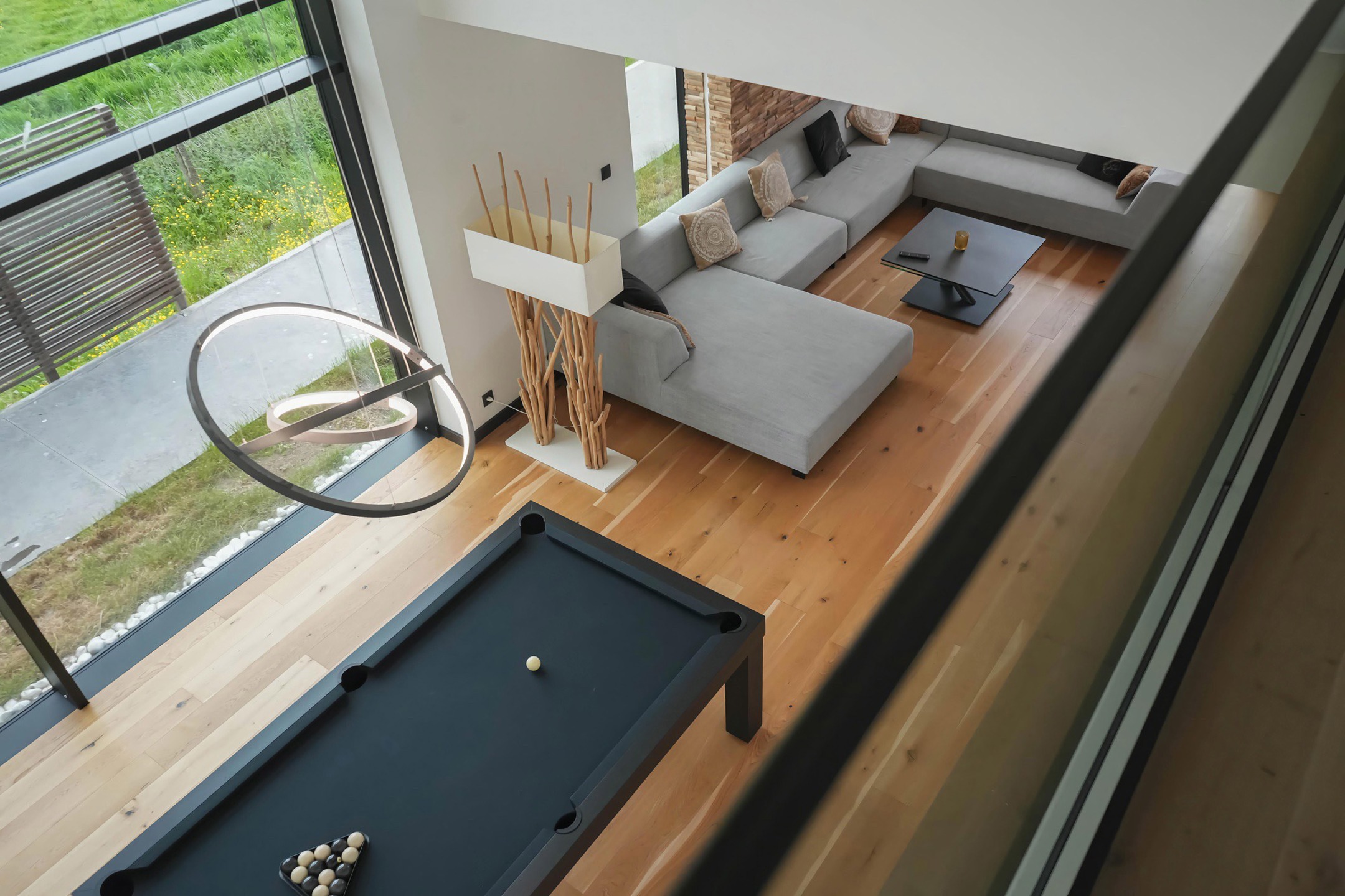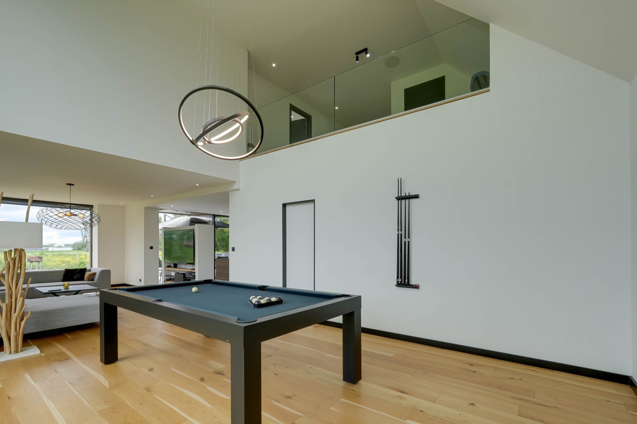 Rez-de-chaussée : vous serez accueilli par un hall menant à une salle à manger lumineuse. La cuisine ouverte, entièrement équipée, offre une vue imprenable sur le jardin. Le salon, agrémenté d’une salle de billard et de grandes ouvertures, invite à la détente. Le hall d’entrée dessert également un lumineux bureau, une somptueuse suite parentale comprenant une chambre, un dressing et une salle de bain. Garage aménagé avec buanderie.