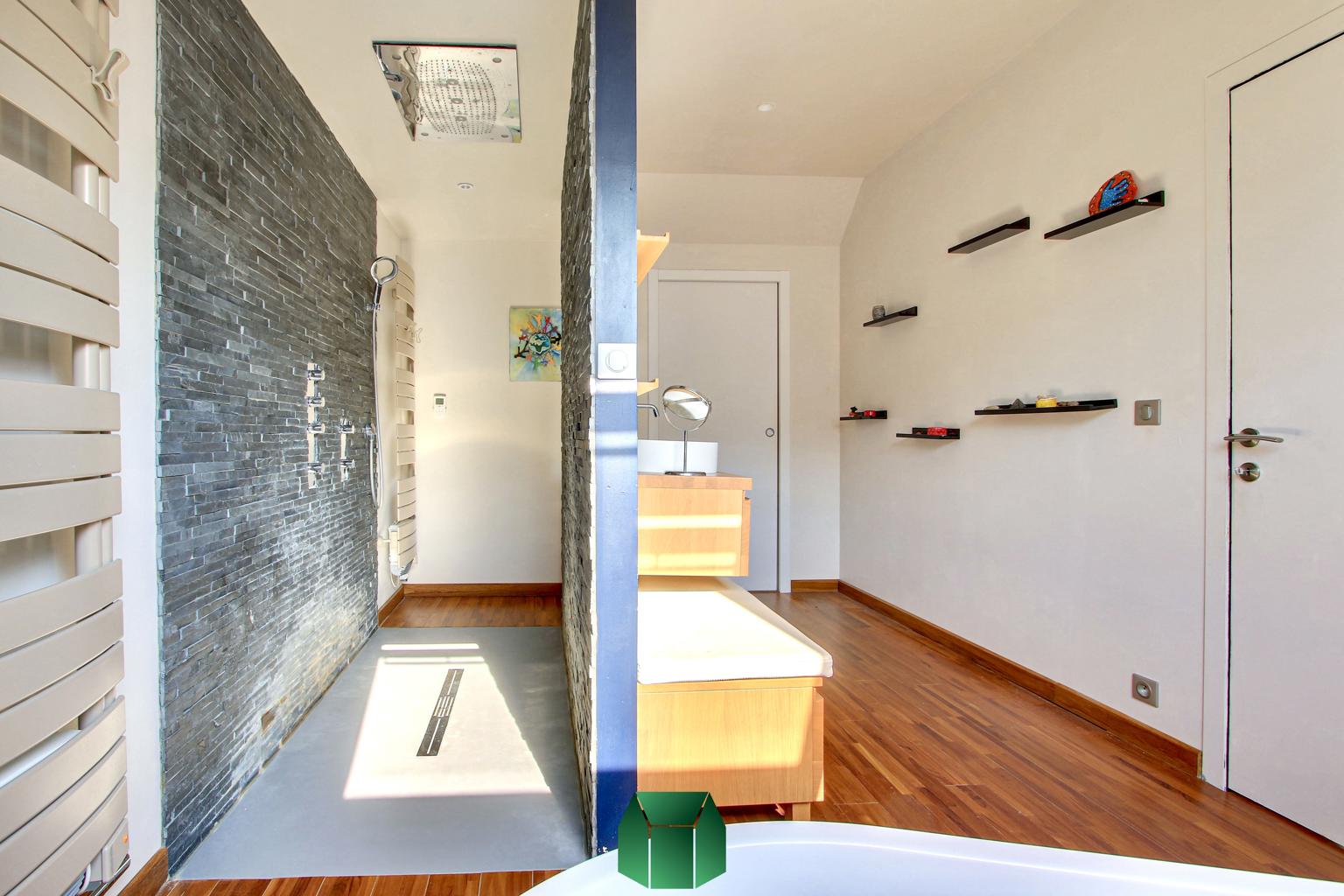 Cet étage est celui de la grande suite parentale avec salle d’eau (douche, baignoire, double vasque), WC et dressing.