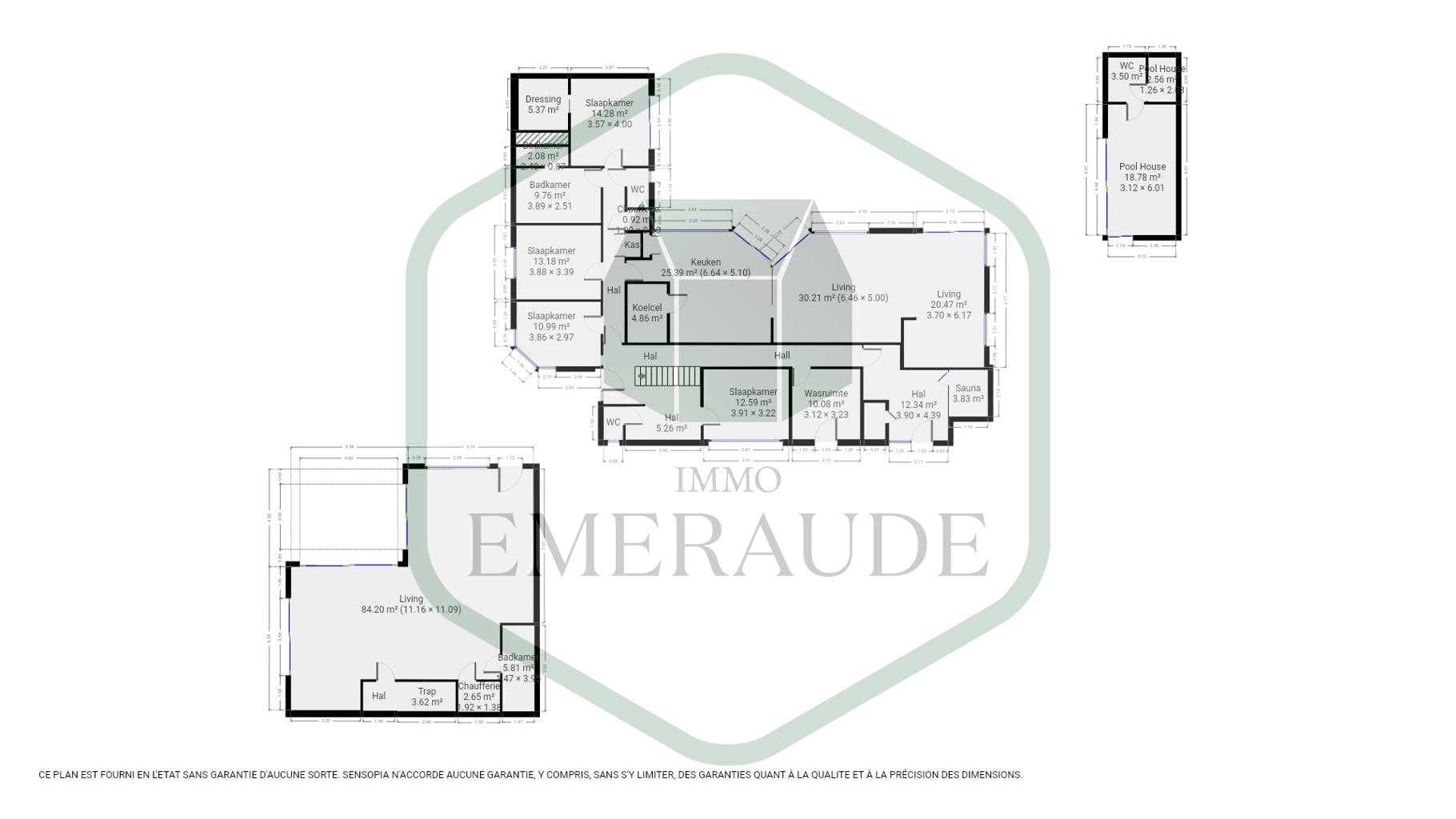 De l’autre côté de la villa, il y a une autre annexe polyvalente (138m²) équipée d’un chauffage de sol, d’une climatisation (chaud/froid), d’un espace sanitaire avec toilettes, urinoir, lavabo, douche à effet pluie, d’une kitchenette avec évier, lave-vaisselle, plaque de cuisson et micro-ondes et d’une cave à vin de 8m².