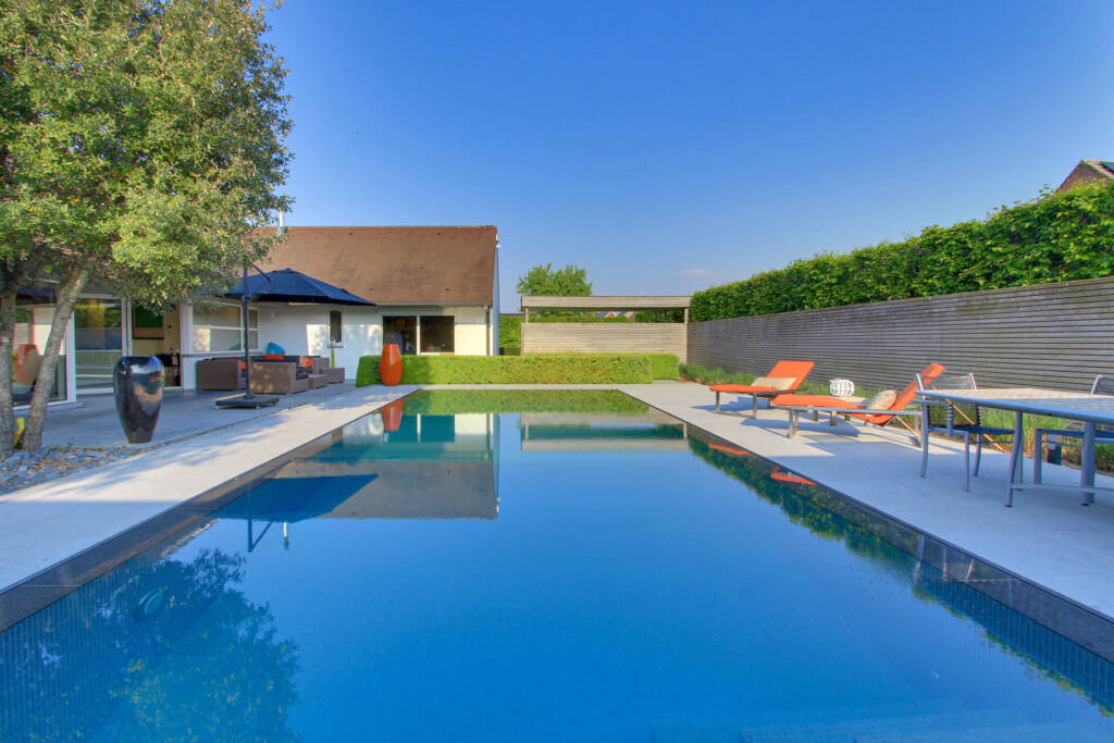 La touche finale, c’est que nous disposons également d’une chambre froide attenante.A côté de la cuisine, il y a une buanderie, un bureau, une salle à manger et un salon lumineux avec une foyer à gaz, le tout avec un parquet en chêne ancien et une vue sur la belle terrasse avec piscine à débordement.