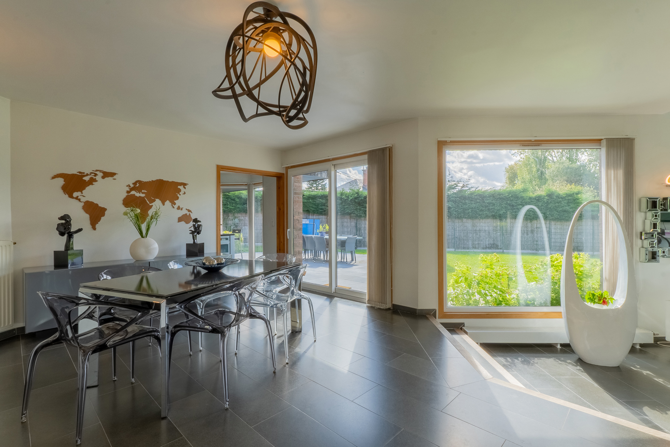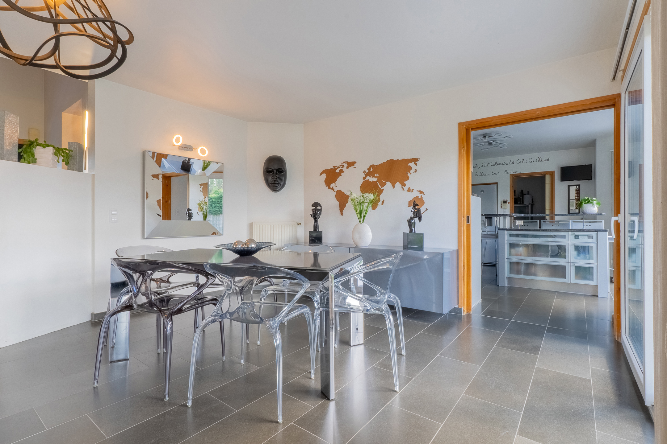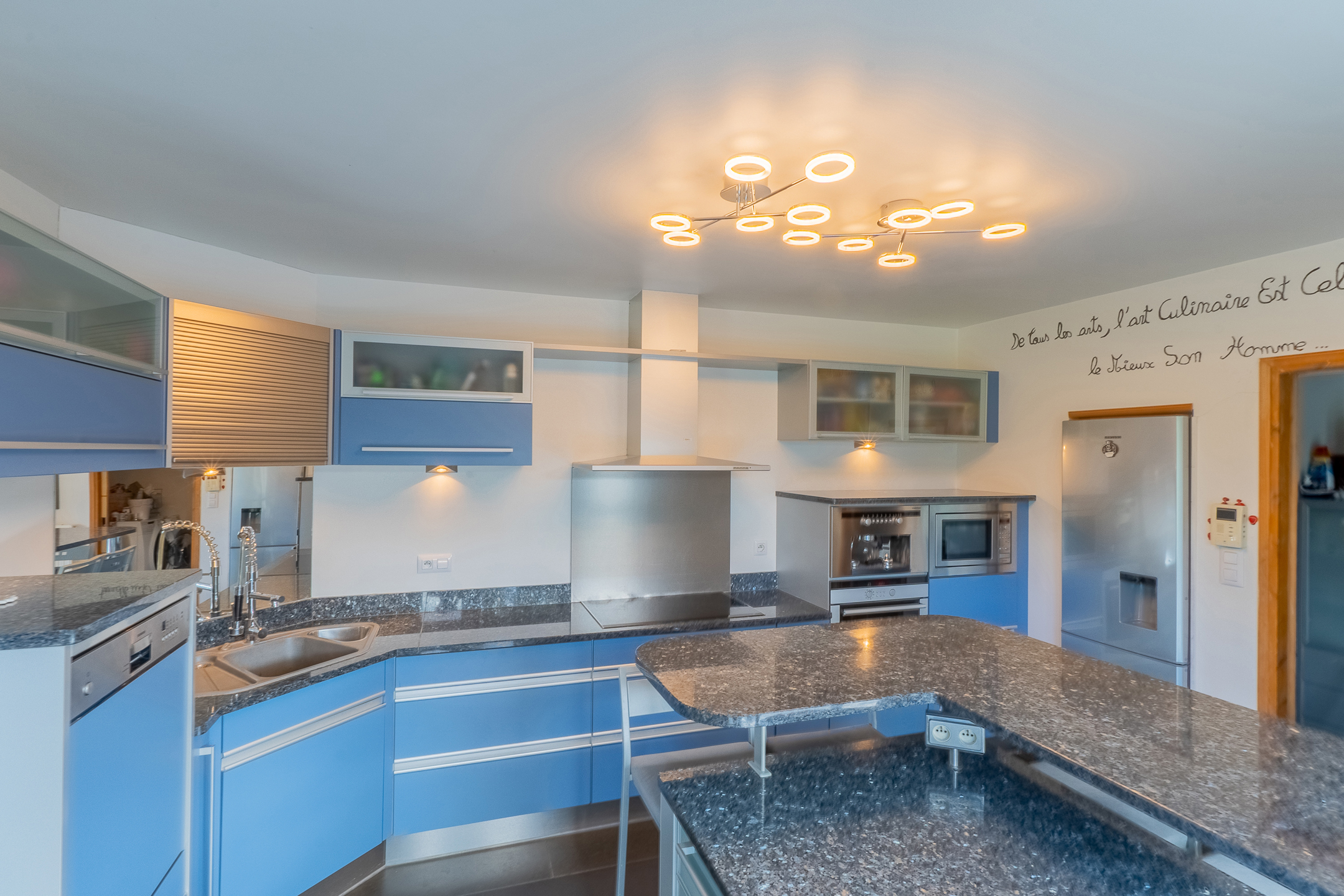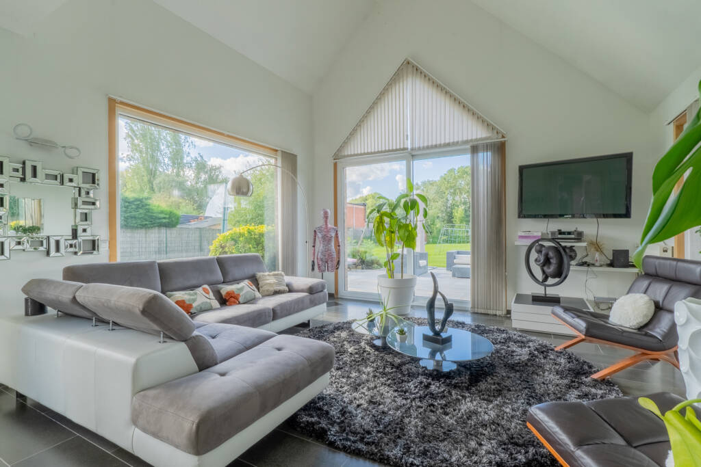 Dès l’entrée, vous serez séduit par un hall d’accueil spacieux, agrémenté d’un escalier apparent et d’un coin vestiaire. Un WC suspendu avec lave-mains vient compléter cet espace raffiné. Le rez-de-chaussée s’ouvre sur un vaste séjour baigné de lumière, avec son salon et sa salle à manger, offrant une ambiance chaleureuse grâce à une magnifique cheminée traversante. La cuisine entièrement équipée, moderne et fonctionnelle, est attenante, une arrière-cuisine/buanderie, donnant accès à un garage double spacieux.