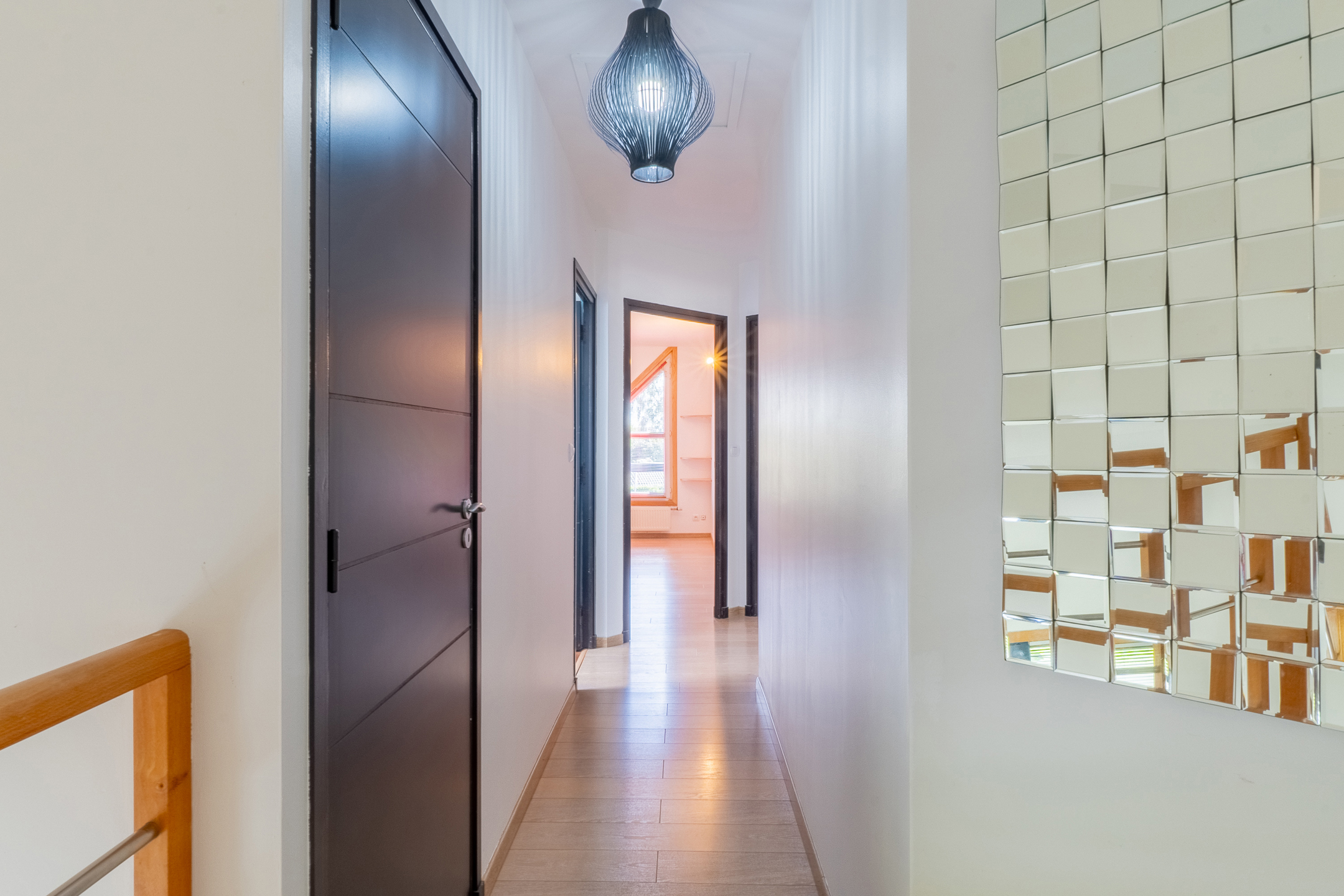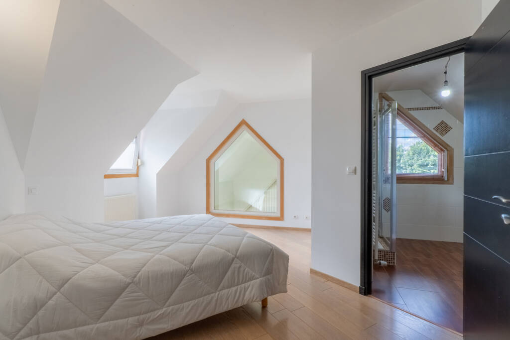 À l’étage, vous découvrirez une suite parentale avec sa salle de bains privative comprenant douche, lavabo, ainsi qu’un dressing aménagé. Trois autres chambres à coucher supplémentaires se trouvent à cet étage, toutes généreusement dimensionnées, ainsi qu’une seconde salle de bains, équipée d’une baignoire/douche, lavabo et WC séparé.