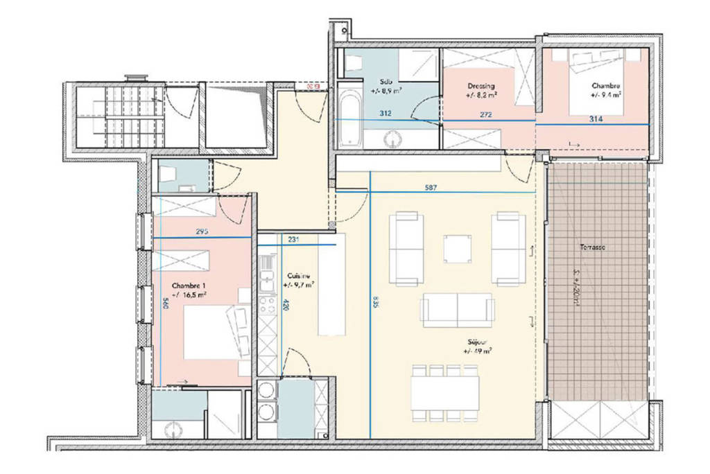 Caractéristiques techniques : isolation thermique et acoustique, système de ventilation double flux avec récupérateur de chaleur de marque ZEHNDER, portes d’entrée anti-effraction en verre opalin, châssis double vitrage en aluminium à coupure thermique, tablettes extérieures des fenêtres en pierre bleues, tablettes intérieures en pierre reconstituée, portes intérieures prêtes à peindre, cuisine équipée d’une valeur de 7.000€ HTVA, chauffage au sol par chaudière à condensation, carrelage 60×60 d’une valeur de 32€/m² HTVA avec plinthes assorties, parquet “Quick-Step” collection “Impressive” d’une valeur de 28€/m² HTVA avec plinthes assorties dans les chambres, faïences 25×50 d’une valeur de 30€/m² HTVA pour la salle de bain, terrasses en dalles antidérapantes sur plots, balustrades en aluminium ou en acier laqué, vidéophonie, fibre optique Proximus.