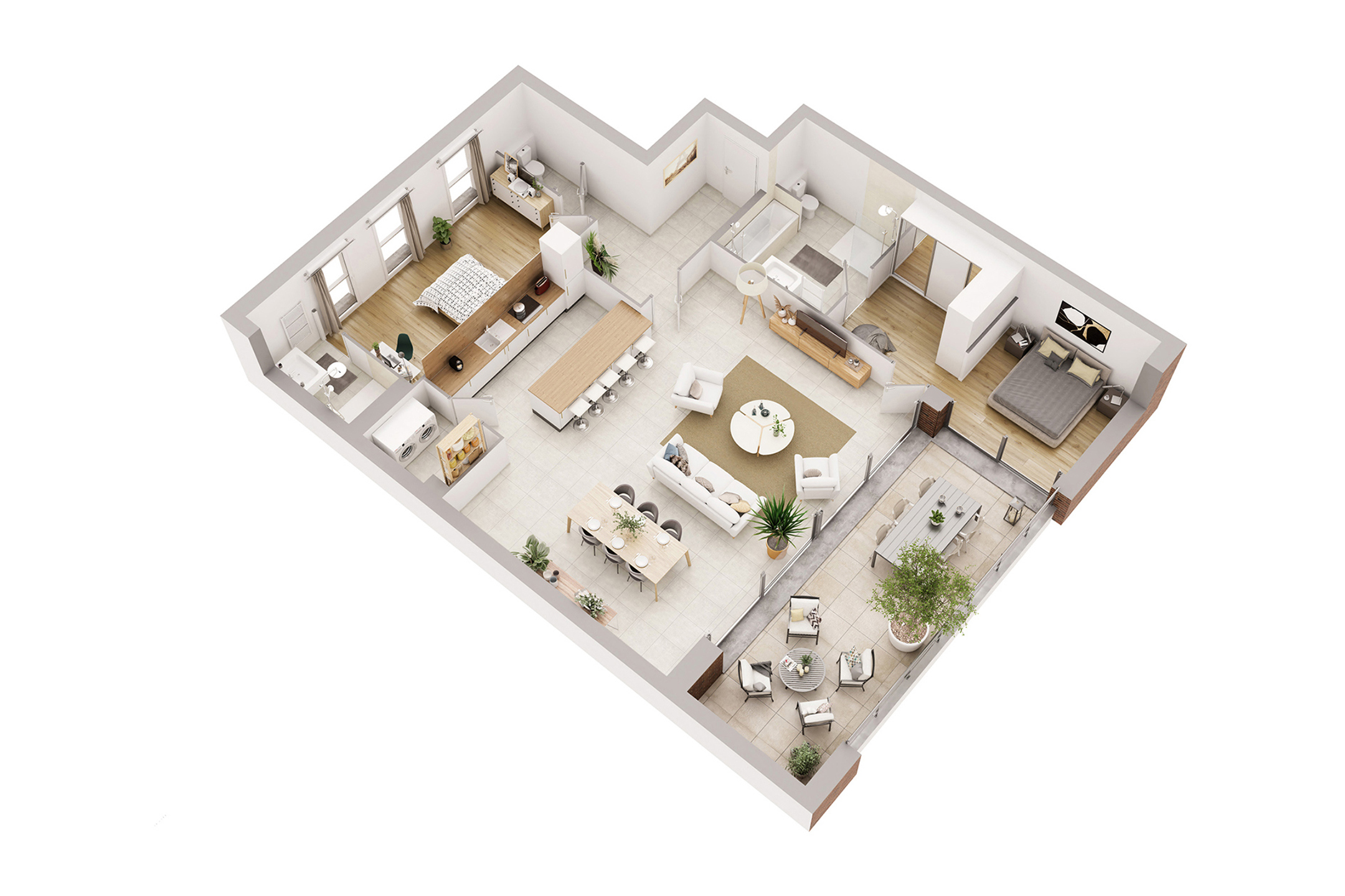 Caractéristiques générales : Hall d’entrée, WC séparé avec lave-mains, 2 chambres dont une avec dressing et salle de bain avec baignoire, douche et WC et une avec salle de douche, meuble vasque et miroir avec éclairage dans chaque pièce d’eau, séjour avec cuisine équipée ouverte, buanderie, terrasse et ascenseur.