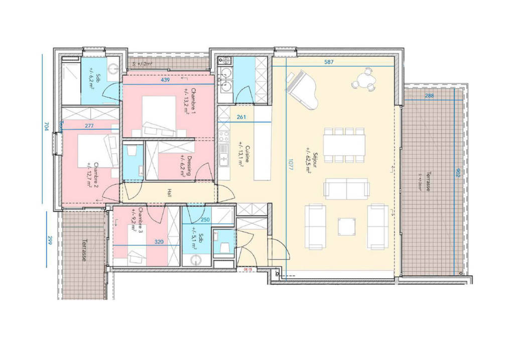 Caractéristiques techniques : isolation thermique et acoustique, système de ventilation double flux avec récupérateur de chaleur de marque ZEHNDER, portes d’entrée anti-effraction en verre opalin, châssis double vitrage en aluminium à coupure thermique, tablettes extérieures des fenêtres en pierre bleues, tablettes intérieures en pierre reconstituée, portes intérieures prêtes à peindre, cuisine équipée d’une valeur de 8.000€ HTVA, chauffage au sol par chaudière à condensation, carrelage 60×60 d’une valeur de 32€/m² HTVA avec plinthes assorties, parquet “Quick-Step” collection “Impressive” d’une valeur de 28€/m² HTVA avec plinthes assorties, faïences 25×50 d’une valeur de 30€/m² HTVA pour la salle de bain, terrasses en dalles antidérapantes sur plots, balustrades en aluminium ou en acier laqué, vidéophonie, fibre optique Proximus.