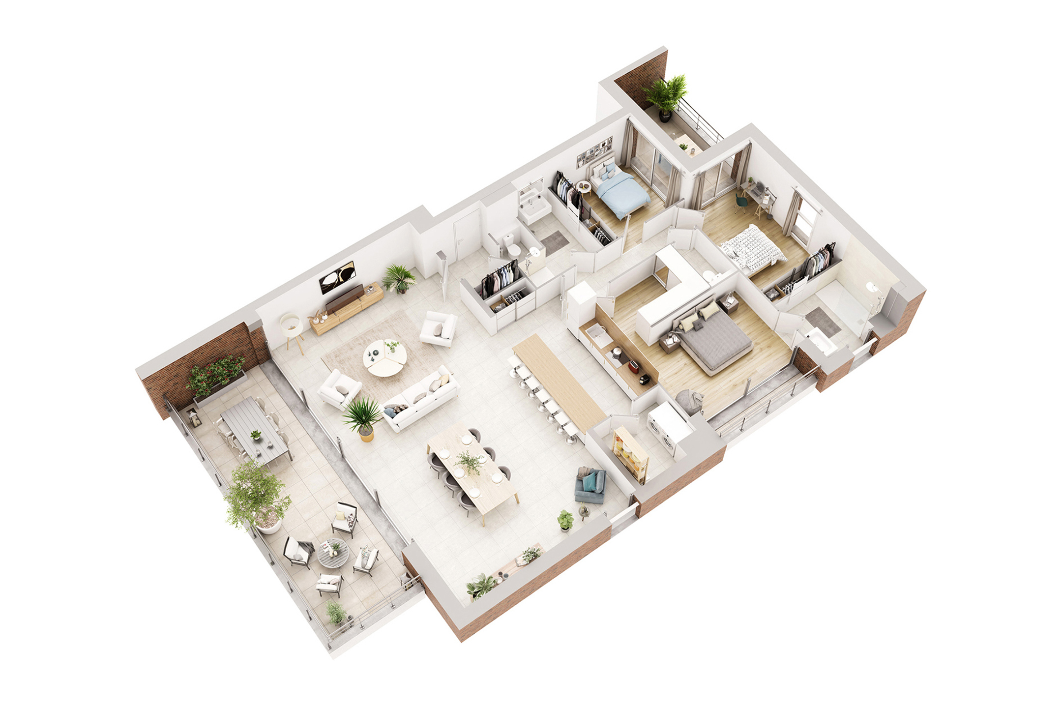 Caractéristiques générales : Hall d’entrée, 2 WC séparés avec lave-mains, 3 chambres dont une avec dressing et salle de bain avec baignoire, salle de douche, meuble vasque et miroir avec éclairage dans chaque pièce d’eau, séjour avec cuisine équipée ouverte, buanderie, balcon, 2 terrasses et ascenseur.