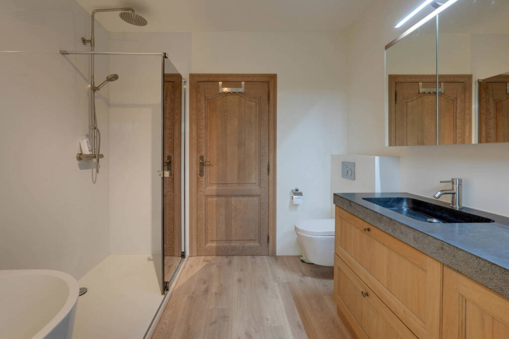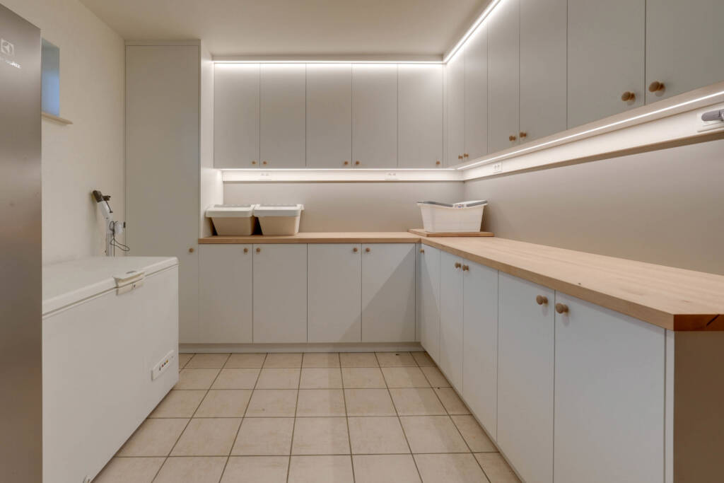 Binnen in de villa bevinden zich drie ruime slaapkamers, een badkamer met ligbad, inloopdouche, dubbele wastafel en toilet. De royale woonkamer, uitgerust met een pelletkachel en zicht op het terras, straalt een gezellige sfeer uit. De open ruimte omvat tevens de eet- en woonkamer. De lichtrijke leefkeuken is voorzien van alle moderne apparatuur, inclusief een Amerikaanse koelkast, dubbele spoelbak en een kookeiland met ontbijthoek, overal met prachtig uitzicht op het omliggende landschap. Daarnaast is er nog een ruime bijkeuken en een grote wasruimte. Op de eerste verdieping bestaat de mogelijkheid tot het inrichten van meerdere slaapkamers of andere ruimtes naar wens.
