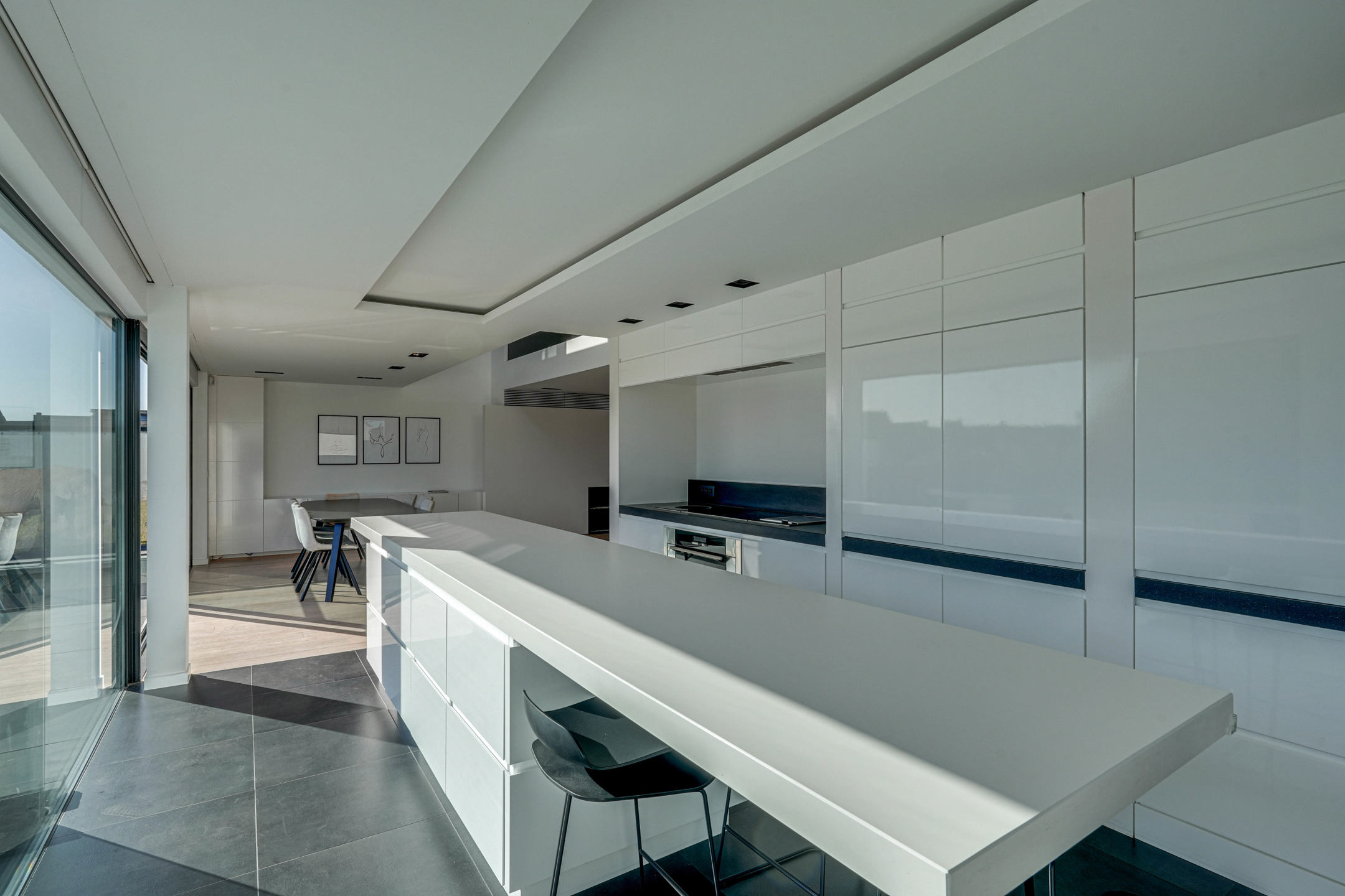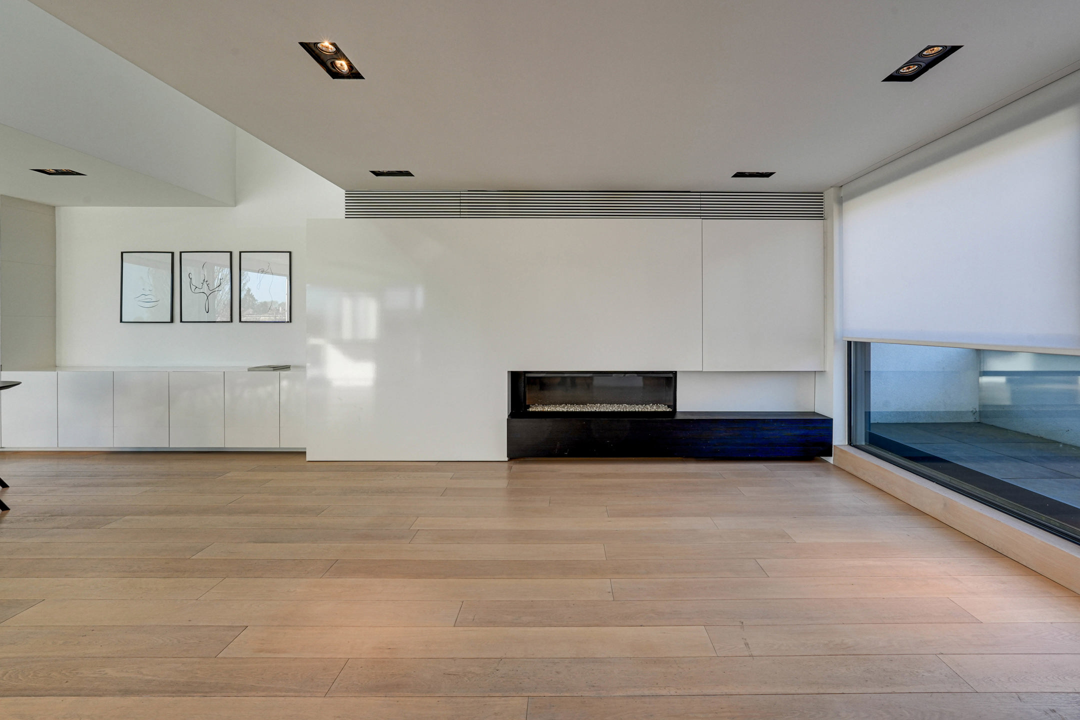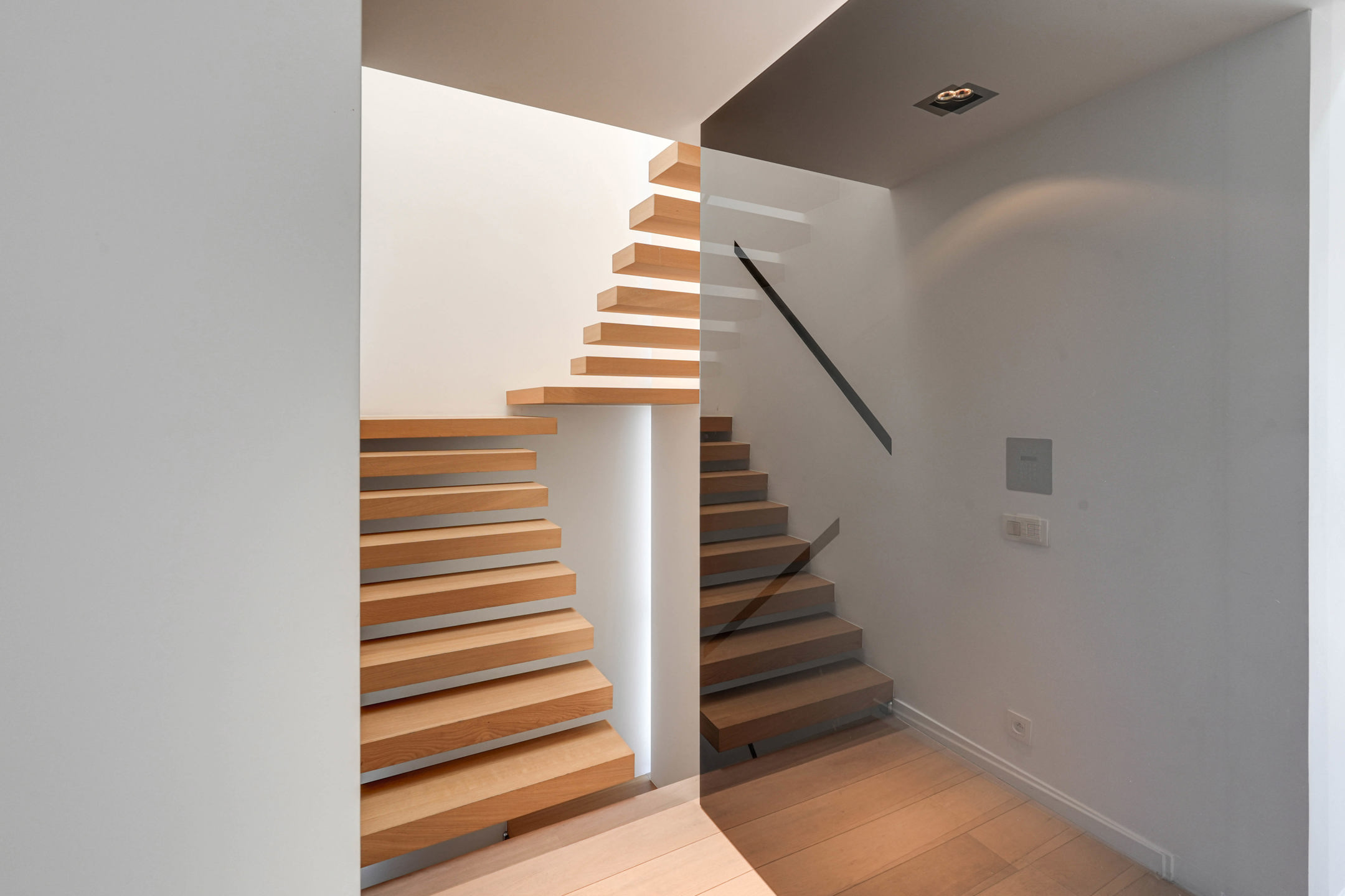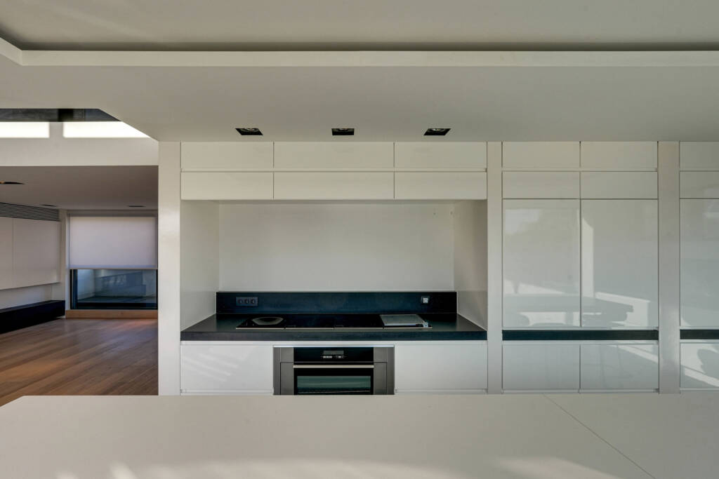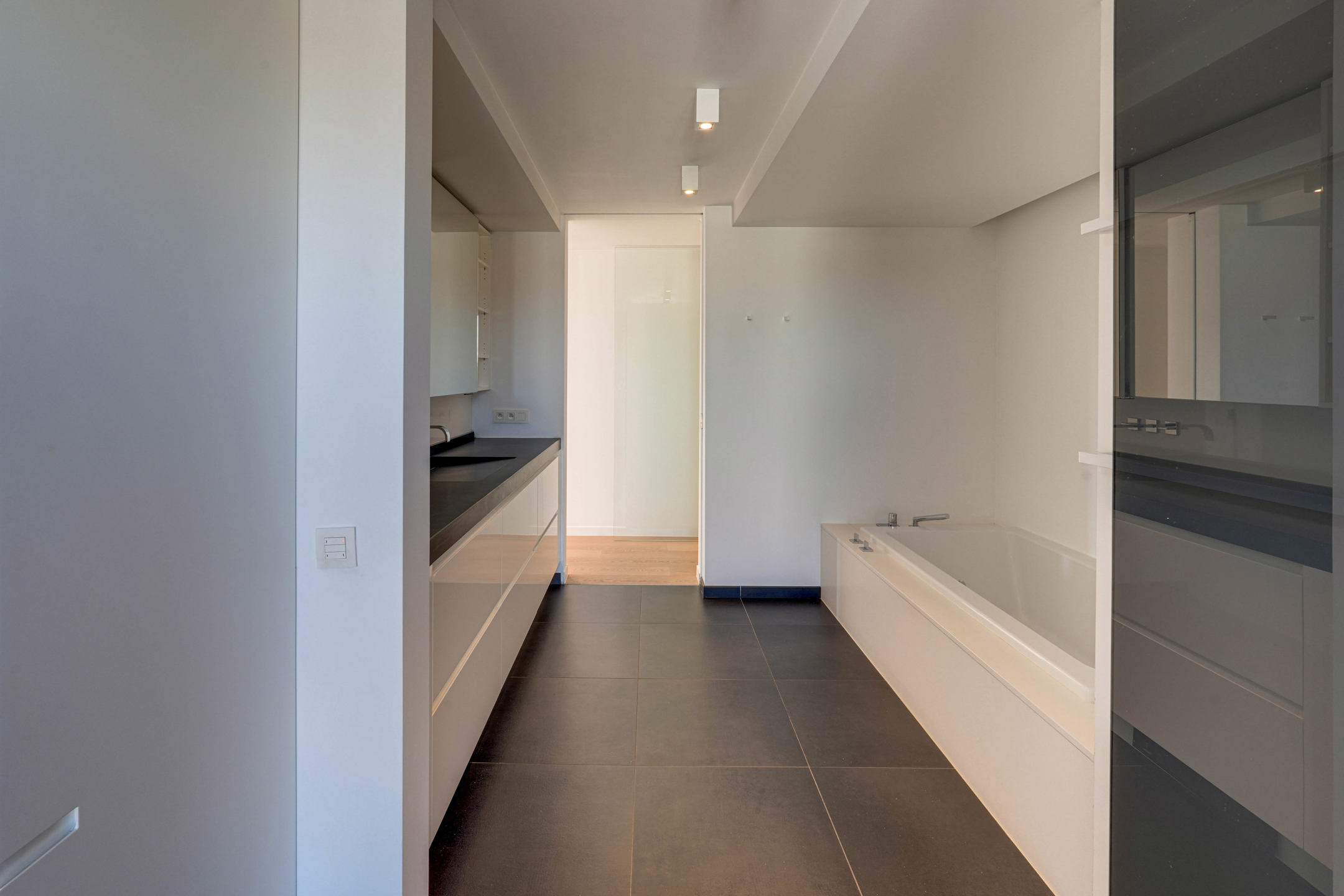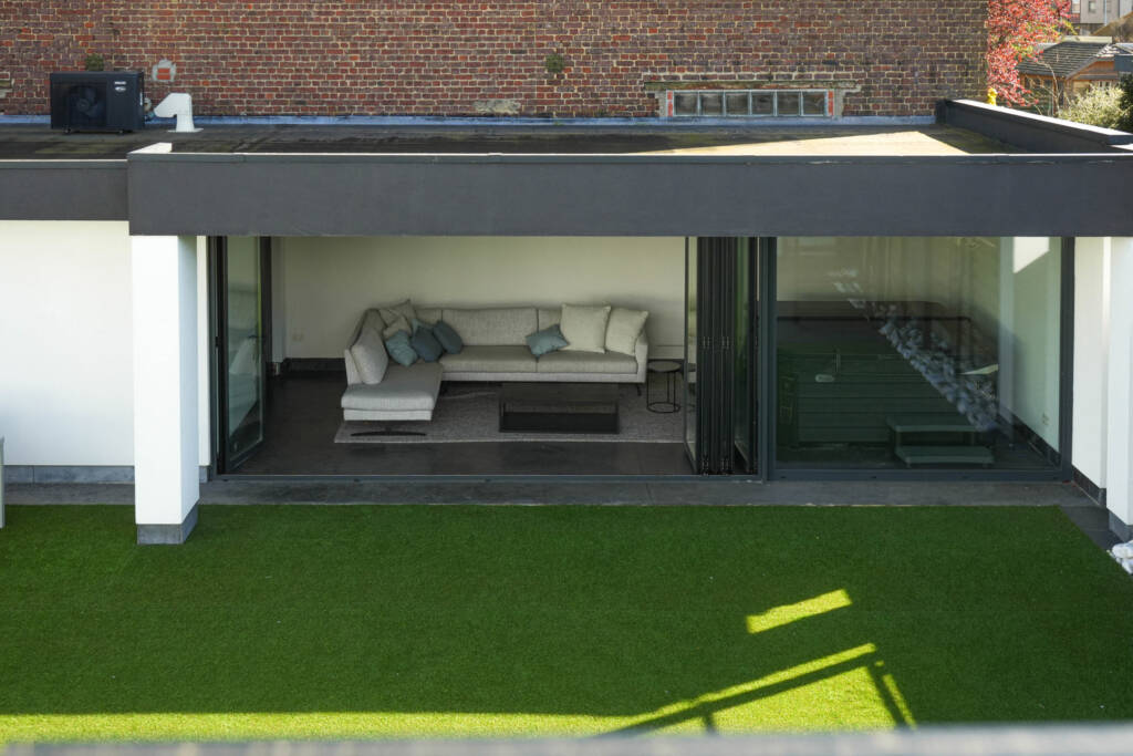 Op de bovenverdieping vinden we een slaapkamer, een apart toilet en de masterbedroom. De masterbedroom biedt een eigen terras, een dressing en grenst aan een weelderige badkamer die voorzien is van een royale inloopdouche, ligbad, wastafel met veel opbergruimte.