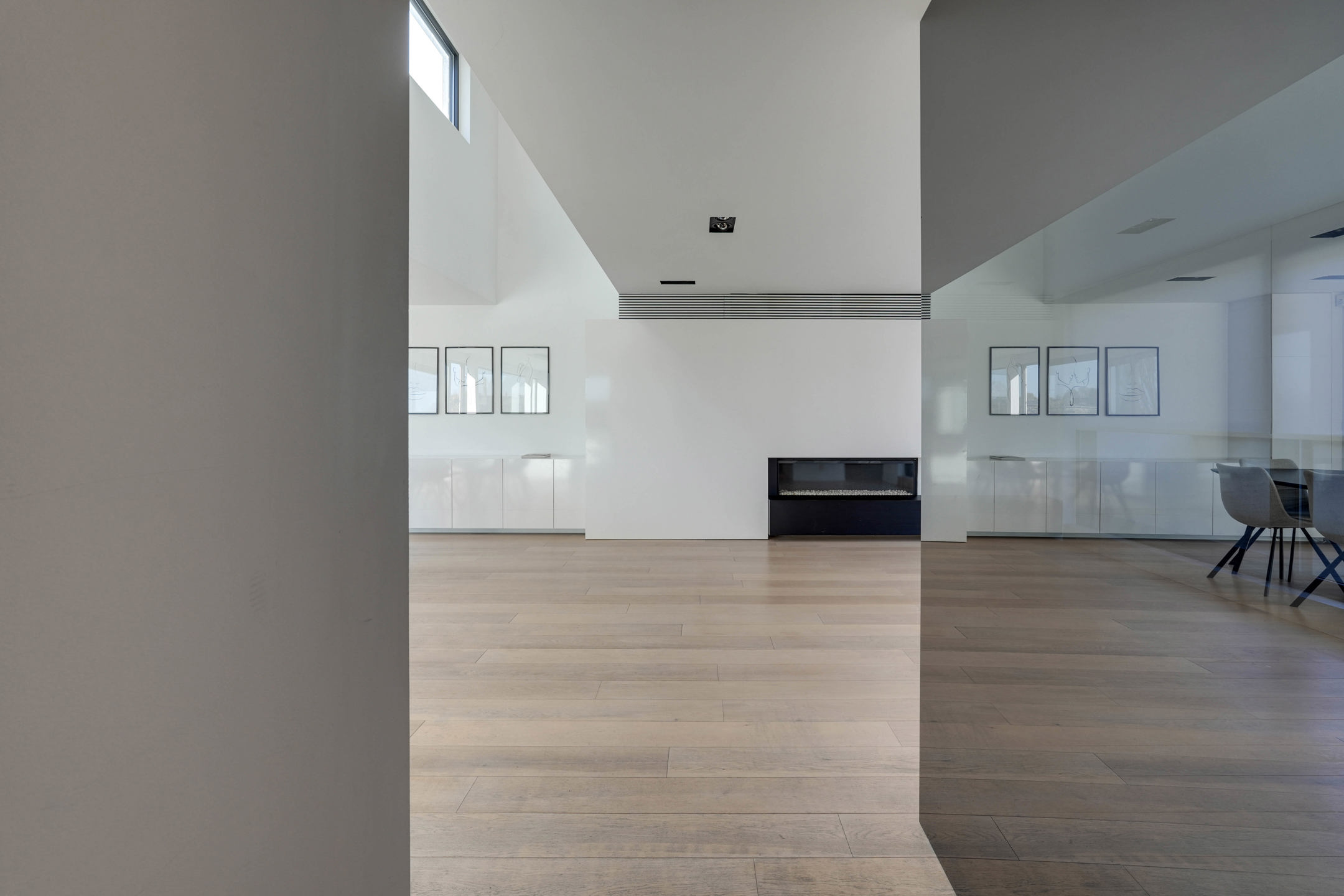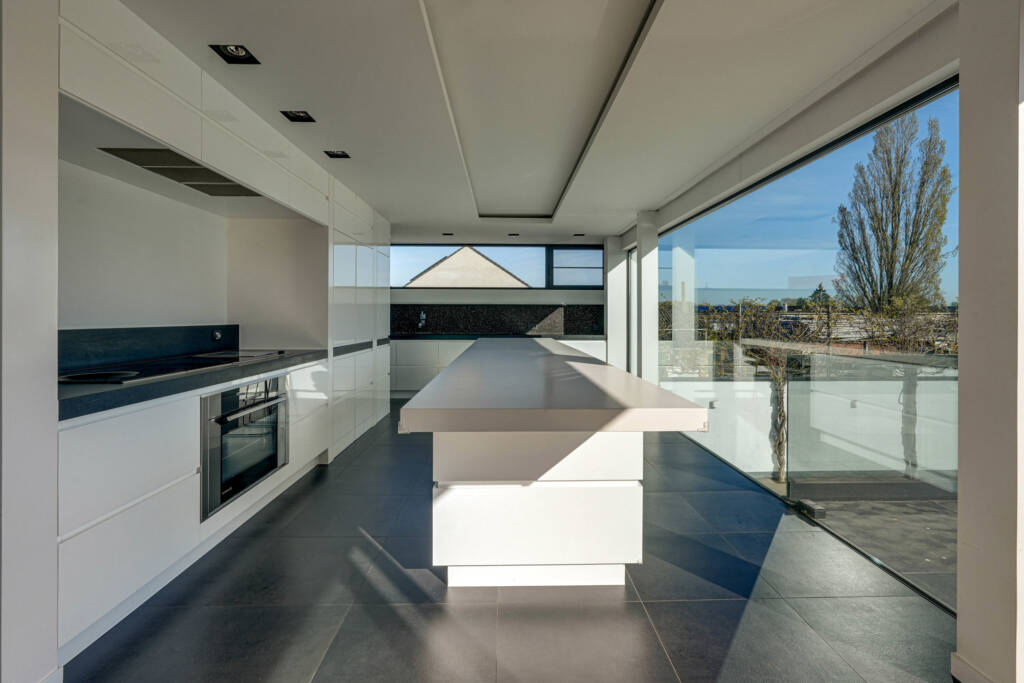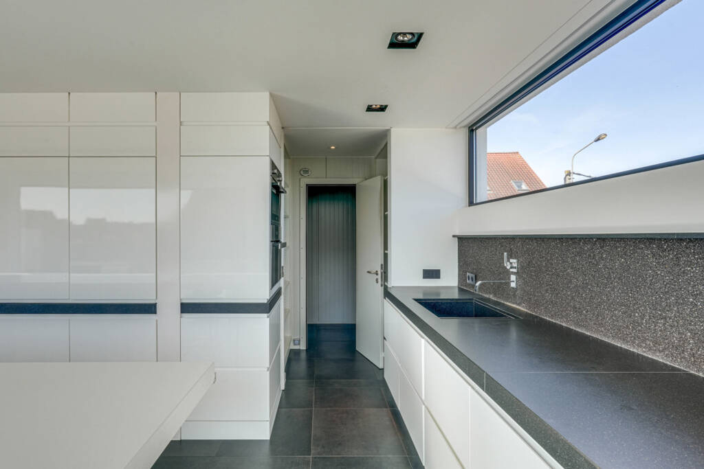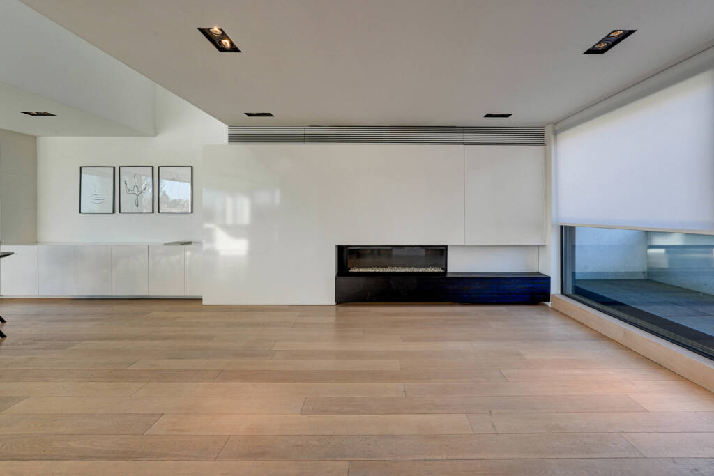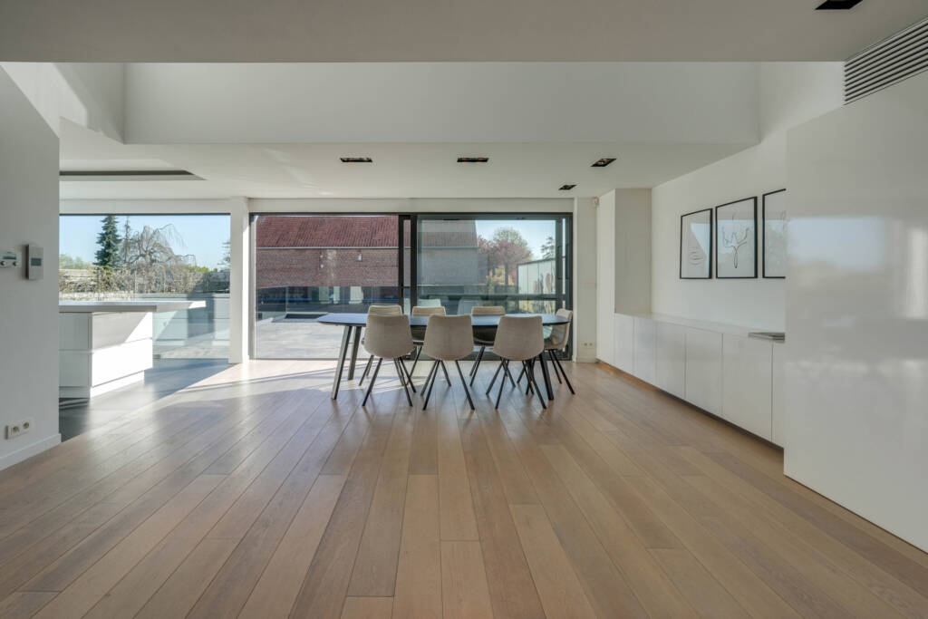 Op de 1ste verdieping merken we meteen een oase aan licht en ruimte dankzij de open vide en de royale raampartijen. De L-vormige leefruimte staat in verbinding met de aparte tv-hoek en keuken, die op zijn beurt harmonieus uitkijkt op de tuin en het royaal terras dat naadloos er op aansluit. De keuken is volledig uitgerust met hyper moderne apparatuur en een handige koelcel. Verder is er nog een gezellige gashaard die voor extra warmte en gezelligheid zorgt in de winter.