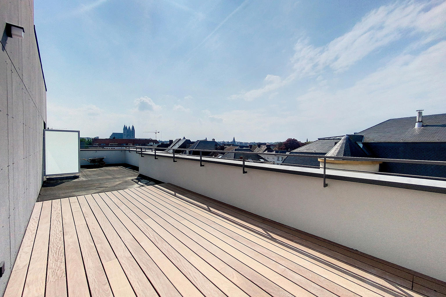 Porte d’entrée de type blindée ; Châssis en PVC double vitrage ; Mensuiseries extérieures en aluminium et équipées de stores ; Portes des garages de type basculantes et non débordantes ; Détecteur incendie ; Vidéophonie ; Appartement livré peint avec une couche primaire et deux couches de finition de couleur blanche ; Carrelage (dalles en grès cérame 60×60 cm) dans le hall de jour, hall de nuit, WC, salle de bain, cuisine et séjour avec plinthes assorties ou éventuellement en bois ; Revêtement en parquet semi-massif dans les chambres avec plinthes en bois assorties au parquet choisi ; Faïence murale (25×50 cm) dans la salle de bain ou salle de douche ; Tablettes des fenêtres en pierre naturelle ou reconstituée ; Chauffage au sol avec pompe à chaleur réversible permettant une utilisation en mode de rafraîchissement ; Ventilation simple flux intelligent de type Renson C+ ou équivalent ; Compteurs bi-horaire et séparés ; Terrasses en lattage bois ou en dalles extérieures en grès placées sur plots (sauf balcons préfabriqués en béton), équipées d’un éclairage LED dédié. Frais de raccordement à charge de l’acquéreur (+/- 3.000€) !