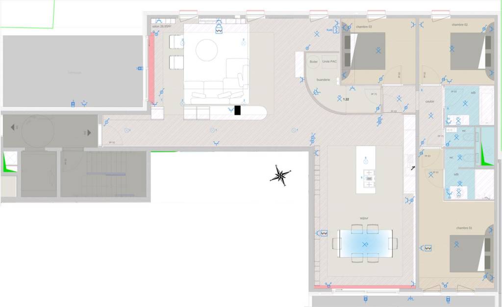 Hall de nuit desservant trois belles chambres dont une avec salle de douche, WC séparé avec lave-mains et salle de bain.