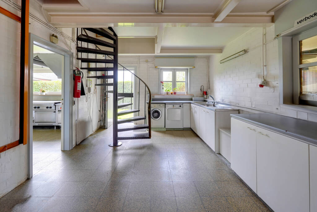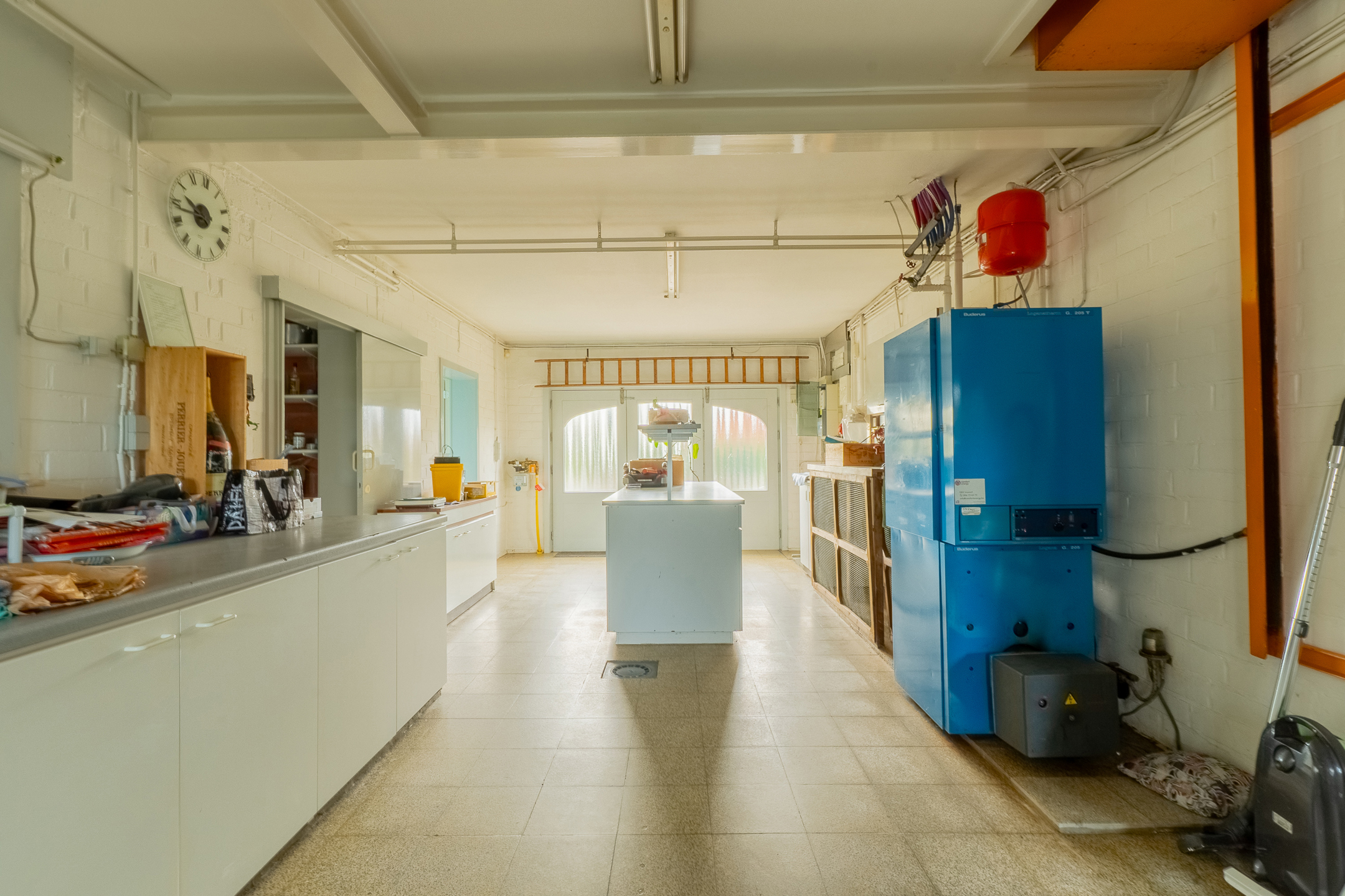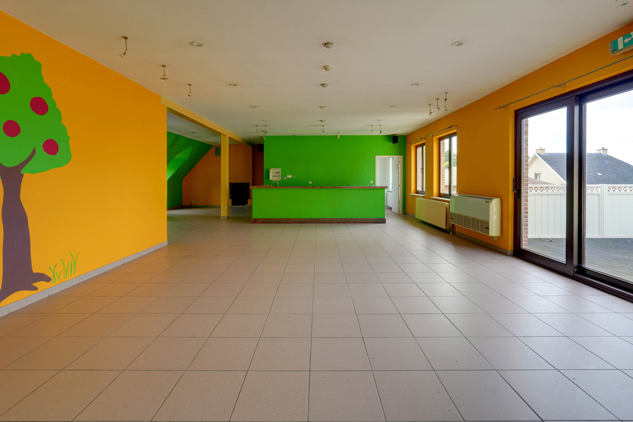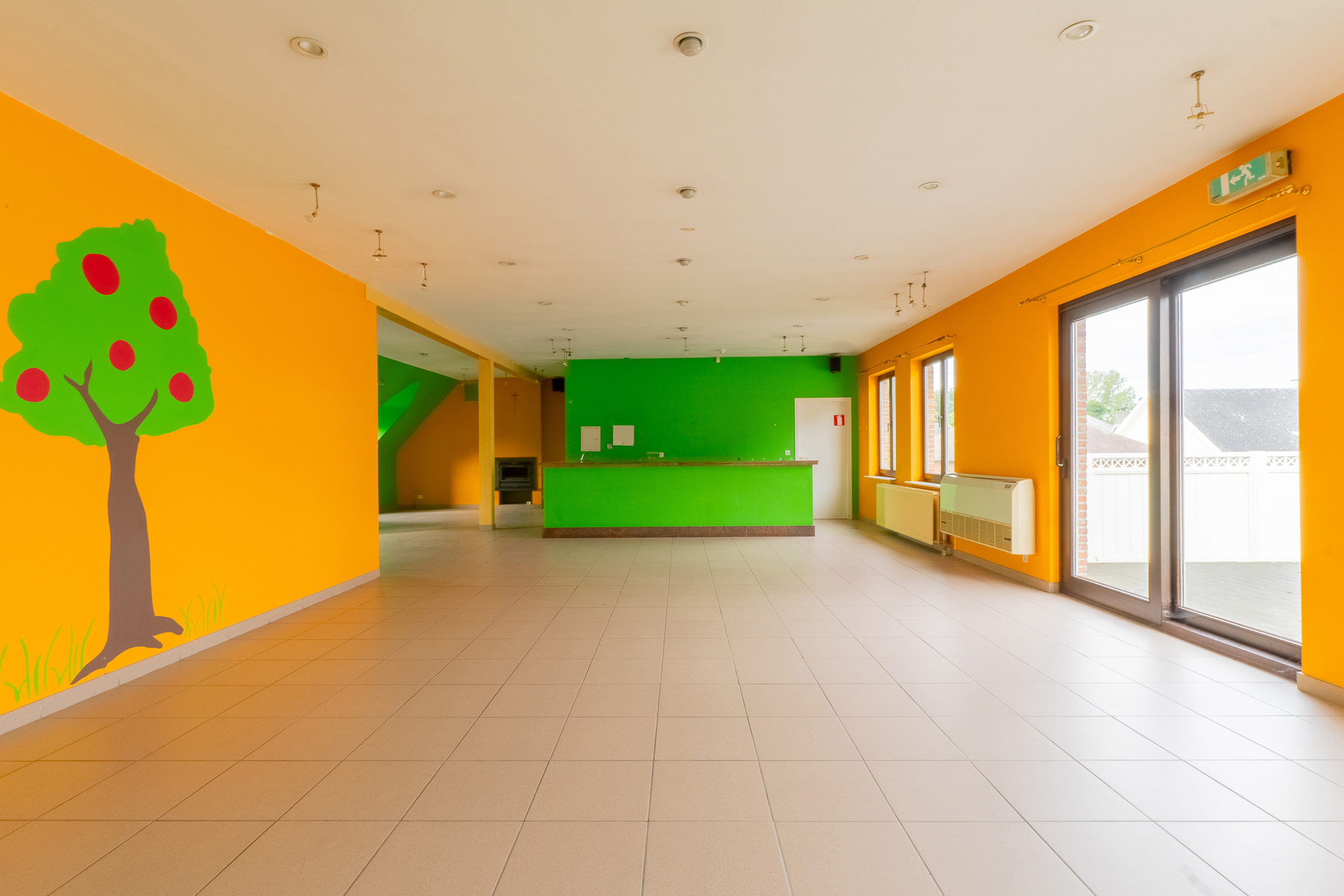 Op het gelijkvloers bevindt zich een 2de inkomhal met gescheiden toiletten voor dames en heren, een kantoorruimte en een bergplaats, momenteel voorzien van (verwijderbare) koelcellen. Verder prijken een dubbele garage met automatische poort, bereikbaar via de uitweg achteraan ter hoogte van de kerk. Op de 1ste verdieping biedt een ruime overloop toegang tot een grote zaal van circa 85 m² die kan worden omgebouwd tot kamers of burelen of speelruimte of …… Een royaal buitenterras achteraan vervolmaakt dit bijzondere deel van de eigendom.