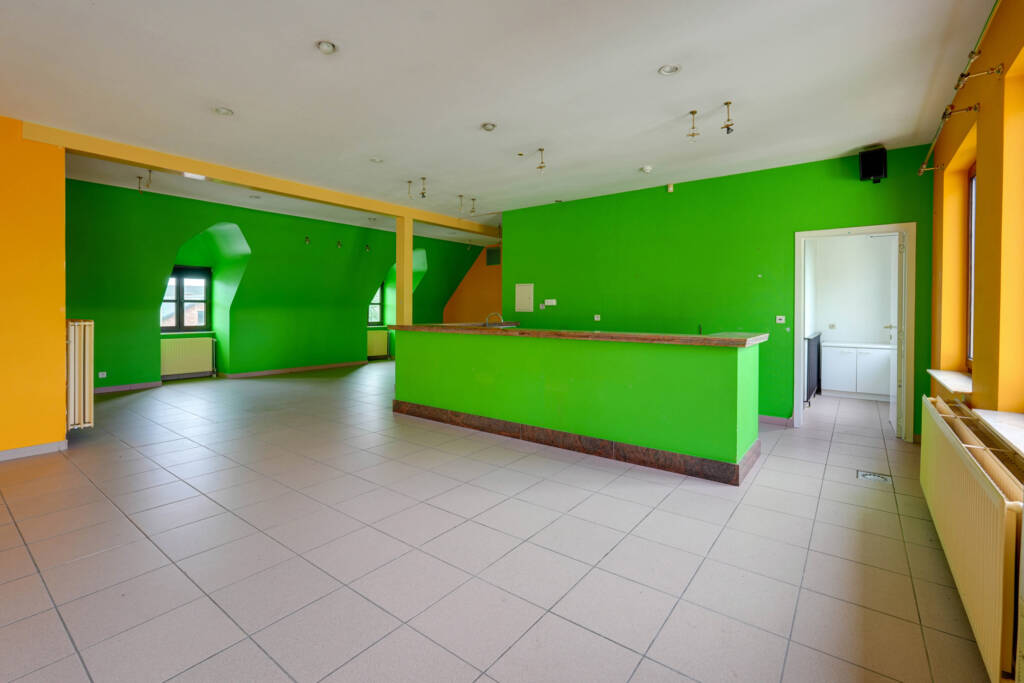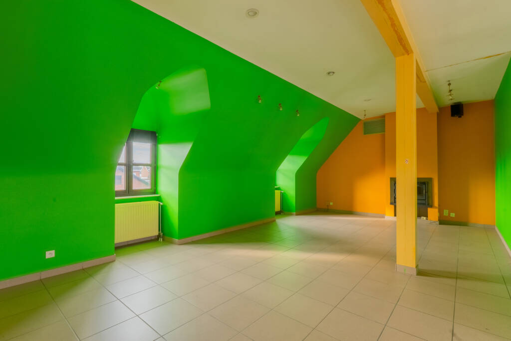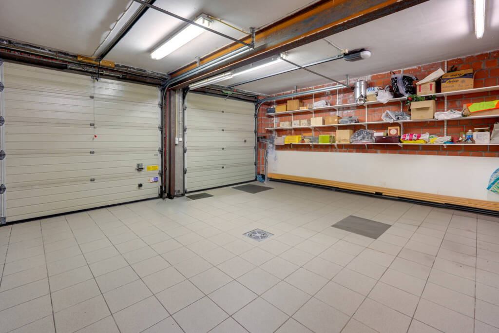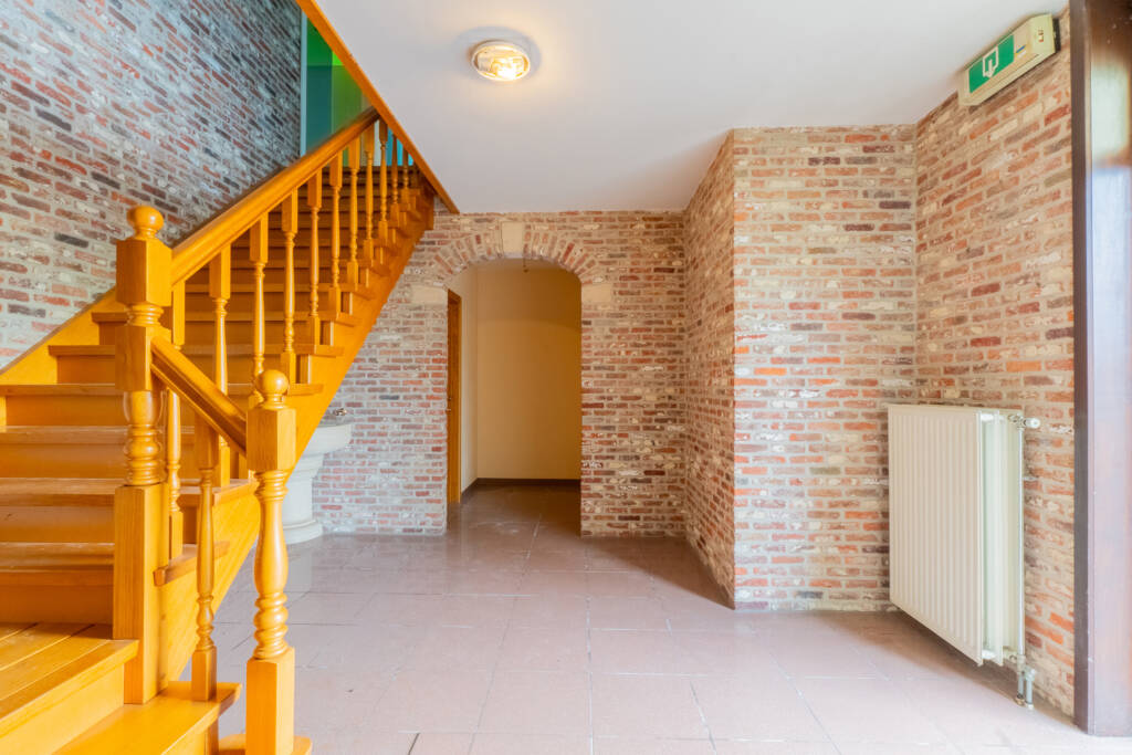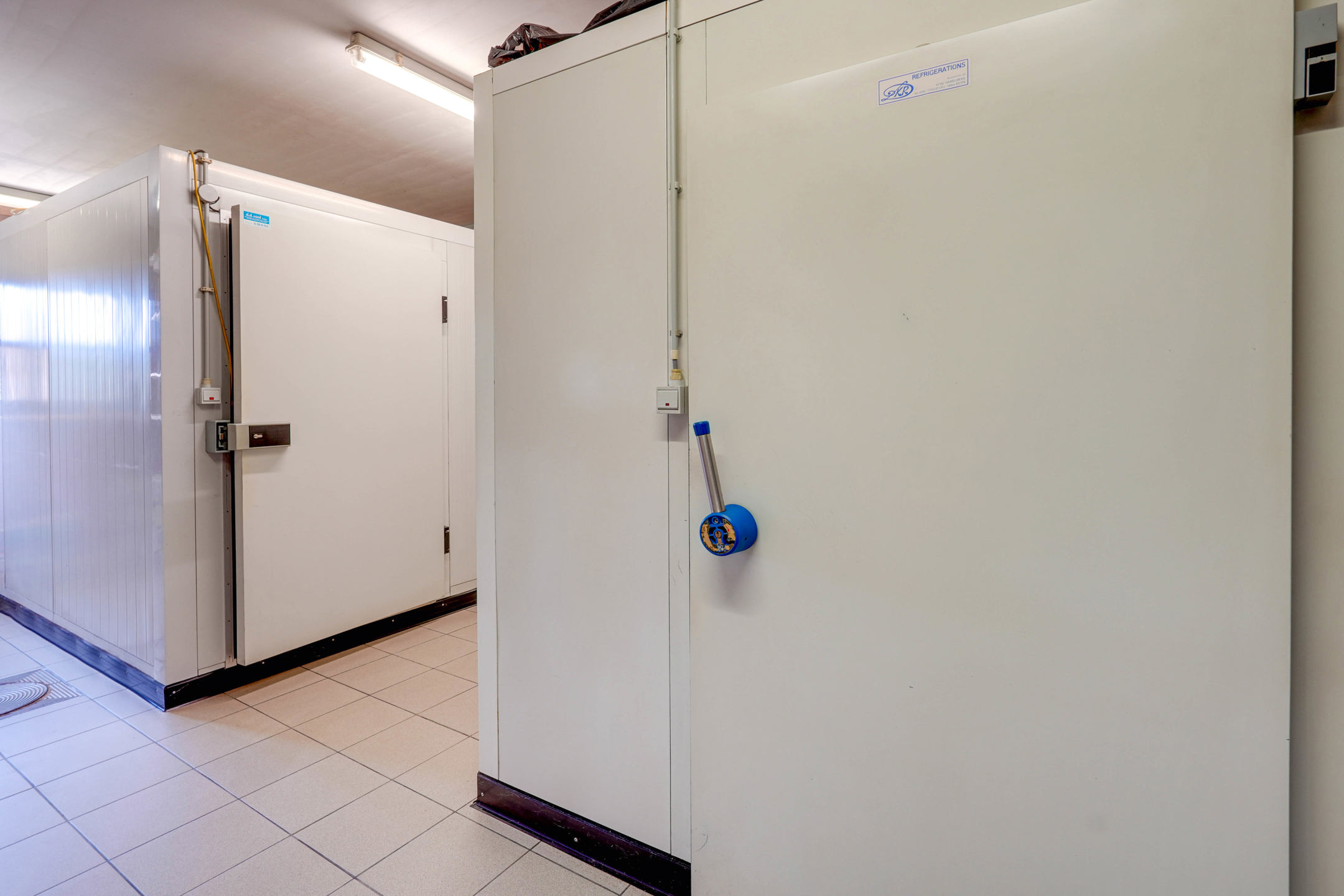 Op het gelijkvloers bevindt zich een 2de inkomhal met gescheiden toiletten voor dames en heren, een kantoorruimte en een bergplaats, momenteel voorzien van (verwijderbare) koelcellen. Verder prijken een dubbele garage met automatische poort, bereikbaar via de uitweg achteraan ter hoogte van de kerk. Op de 1ste verdieping biedt een ruime overloop toegang tot een grote zaal van circa 85 m² die kan worden omgebouwd tot kamers of burelen of speelruimte of …… Een royaal buitenterras achteraan vervolmaakt dit bijzondere deel van de eigendom.