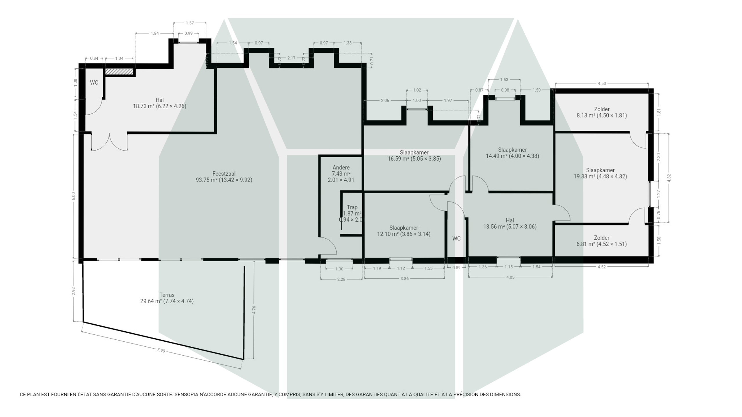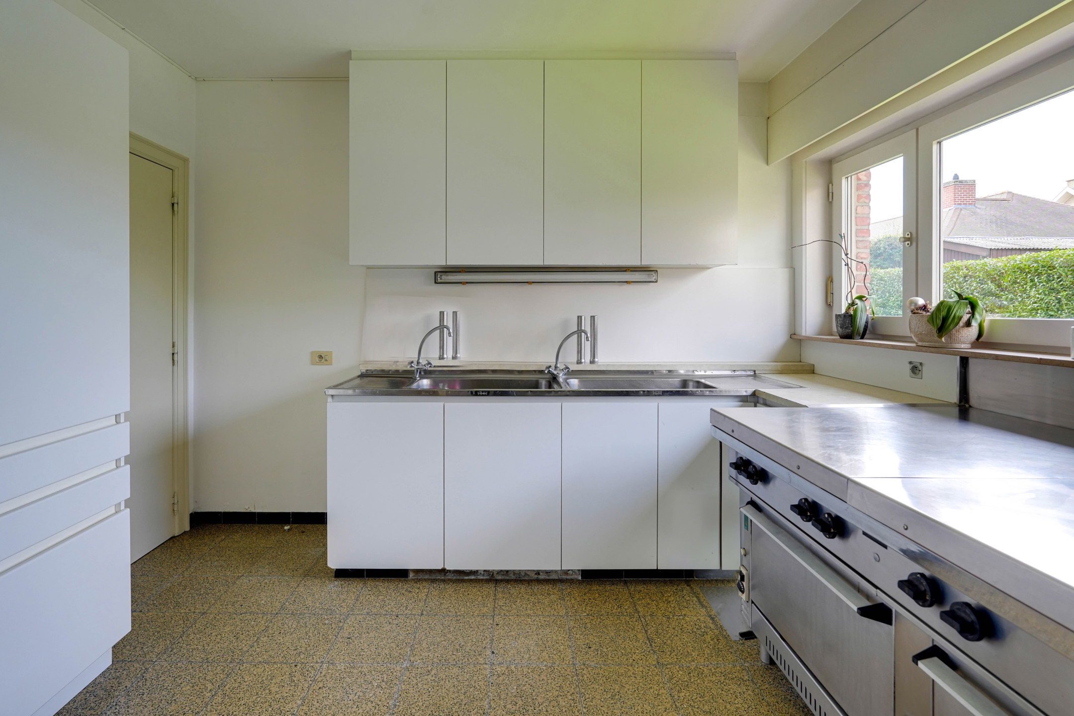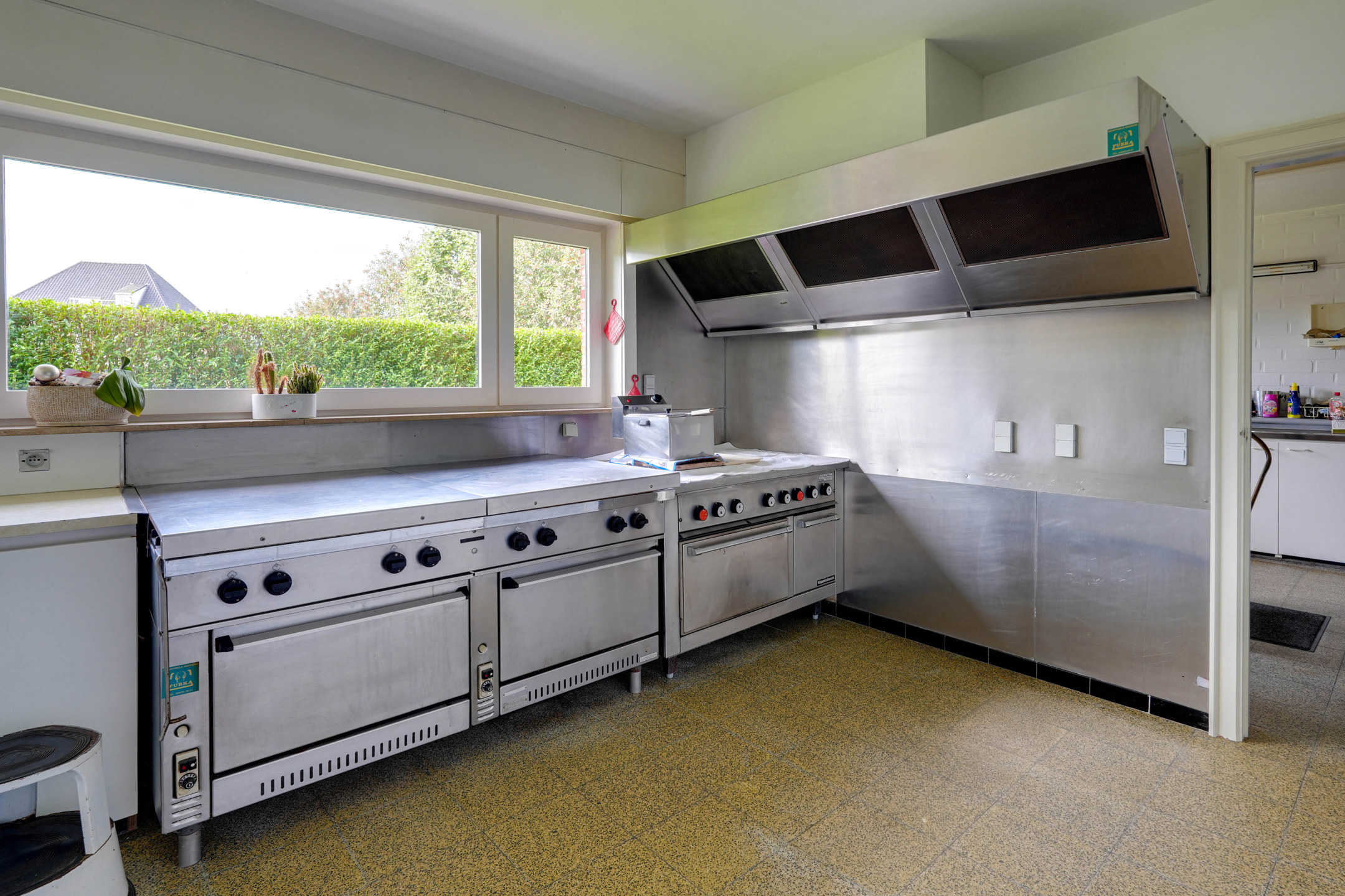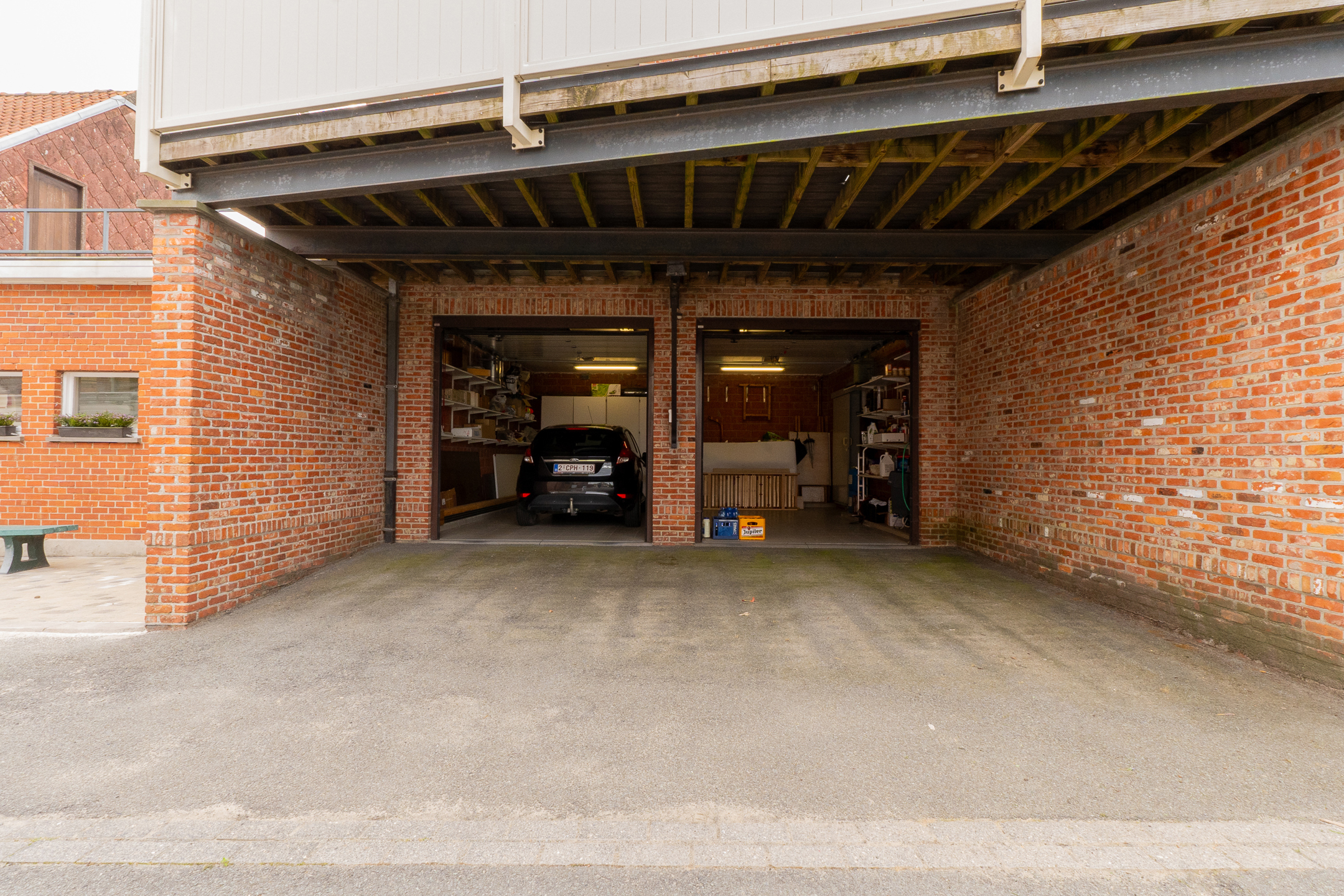 Op het gelijkvloers bevindt zich een 2de inkomhal met gescheiden toiletten voor dames en heren, een kantoorruimte en een bergplaats, momenteel voorzien van (verwijderbare) koelcellen. Verder prijken een dubbele garage met automatische poort, bereikbaar via de uitweg achteraan ter hoogte van de kerk. Op de 1ste verdieping biedt een ruime overloop toegang tot een grote zaal van circa 85 m² die kan worden omgebouwd tot kamers of burelen of speelruimte of …… Een royaal buitenterras achteraan vervolmaakt dit bijzondere deel van de eigendom.