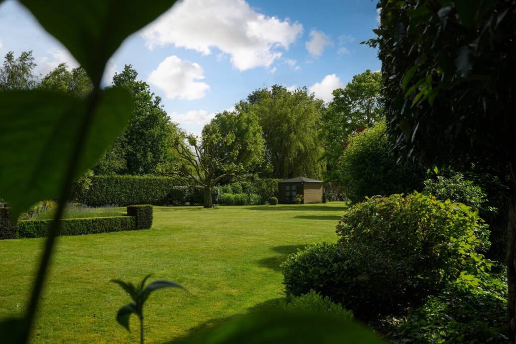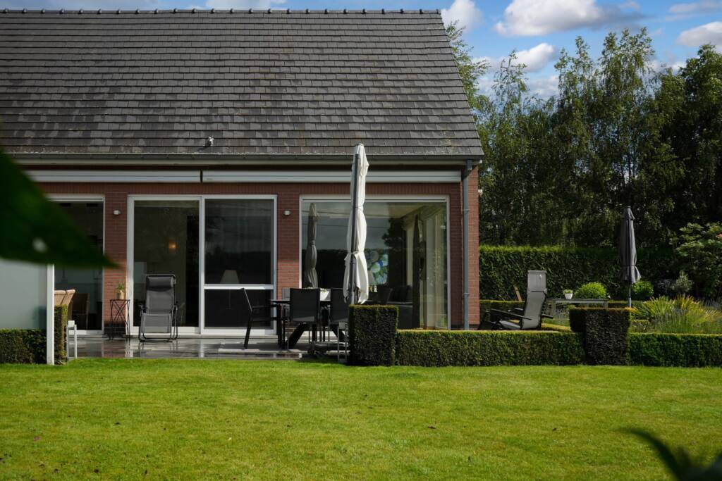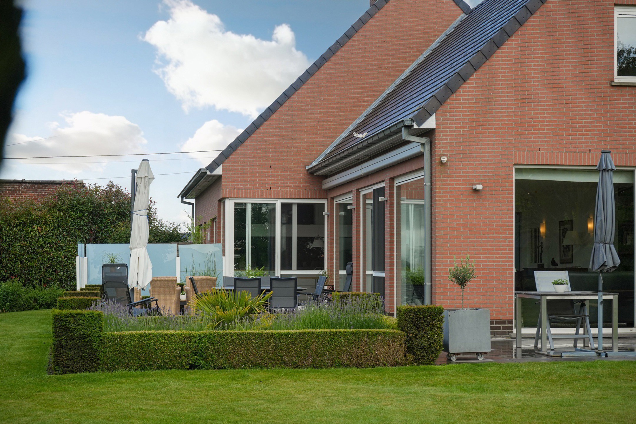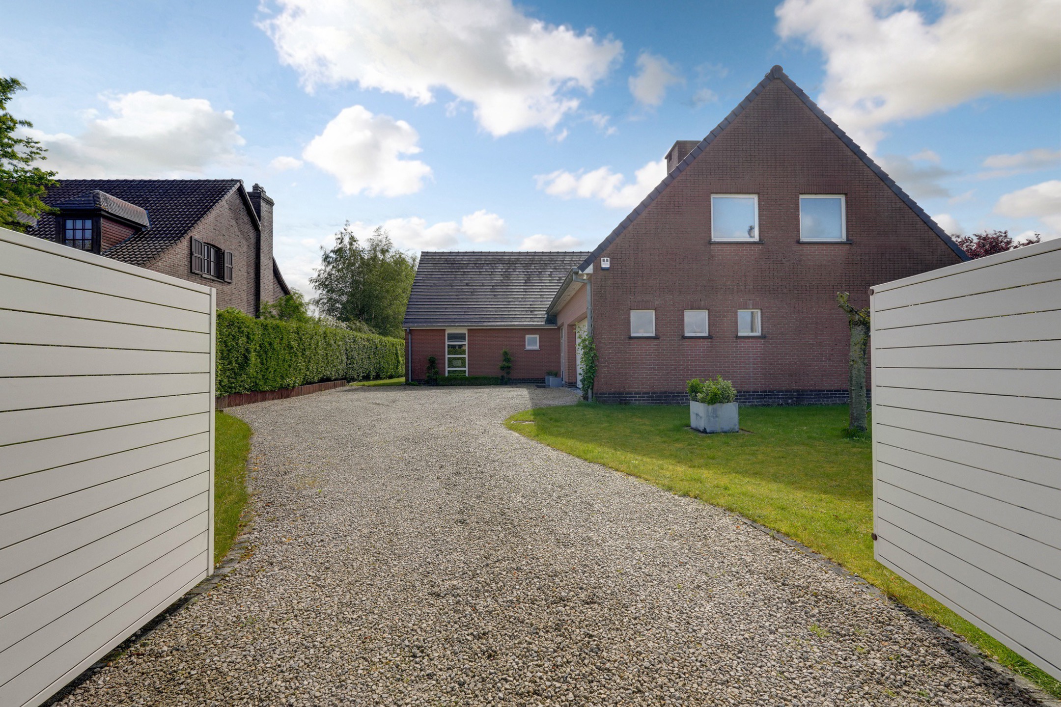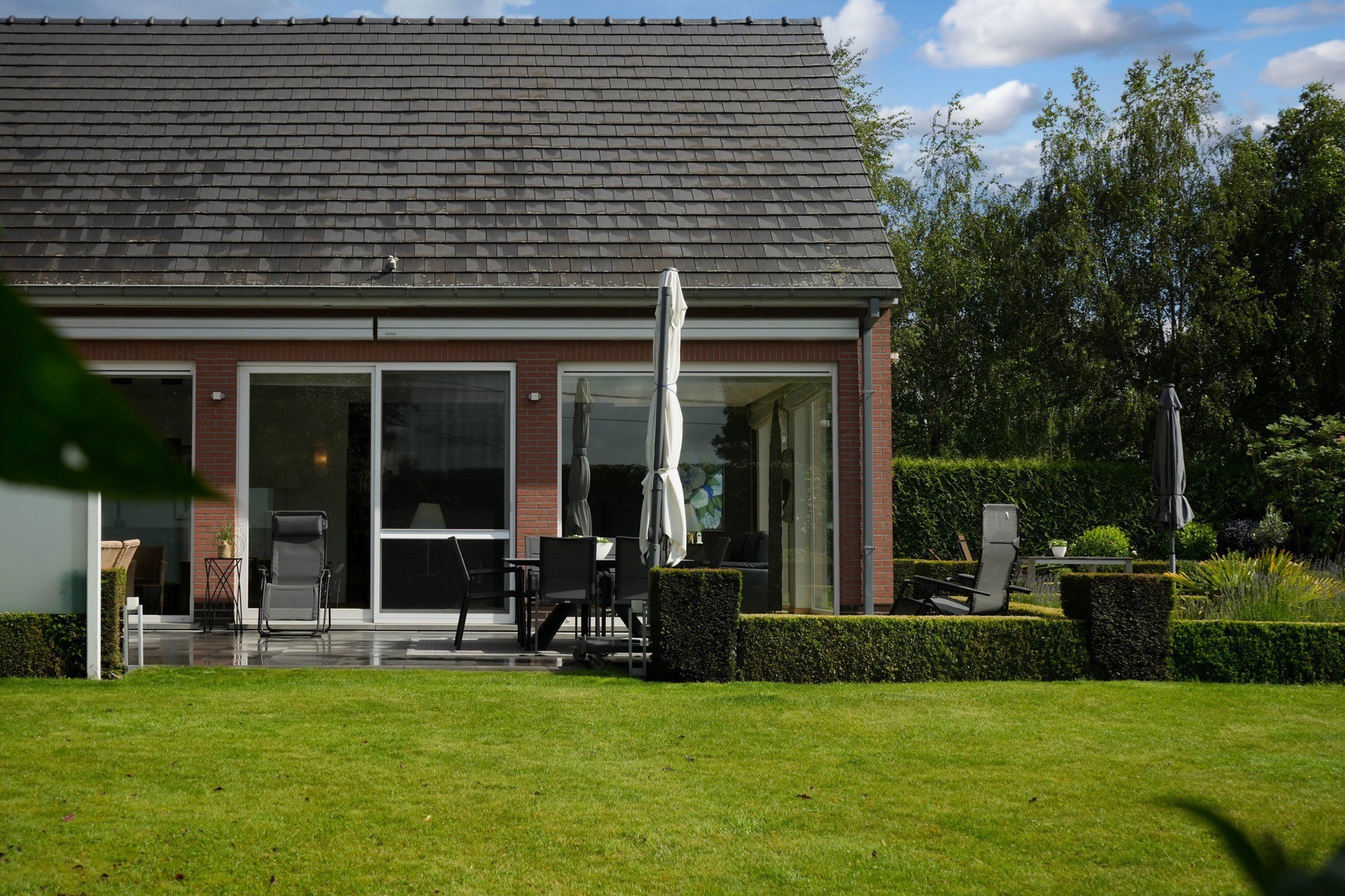 Buiten: Terras, prachtige tuin op het zuidoosten met bomen (1.500 m²) zonder inkijk, houten chalet, gemotoriseerde poort met eigen oprit en meerdere parkeerplaatsen.