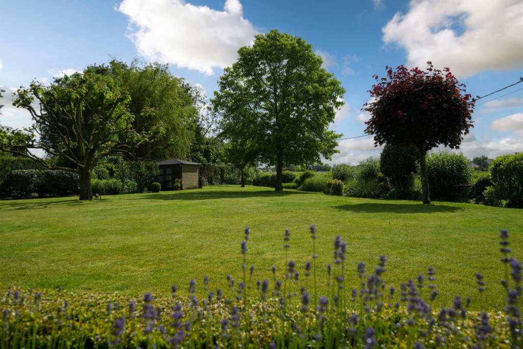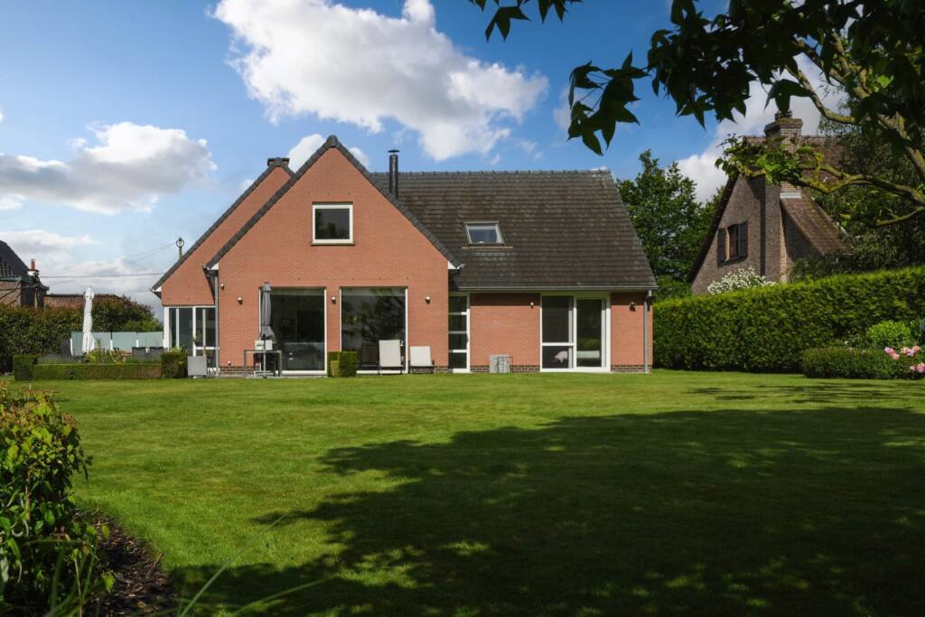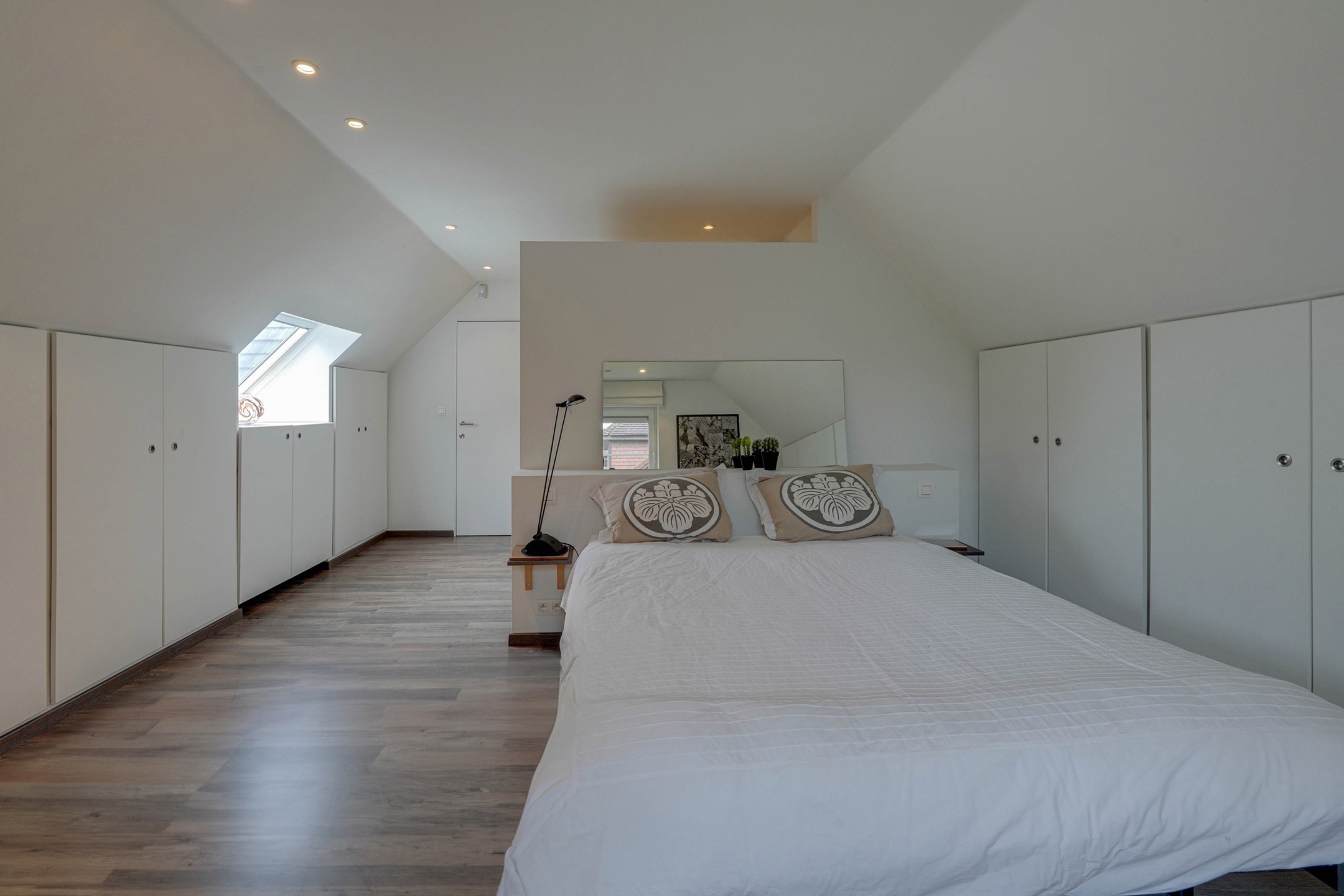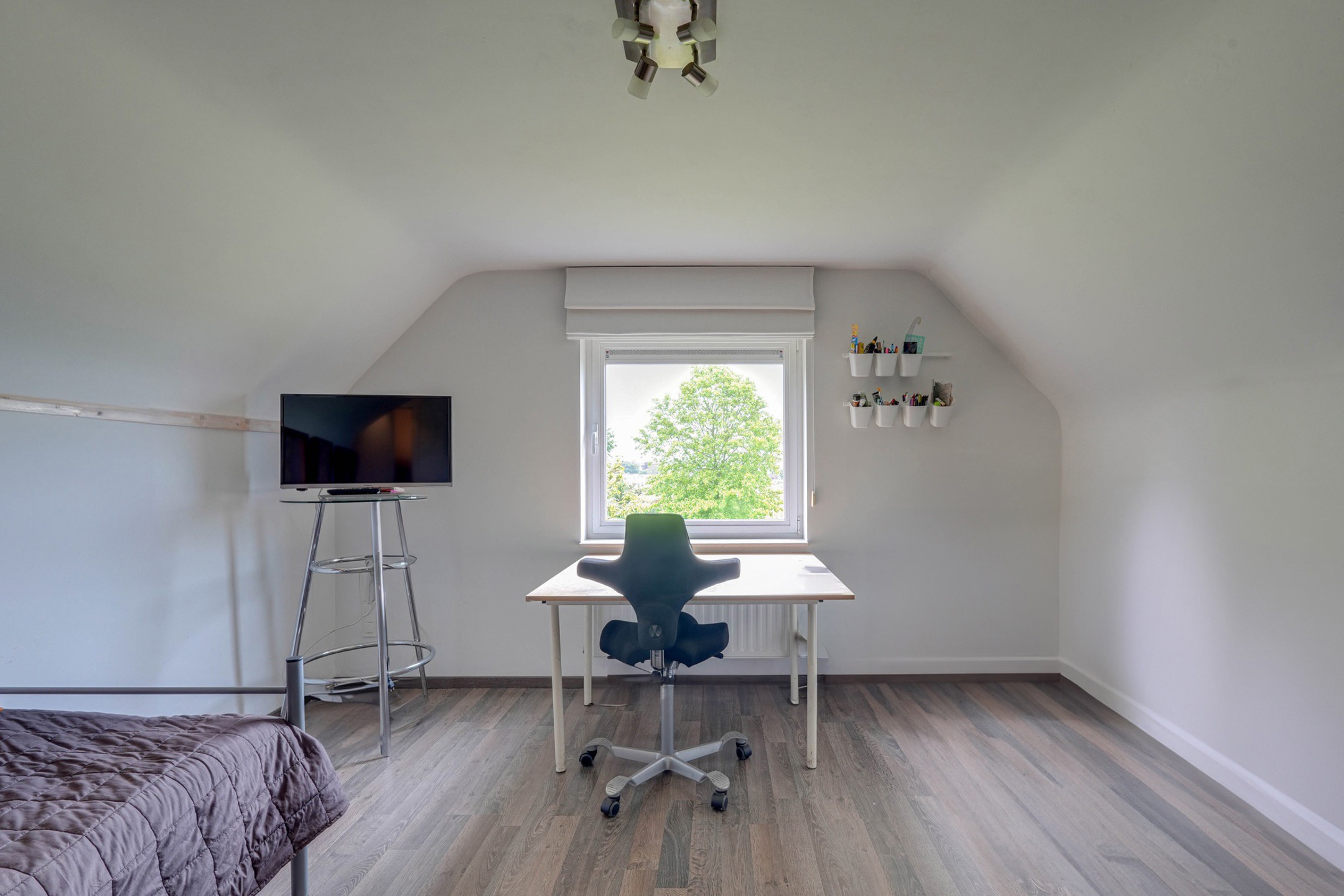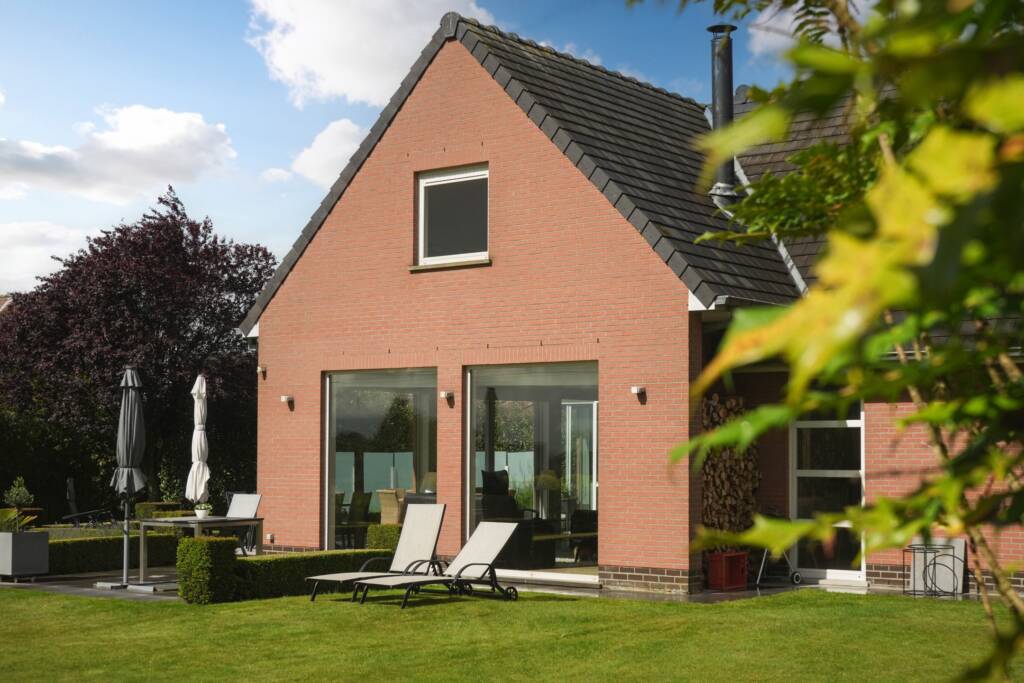 Buiten: Terras, prachtige tuin op het zuidoosten met bomen (1.500 m²) zonder inkijk, houten chalet, gemotoriseerde poort met eigen oprit en meerdere parkeerplaatsen.