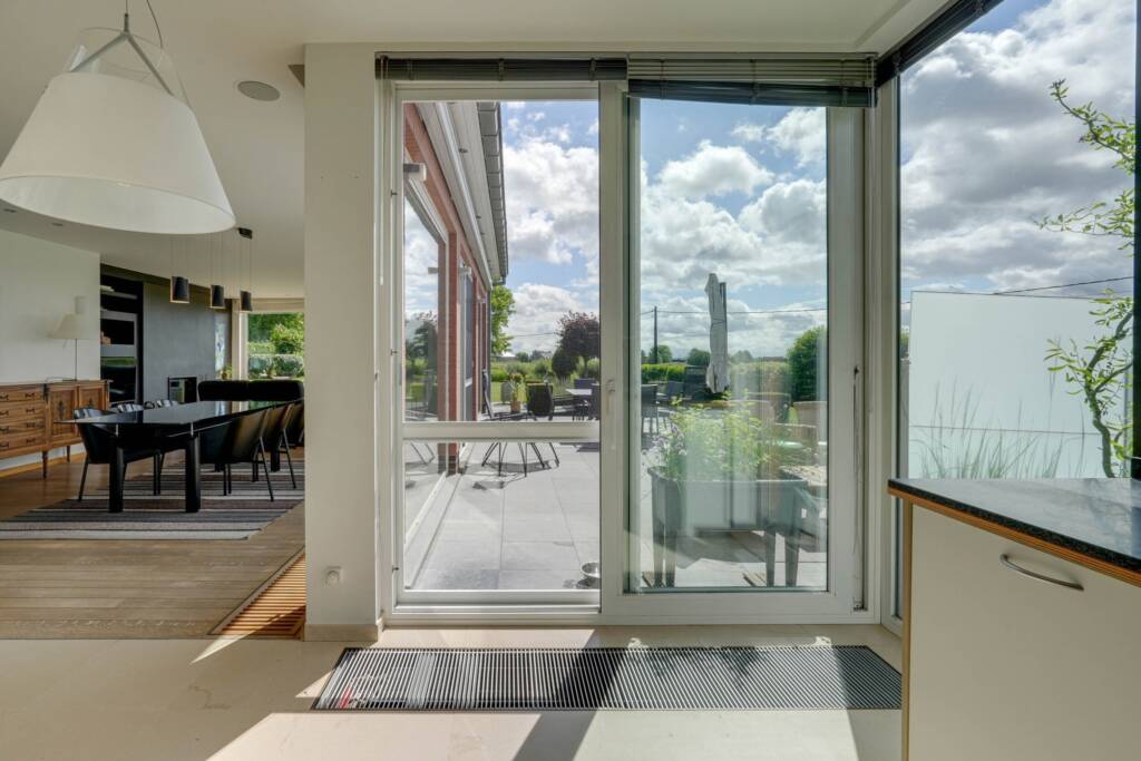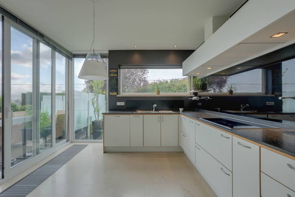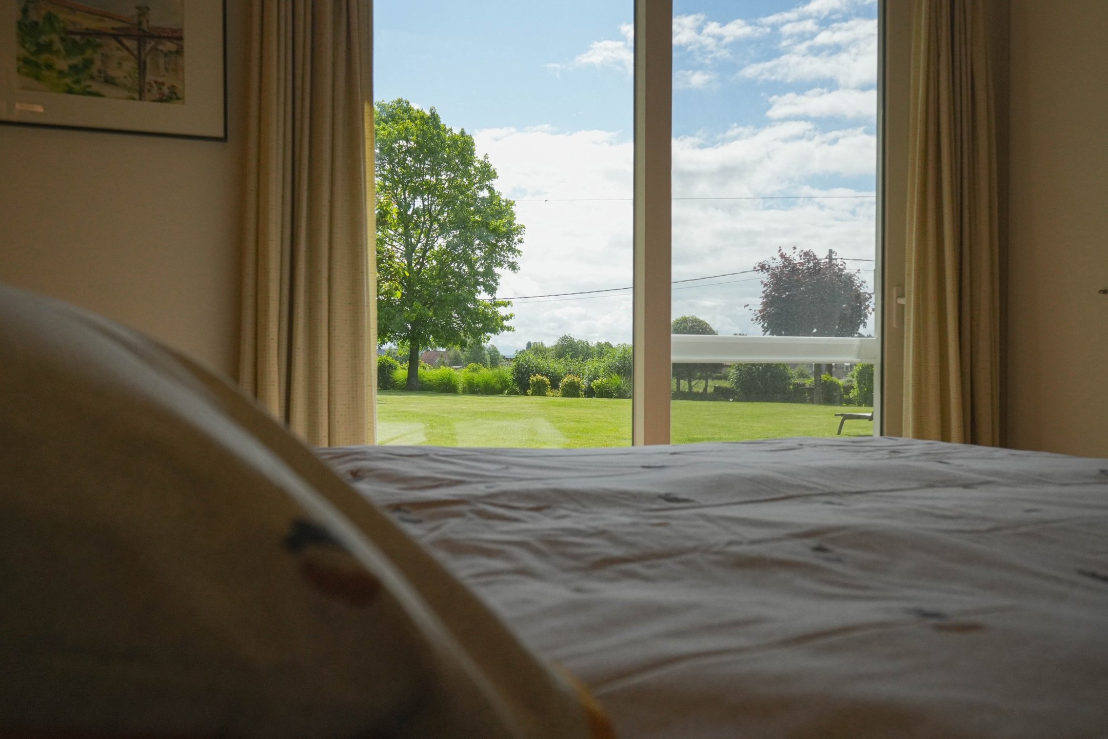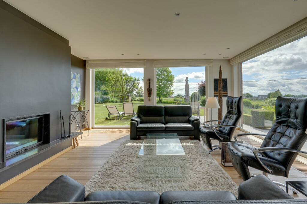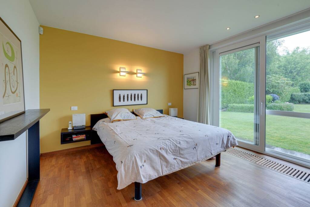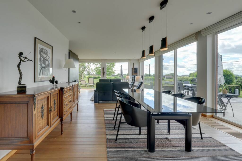 Begane grond: Inkomhal met mooie zichtbare trap, grote, lichte woonkamer (salon & eetkamer) uitgerust met een houtkachel met prachtig uitzicht over de tuin, aangrenzende ingerichte keuken. Master bedroom, bureau en grote dubbele garage met bijkeuken en kelder.