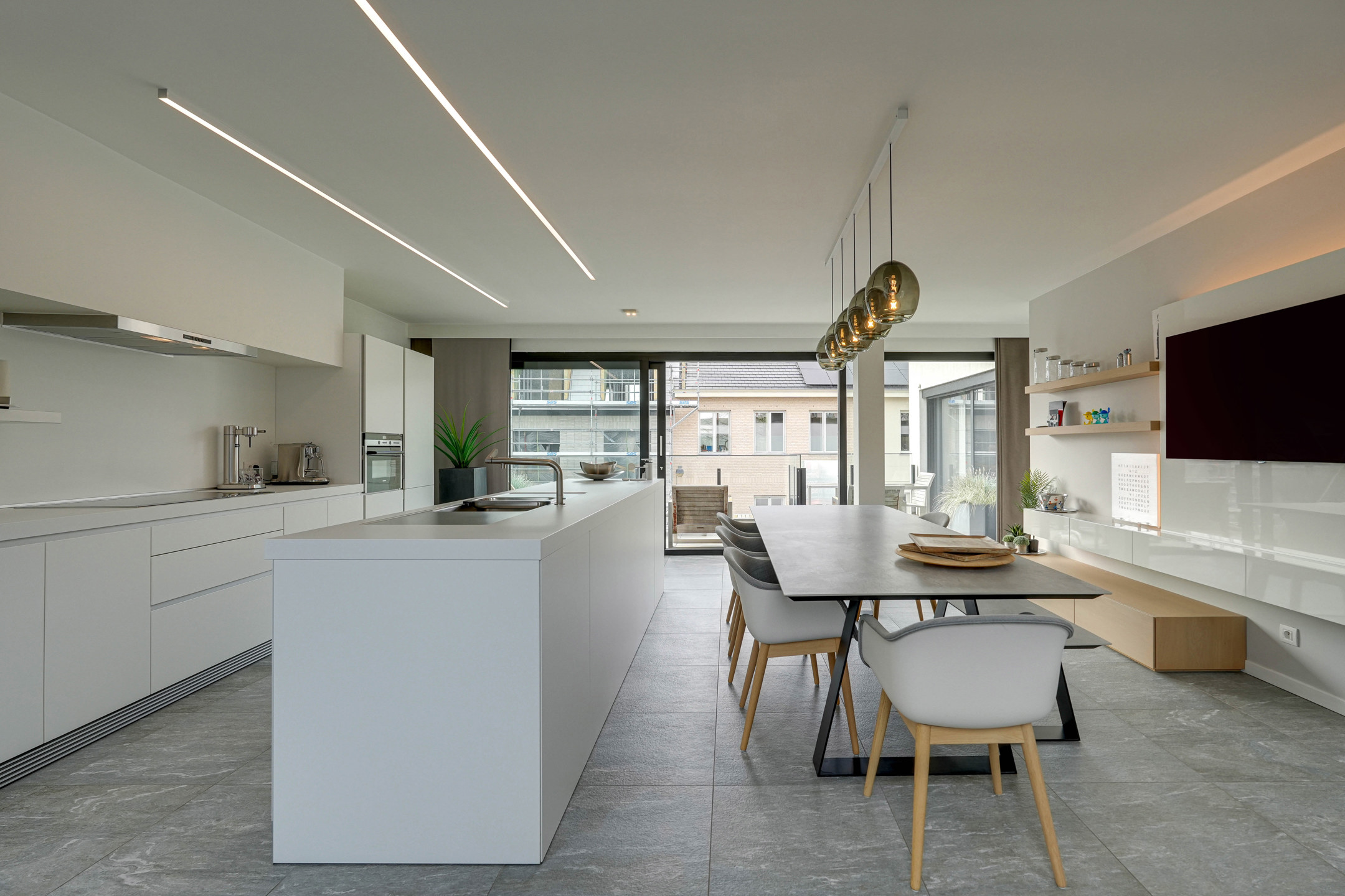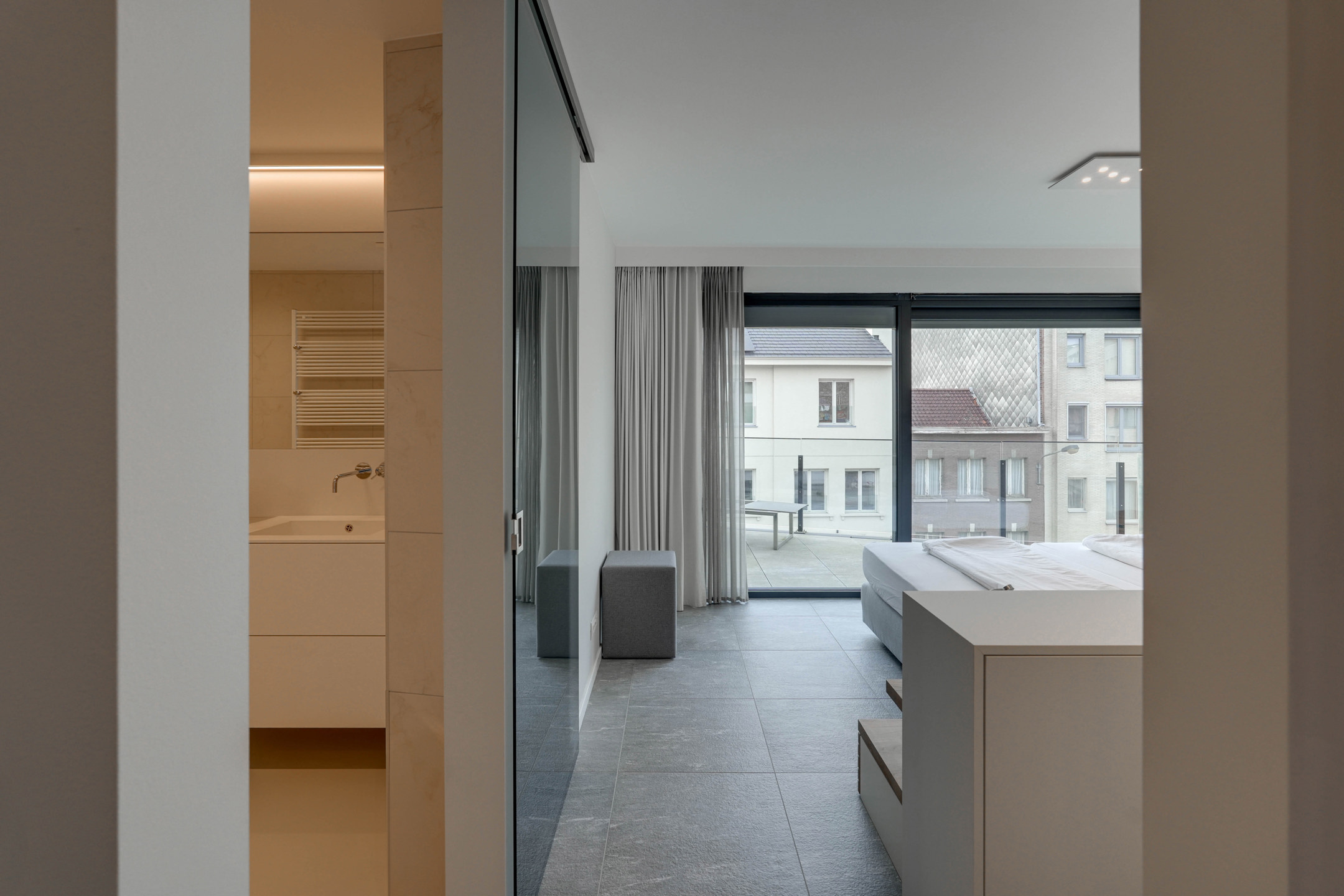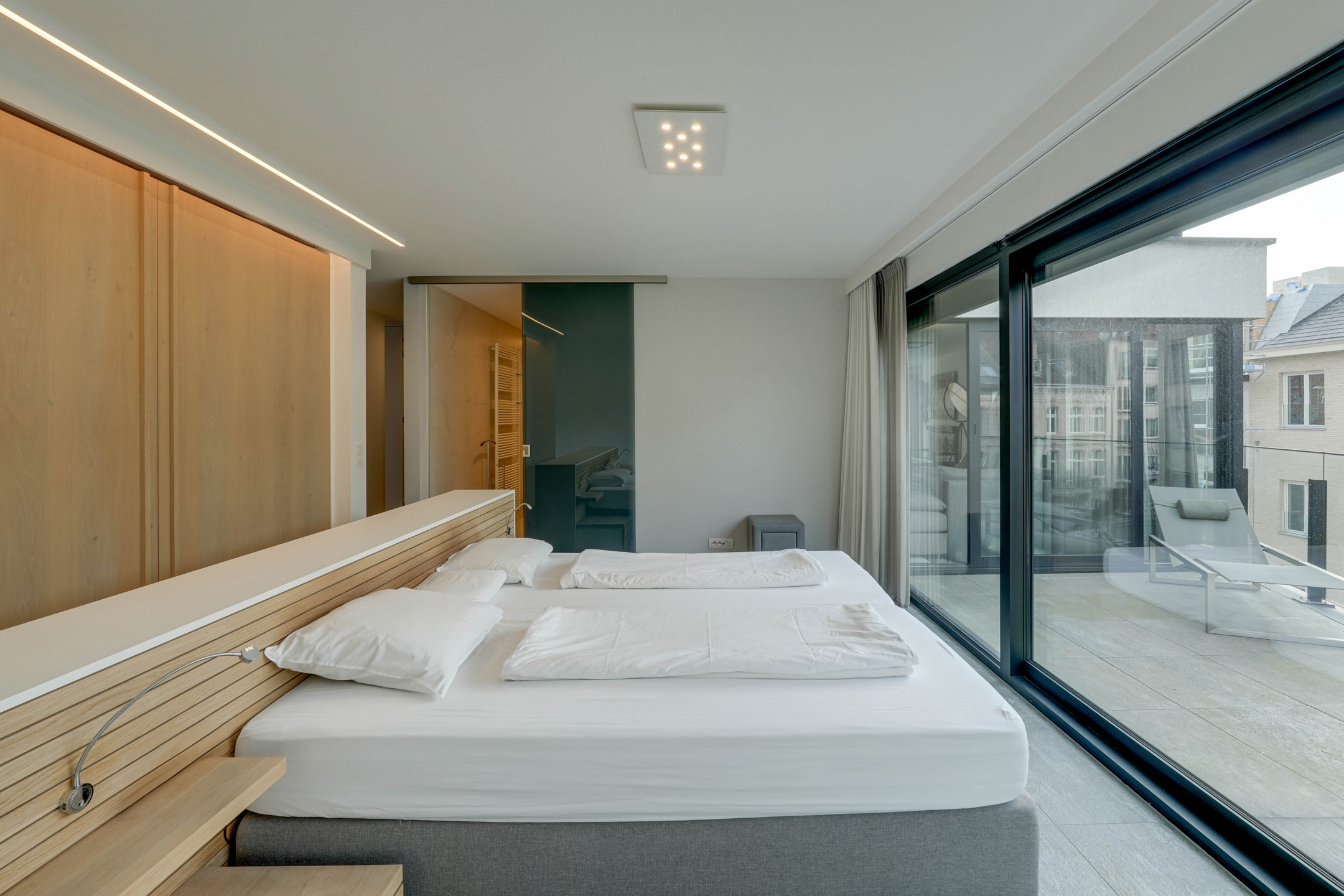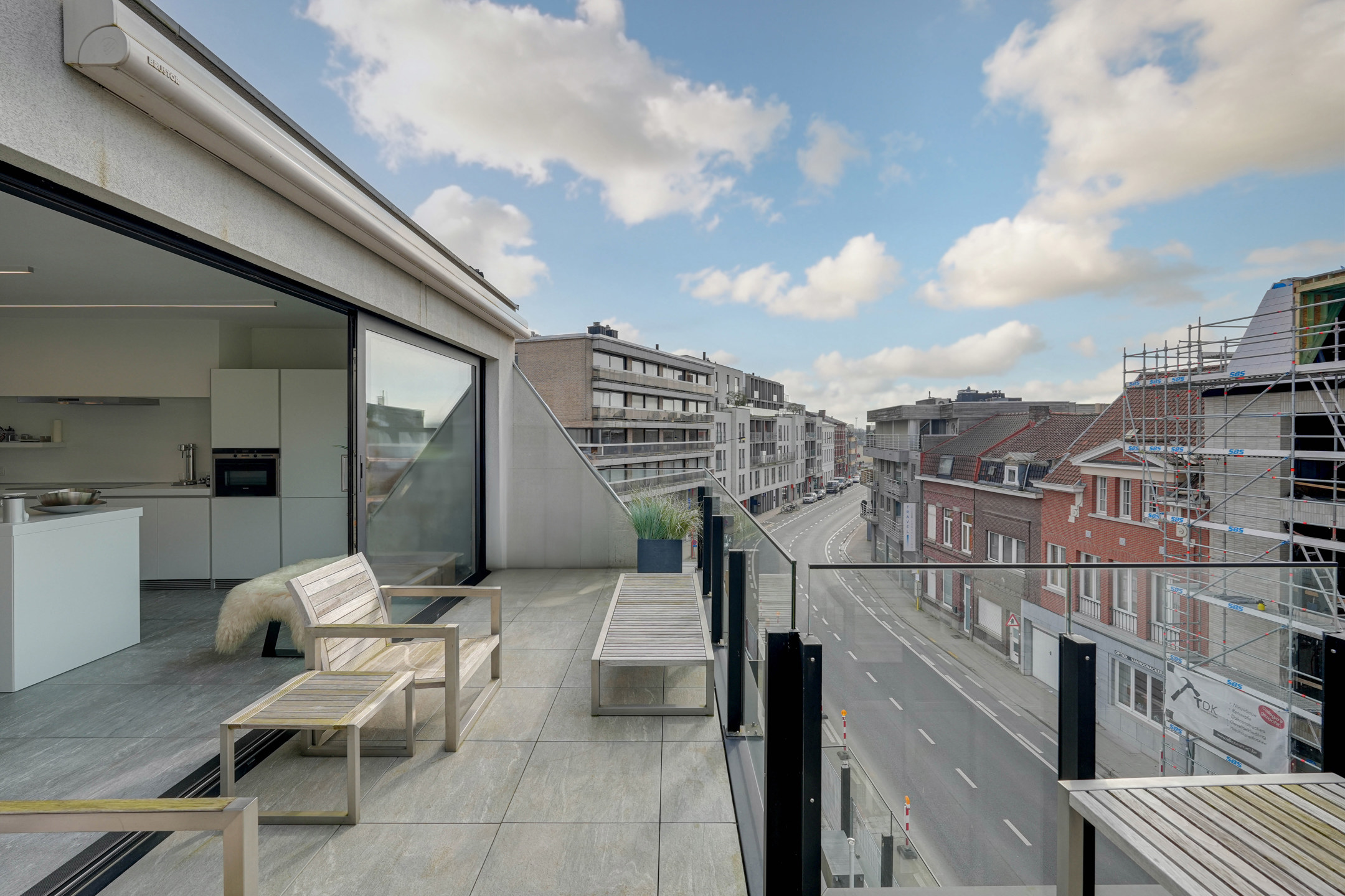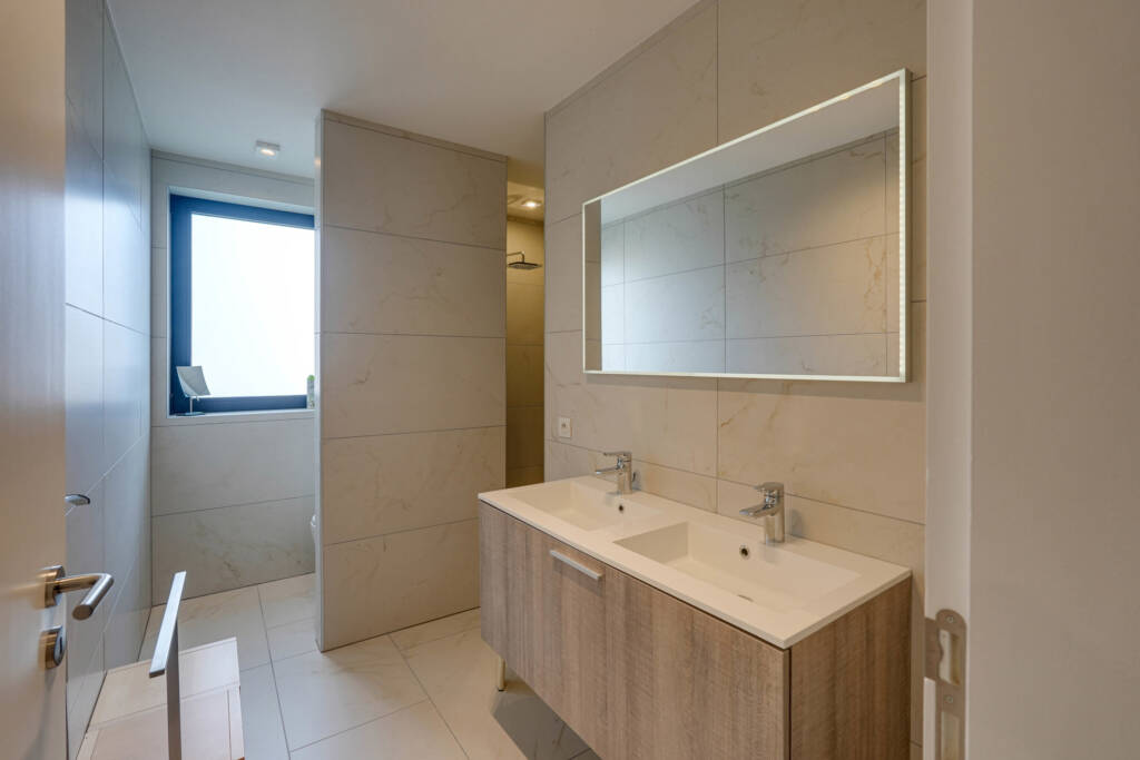 De zonnige terrassen van maar liefst 35 m² tezamen, op het noord-westen gericht, zijn zowel vanuit de keuken als de living bereikbaar en voorzien van screens en een luifel.De afwerking is van topklasse, met aandacht voor elk detail. Bovendien biedt het appartement maximale veiligheid met brandwerende en inbraakveilige deuren. Optioneel zijn er ook 2 ondergrondse parkeerplaatsen (elk €40.000) en een berging (€10.000) beschikbaar.