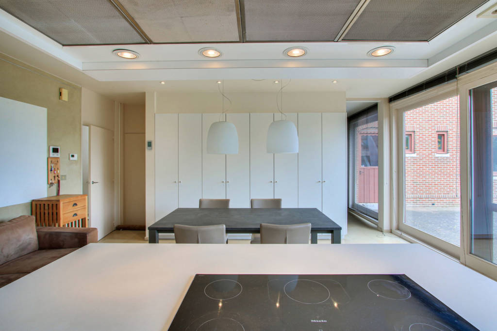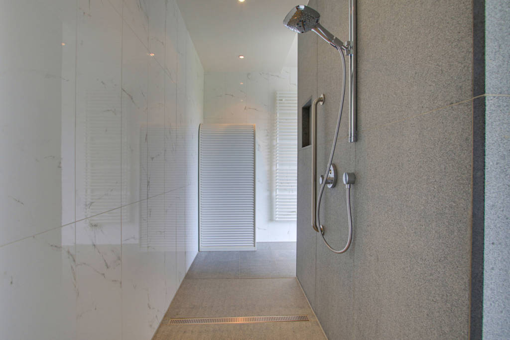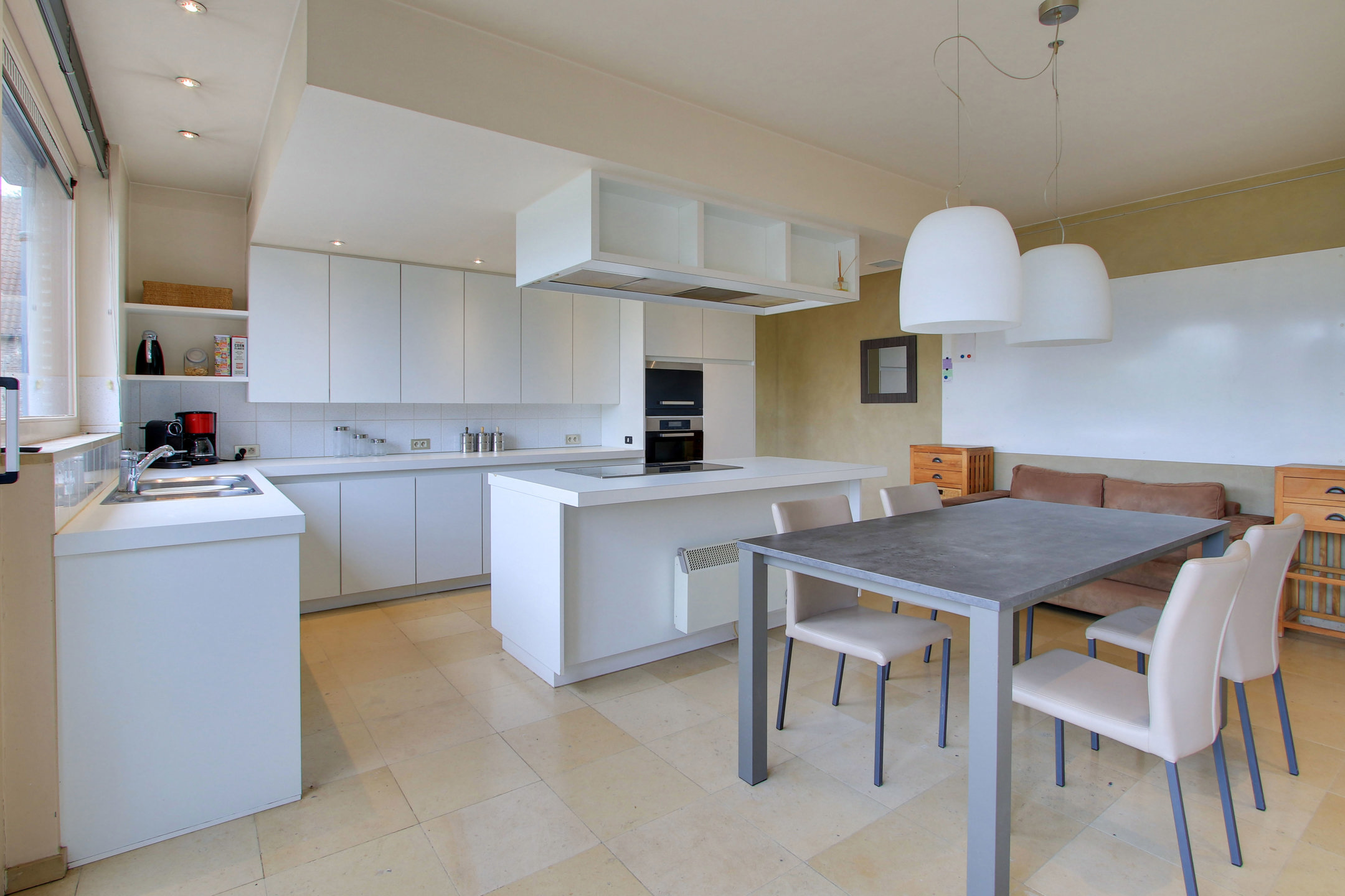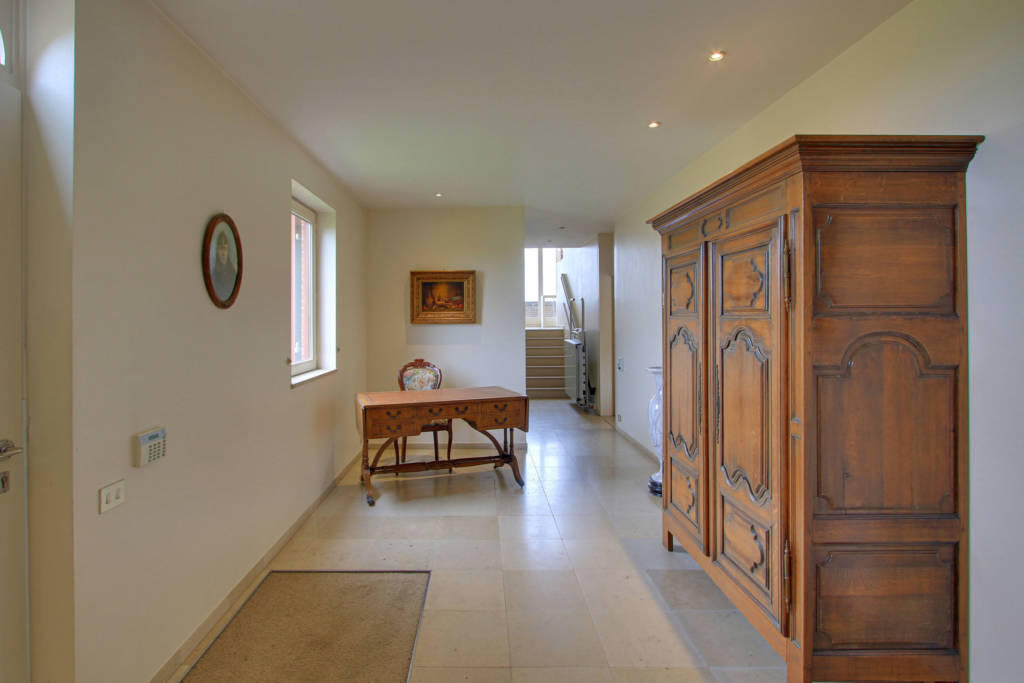 Een ruime inkomhal, een living met open haard en grote raampartijen gericht op de tuin, een zeer ruime leefkeuken met ingebouwde keukentoestellen van Miele, proper afgewerkt met witte kasten. De gelijkvloerse verdieping bestaat voornamelijk uit licht beige natuursteen, schuifdeuren en schuiframen met lamellen.