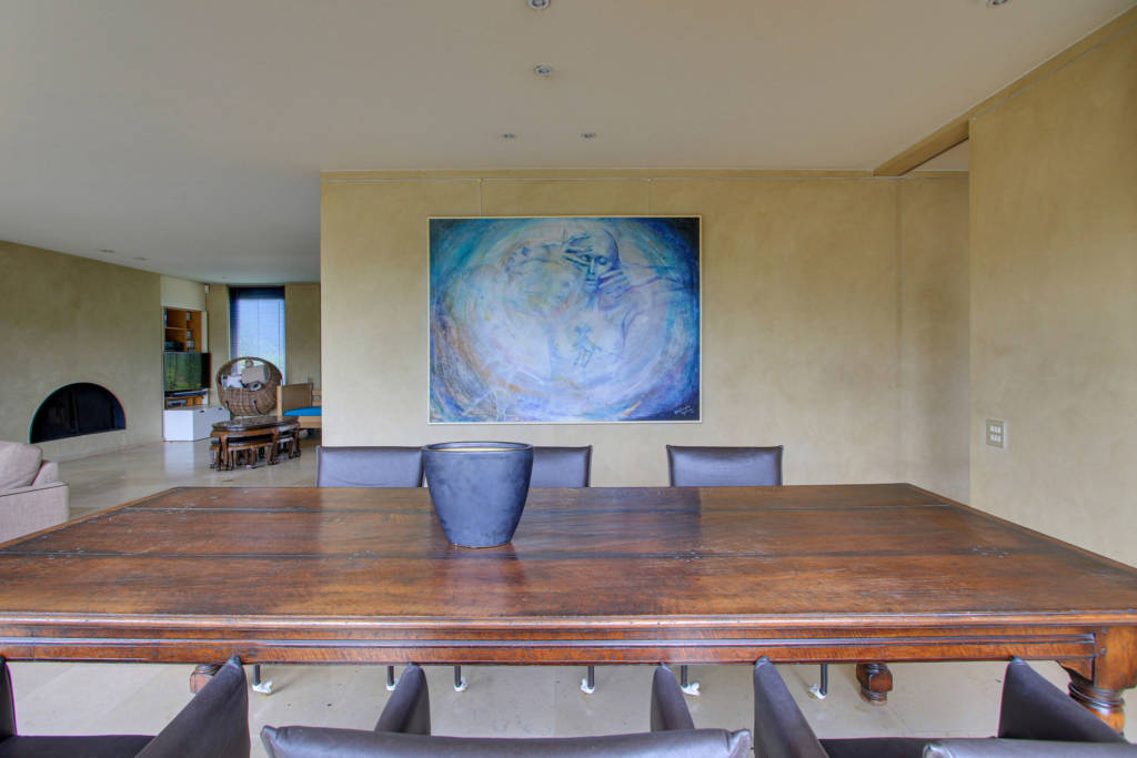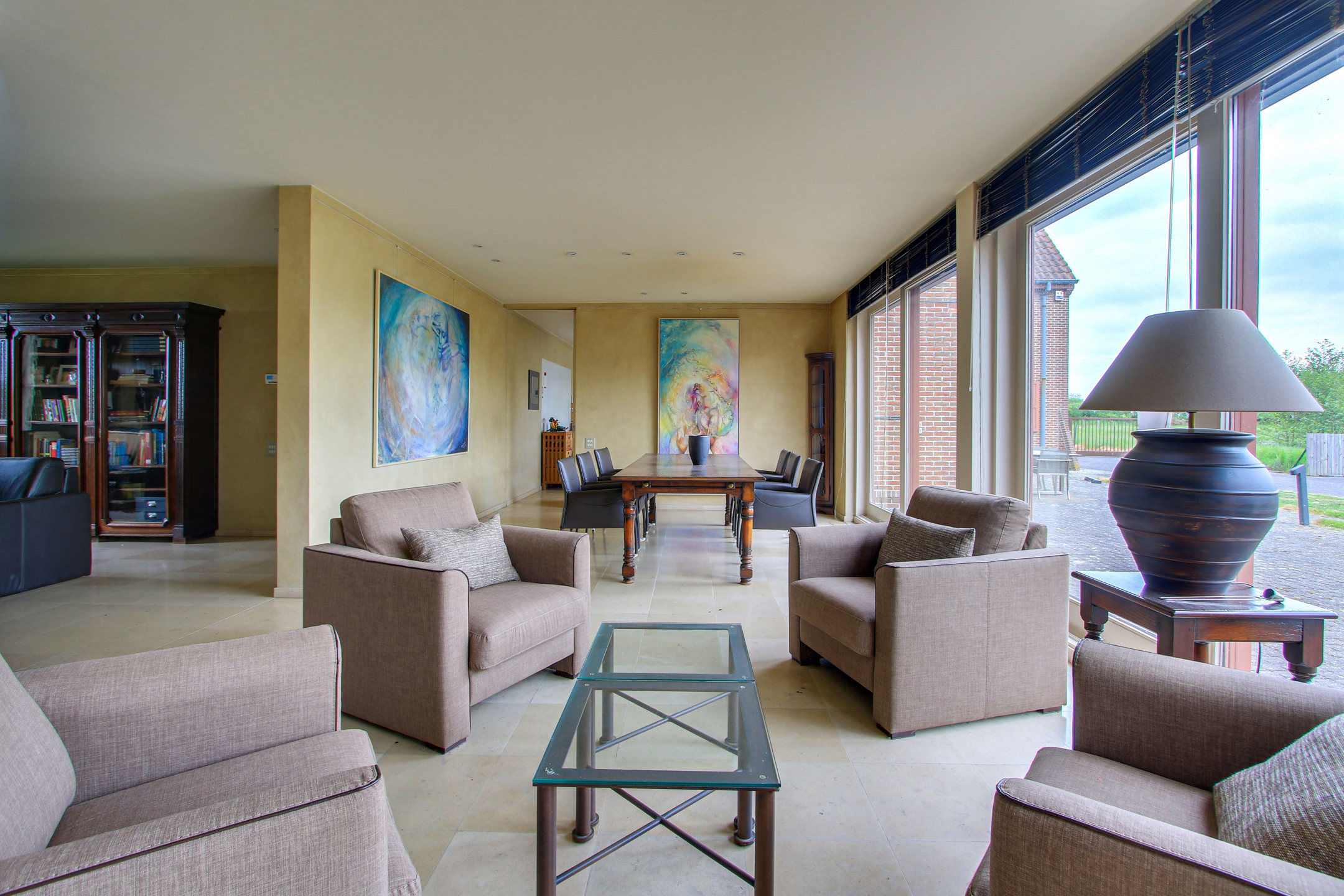 Hetgeen er meteen opvalt bij dit eigendom zijn wellicht de zeer grote raampartijen met dubbele beglazing in hout, die een rustgevend zicht bieden op de tuin met vijver en zwembad.