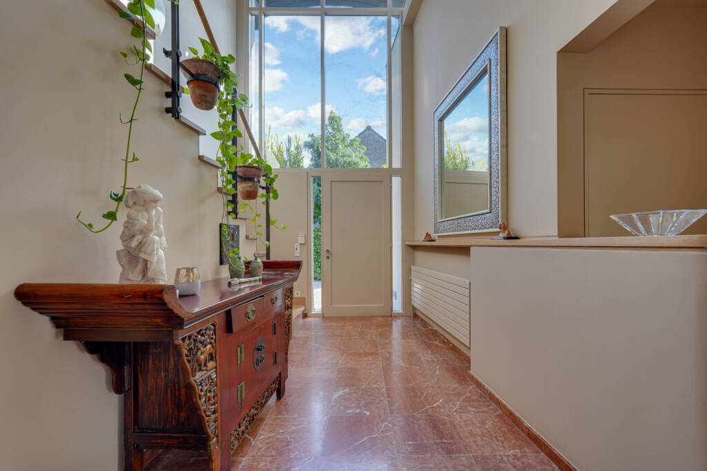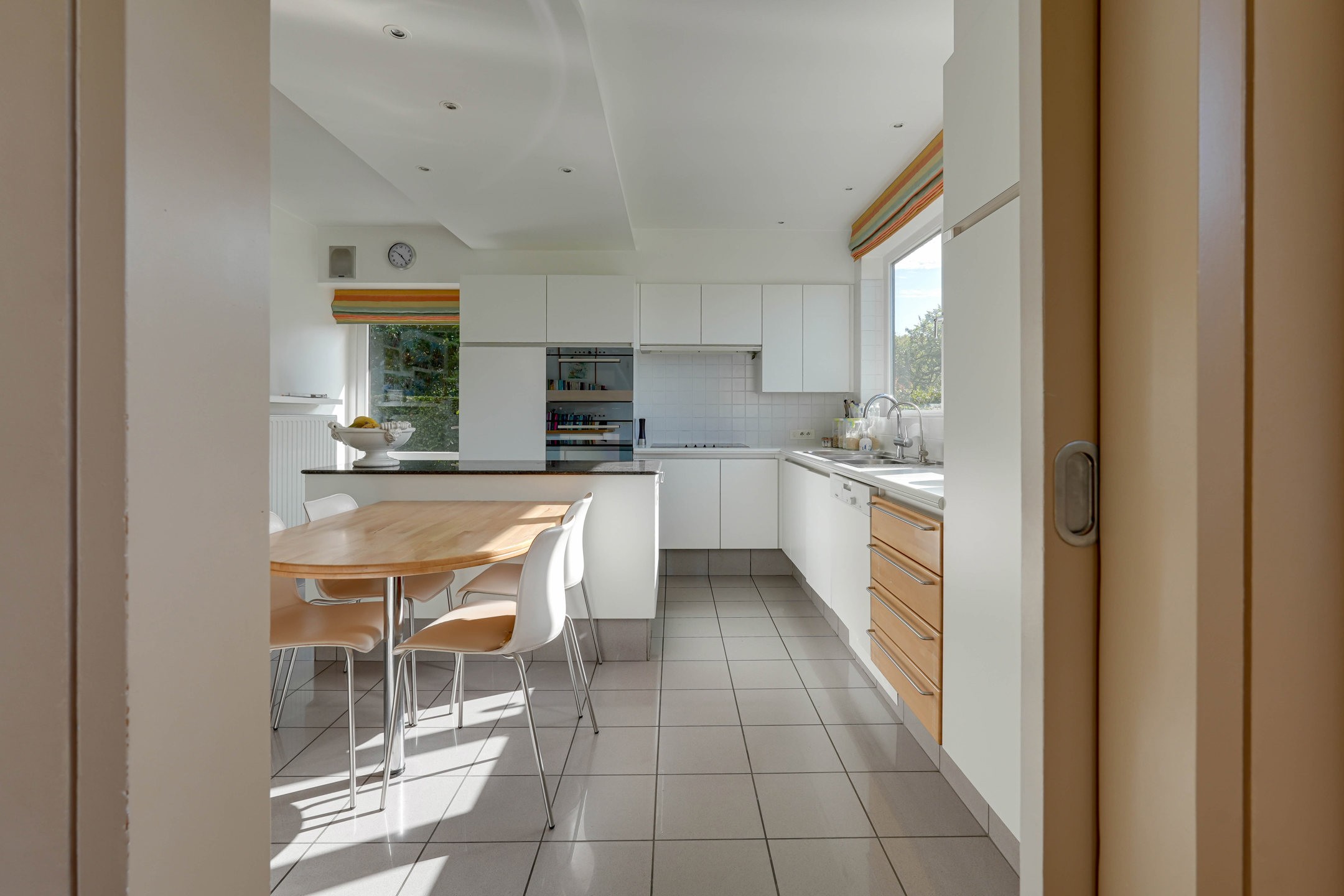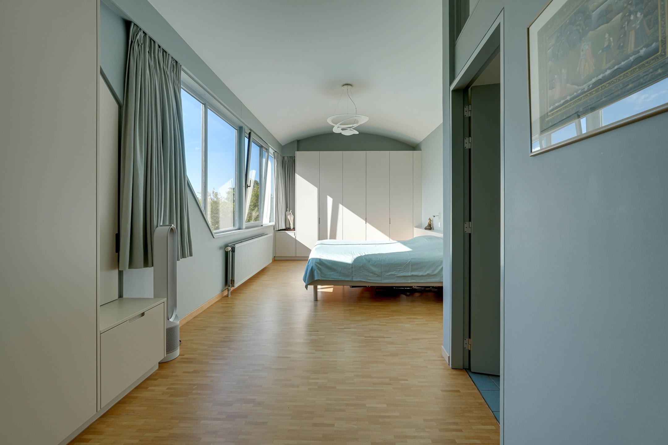 Op het gelijkvloers komt u binnen via een ruime inkomhal met bureel en bergruimte. De lichtrijke leefruimte, met zicht op de tuin en het water, geeft een gevoel van rust. De keuken is volledig ingericht met een eethoek, en op de bovenverdieping bevinden zich vijf slaapkamers, waaronder twee zeer ruime en een master suite met badkamer en dressing. Daarnaast is er een tweede badkamer voor de kinderen.