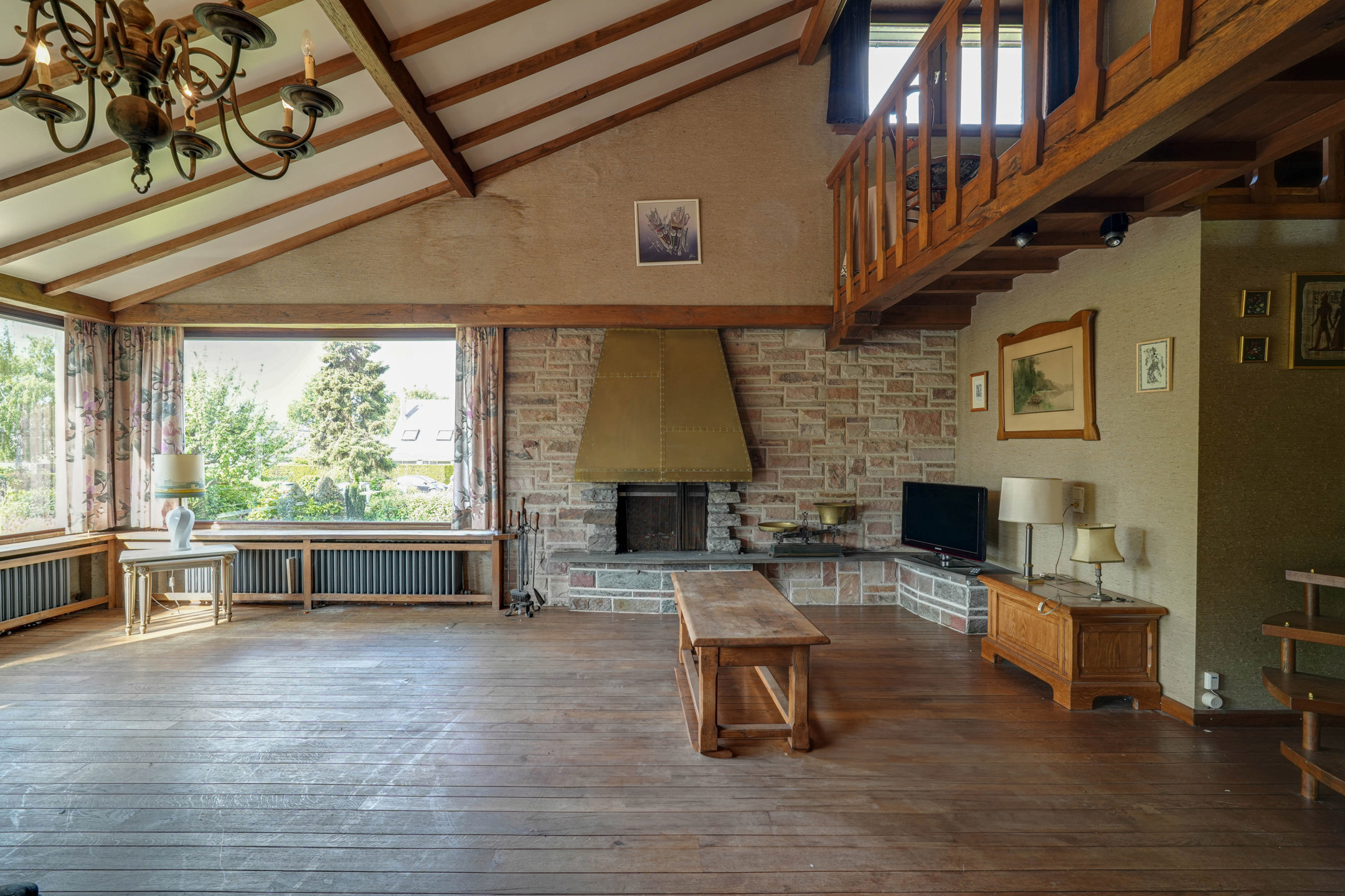 Het huis heeft grote ramen en een open nok in de woonkamer, wat zorgt voor een gezellige sfeer en een uniek karakter.