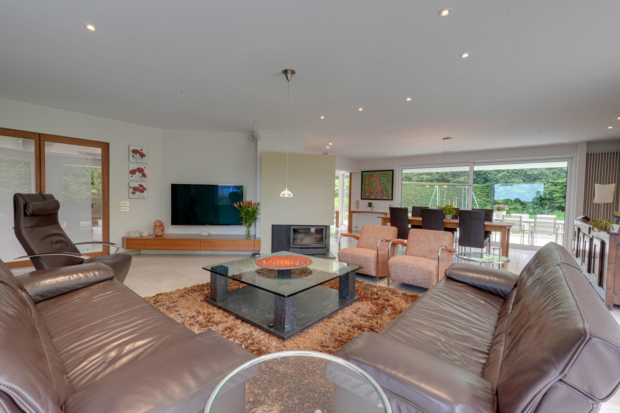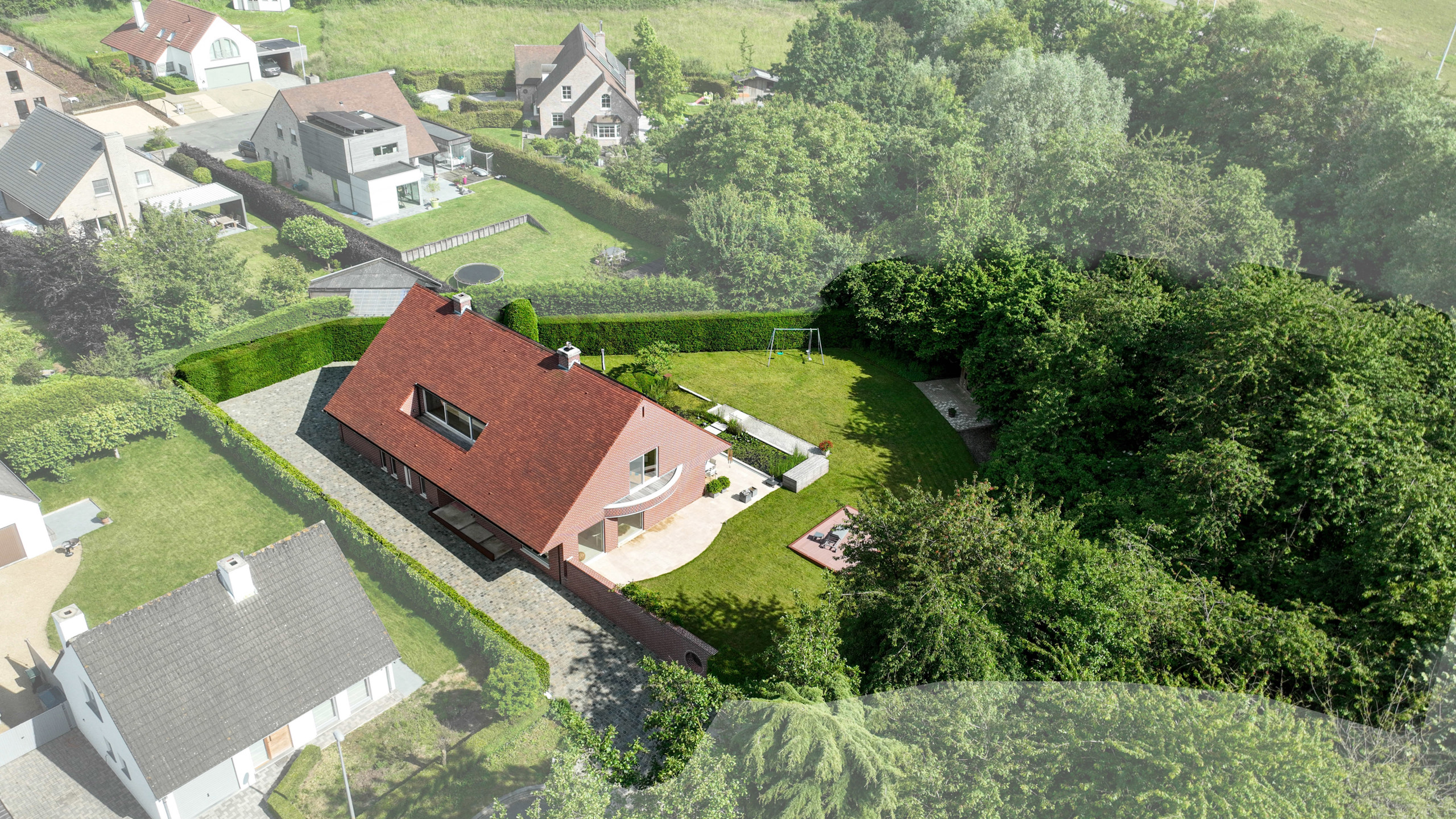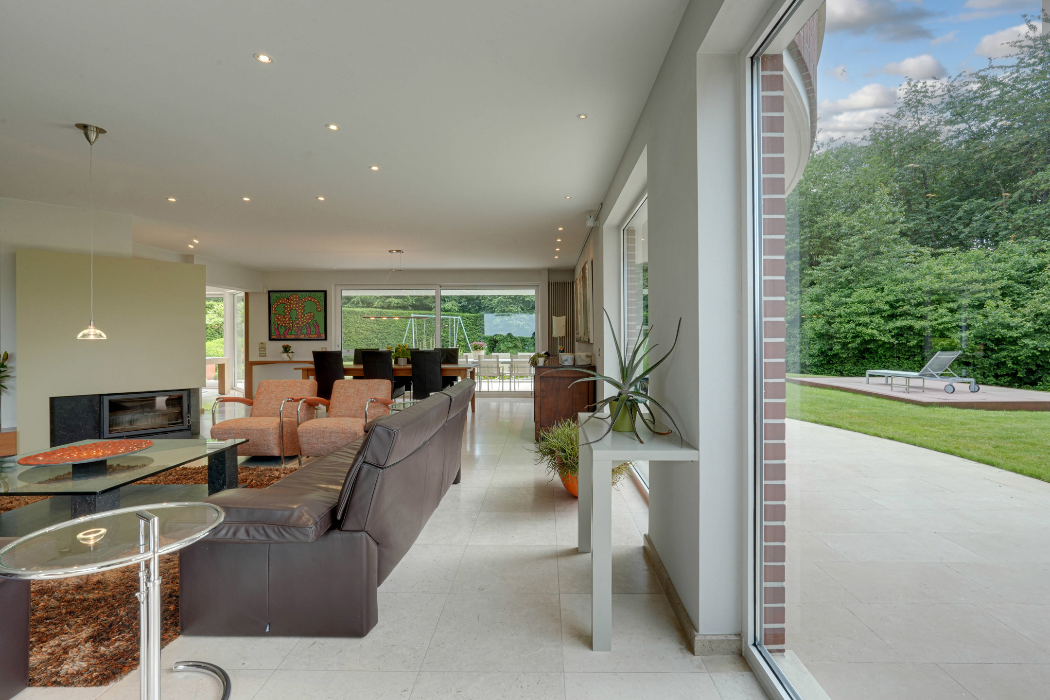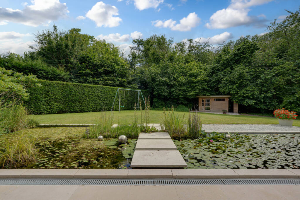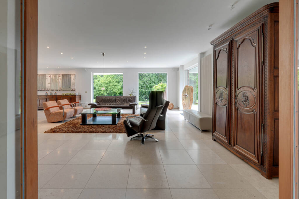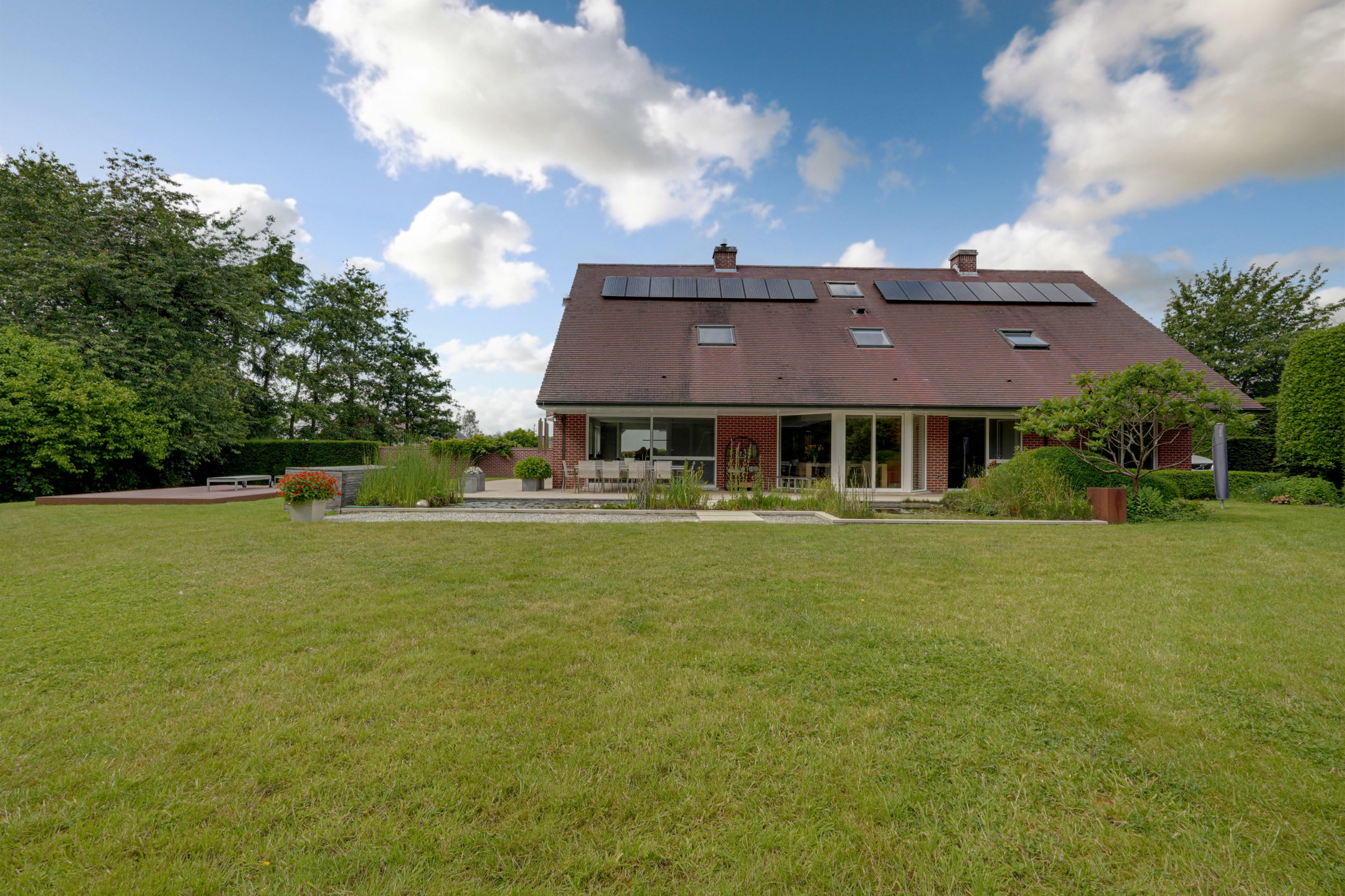 Een ruime oprit en voldoende parkeermogelijkheden verwelkomen u bij de aankomst. De entree betreedt u via een prachtige, lichtrijke hal die toegang biedt aan de woonkamer, keuken, berging, gastentoilet, vestiaire, kantoor en garage.Een dubbele glazen deur leidt u naar de woonkamer, waar de sfeervolle leefruimte uitkijkt op zowel de zij- als achtertuin. Een gezellige houtkachel zorgt voor extra warmte en gezelligheid in de winter. Naast de zithoek bevindt zich een ruime eetkamer met uitzicht op het terras, de vijver en de weelderige tuin.