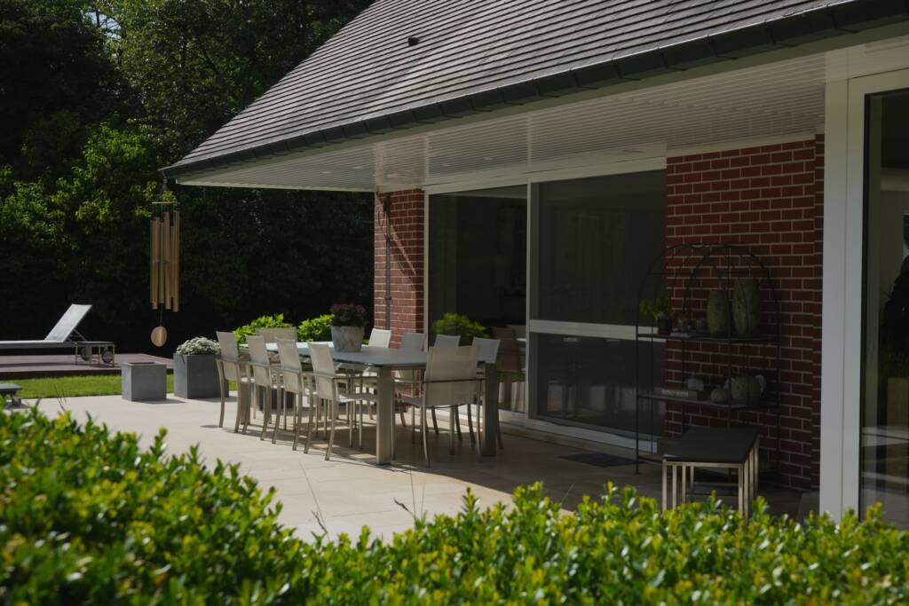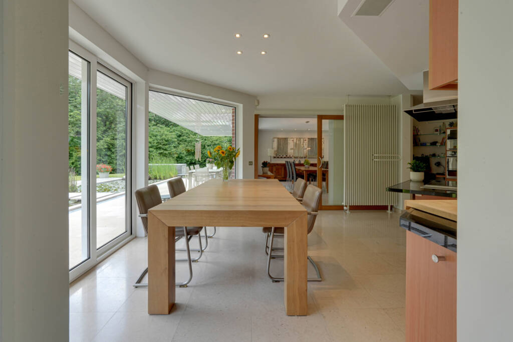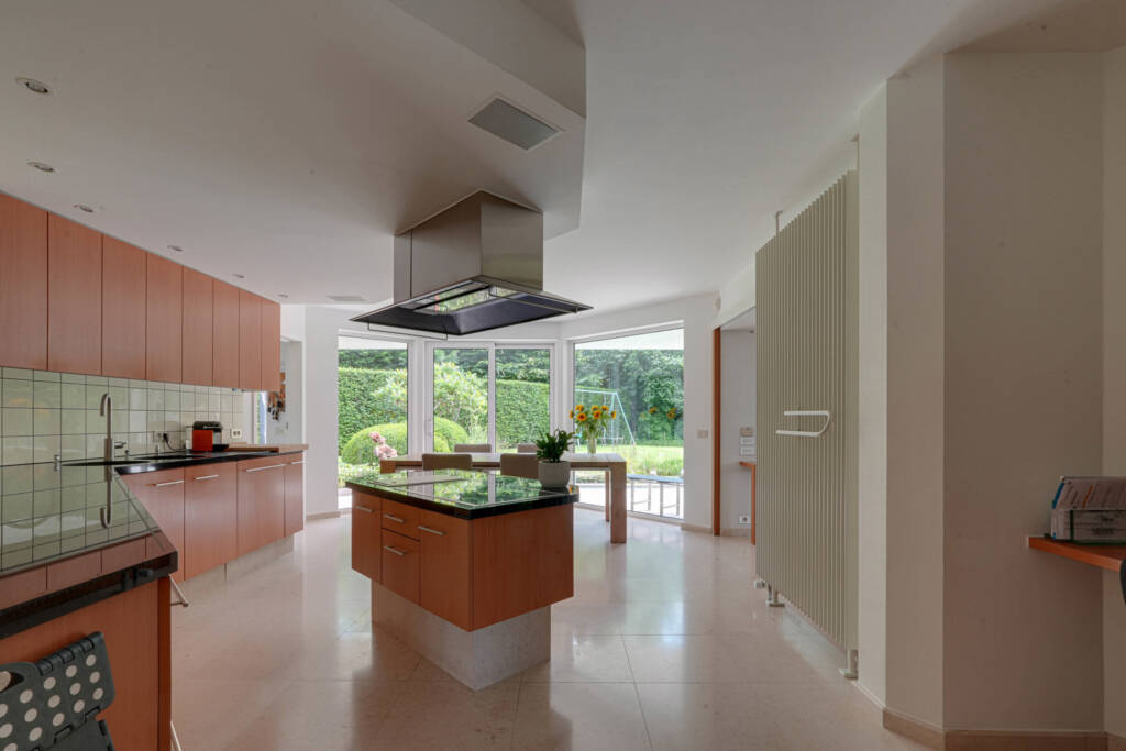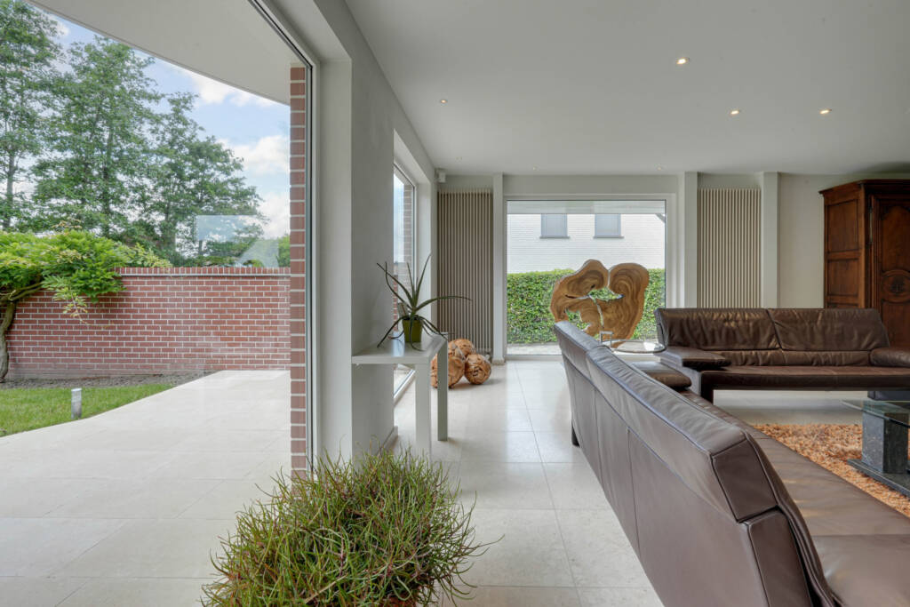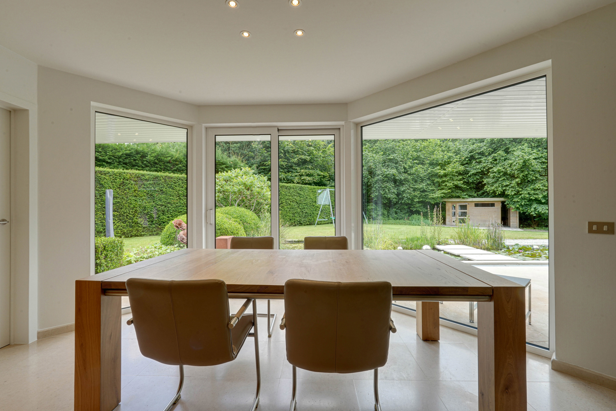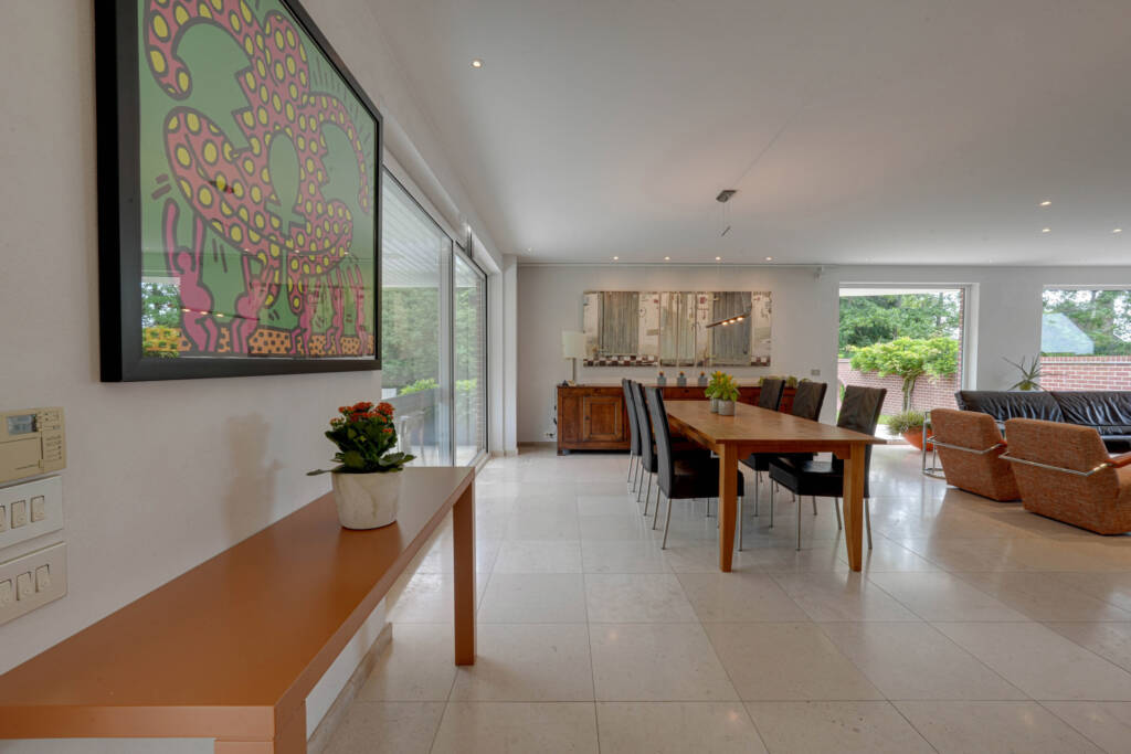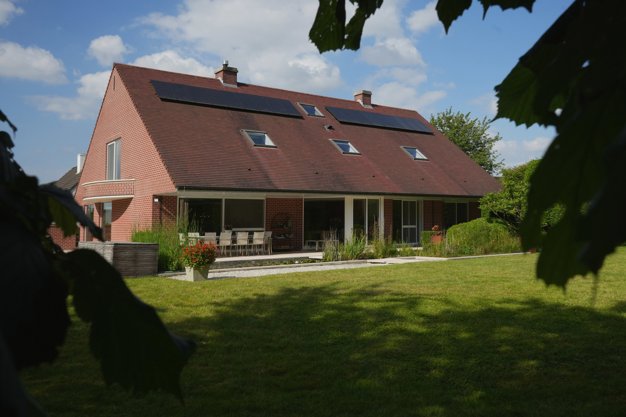 Een ruime oprit en voldoende parkeermogelijkheden verwelkomen u bij de aankomst. De entree betreedt u via een prachtige, lichtrijke hal die toegang biedt aan de woonkamer, keuken, berging, gastentoilet, vestiaire, kantoor en garage.Een dubbele glazen deur leidt u naar de woonkamer, waar de sfeervolle leefruimte uitkijkt op zowel de zij- als achtertuin. Een gezellige houtkachel zorgt voor extra warmte en gezelligheid in de winter. Naast de zithoek bevindt zich een ruime eetkamer met uitzicht op het terras, de vijver en de weelderige tuin.