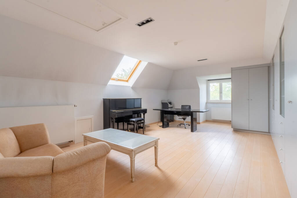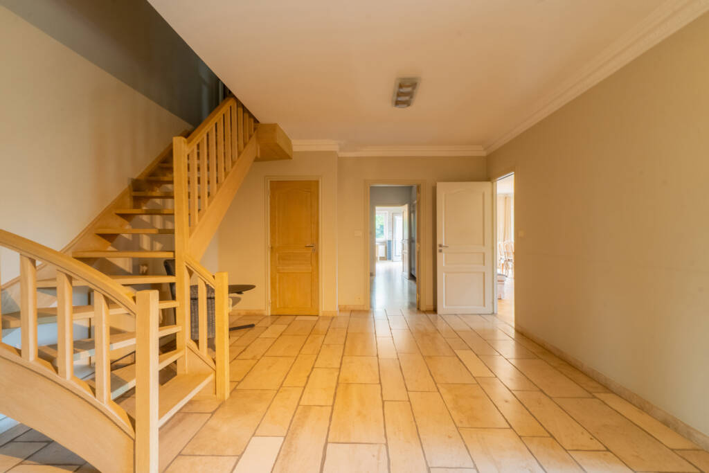 Inkom met luxueuse houten trap, bureel, master bedroom op gelijkvloers van 15m² met ruim ingerichte badkamer (bad, douche, lavabo meubel …)
