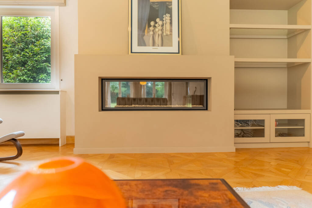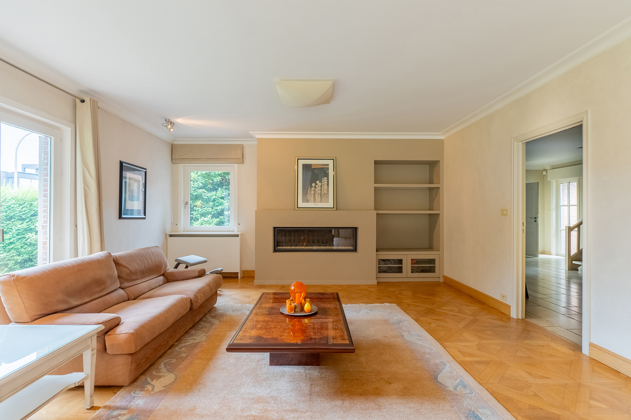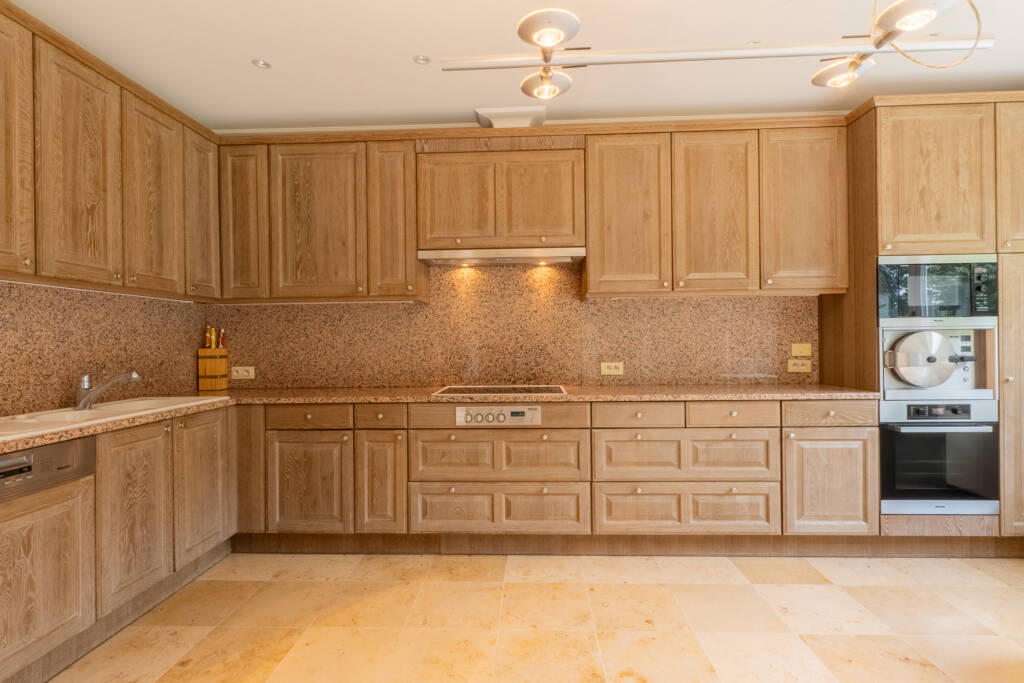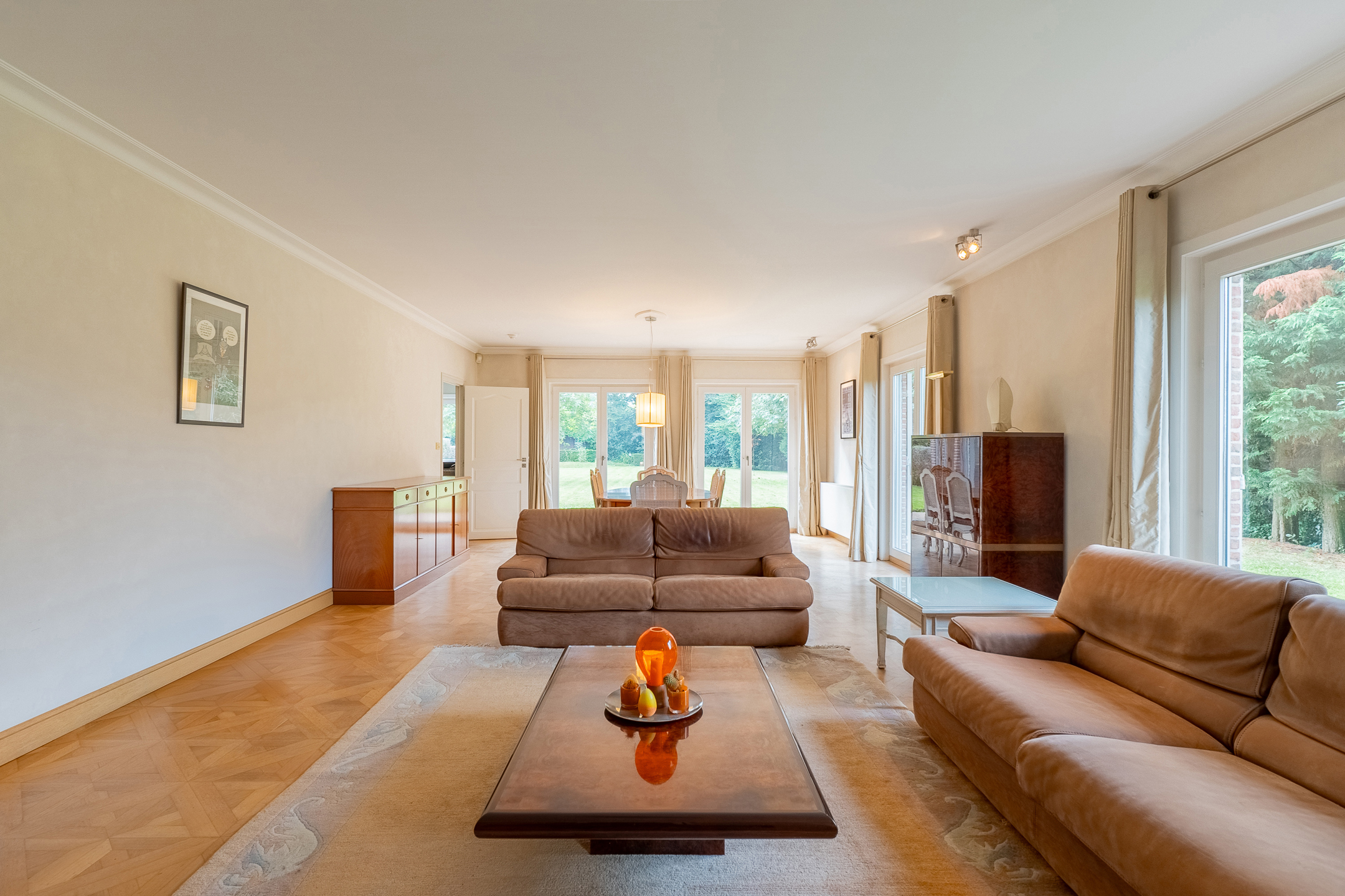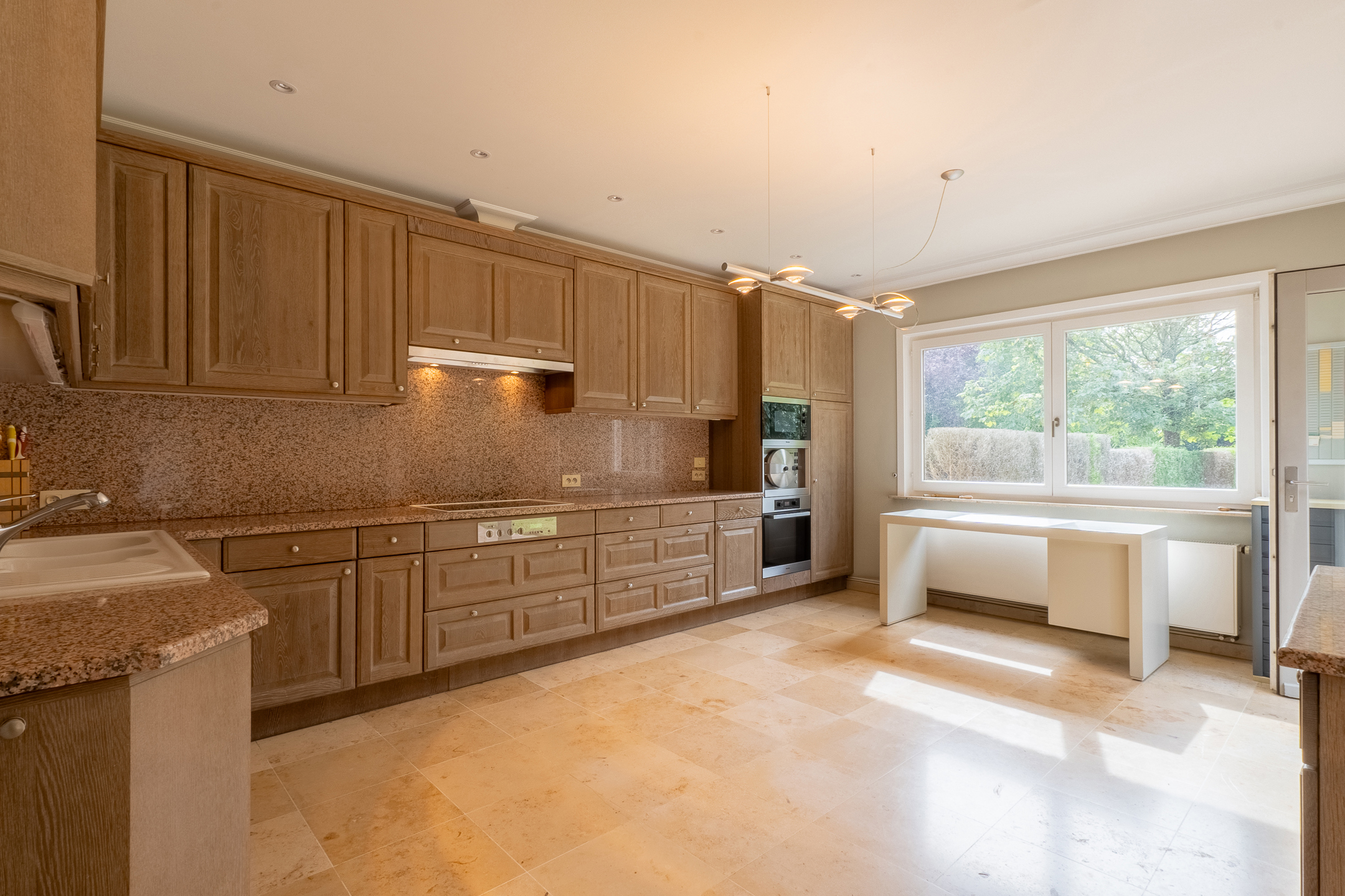 living van +/- 50M³ met zicht op tuin en volledig ingerichte kkn met Miele apparatuur, bijkeuken en garage voor 2 wagens (+wasruimte)